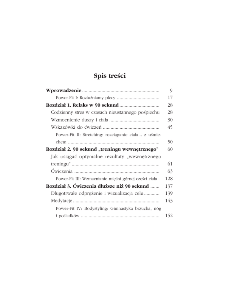 Spis treci Wprowadzenie ............................................................ Power-Fit I: Rozluniamy plecy ................................. Rozdzia³ 1. Relaks w 90 sekund ............................... Codzienny stres w czasach nieustannego popiechu Wzmocnienie duszy i cia³a ....................................... Wskazówki do æwiczeñ ............................................ 9 17 28 28 30 45 Power-Fit II: Stretching: rozci¹ganie cia³a... z umiechem ....................................................................... Rozdzia³ 2. 90 sekund treningu wewnêtrznego Jak osi¹gaæ optymalne rezultaty wewnêtrznego treningu .................................................................... Æwiczenia .................................................................. Power-Fit III: Wzmacnianie miêni górnej czêci cia³a . Rozdzia³ 3. Æwiczenia d³u¿sze ni¿ 90 sekund ....... D³ugotrwa³e odprê¿enie i wizualizacja celu ............ Medytacje ................................................................... 50 60 61 63 128 137 139 143 Power-Fit IV: Bodystyling: Gimnastyka brzucha, nóg i poladków ............................................................. 152 Rozdzia³ 4. 90 sekund, które mo¿esz dzieliæ z innymi ............................................... 157 Propozycje zabaw dla dwojga .................................. 158 Propozycje zabaw grupowych ................................. 167 Power-Fit V: Witalnoæ i wytrzyma³oæ dziêki æwiczeniom kondycyjnym .............................................. Rozdzia³ 5. Zdrowie i sprawnoæ poprzez ciszê: relaks dla ducha i cia³a ....................... Joga: ...w pokoju w³asnej ciszy... .......................... Twój indywidualny fitness-program ........................ 198 209 209 216