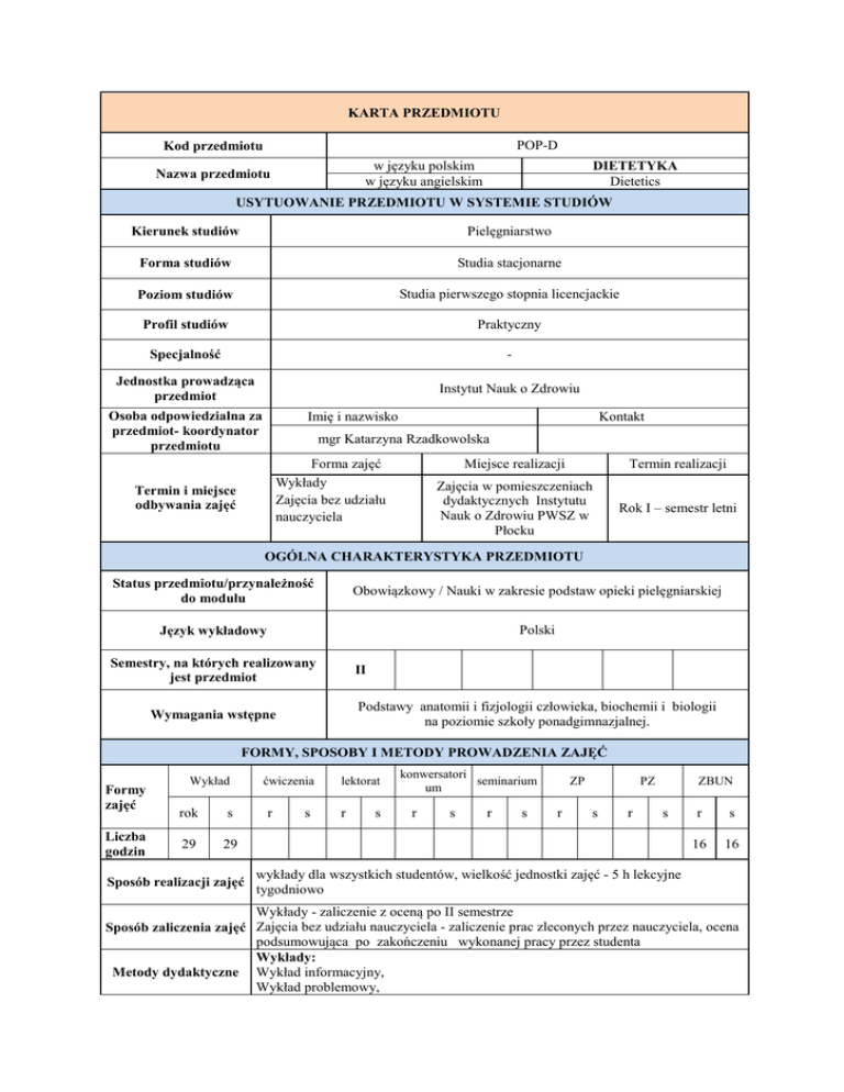 KARTA PRZEDMIOTU POP-D Kod przedmiotu w języku polskim w języku angielskim Nazwa przedmiotu DIETETYKA Dietetics USYTUOWANIE PRZEDMIOTU W SYSTEMIE STUDIÓW Kierunek studiów Pielęgniarstwo Forma studiów Studia stacjonarne Poziom studiów Studia pierwszego stopnia licencjackie Profil studiów Praktyczny Specjalność - Jednostka prowadząca przedmiot Instytut Nauk o Zdrowiu Osoba odpowiedzialna za przedmiot- koordynator przedmiotu Imię i nazwisko Kontakt mgr Katarzyna Rzadkowolska Forma zajęć Wykłady Zajęcia bez udziału nauczyciela Termin i miejsce odbywania zajęć Miejsce realizacji Termin realizacji Zajęcia w pomieszczeniach dydaktycznych Instytutu Nauk o Zdrowiu PWSZ w Płocku Rok I – semestr letni OGÓLNA CHARAKTERYSTYKA PRZEDMIOTU Status przedmiotu/przynależność do modułu Obowiązkowy / Nauki w zakresie podstaw opieki pielęgniarskiej Język wykładowy Polski Semestry, na których realizowany jest przedmiot II Podstawy anatomii i fizjologii człowieka, biochemii i biologii na poziomie szkoły ponadgimnazjalnej. Wymagania wstępne FORMY, SPOSOBY I METODY PROWADZENIA ZAJĘĆ Formy zajęć Liczba godzin Wykład rok s 29 29 Sposób realizacji zajęć ćwiczenia r s lektorat r s konwersatori seminarium um r s r s ZP r PZ s r ZBUN s r s 16 16 wykłady dla wszystkich studentów, wielkość jednostki zajęć - 5 h lekcyjne tygodniowo Wykłady - zaliczenie z oceną po II semestrze Sposób zaliczenia zajęć Zajęcia bez udziału nauczyciela - zaliczenie prac zleconych przez nauczyciela, ocena podsumowująca po zakończeniu wykonanej pracy przez studenta Wykłady: Metody dydaktyczne Wykład informacyjny, Wykład problemowy, Dyskusja dydaktyczna Zajęcia bez udziału nauczyciela: Studiowanie literatury, Prezentacja multimedialna, Dyskusja dydaktyczna. Przedmioty powiązane/moduł Promocja zdrowia, Zdrowie publiczne 1. Podstawowa Wykaz literatury Uzupełni ająca Ciborowska M., Rudnicka A.: Dietetyka. Żywienie zdrowego i chorego człowieka. PZWL, Warszawa 2010. 2. Bułhak-Jachymczyk B., Jarosz M.: Normy żywienia człowieka Podstawy prewencji otyłości i chorób niezakaźnych. PZWL, Warszawa 2008. 3. Szczygieł B.(red.), Niedożywienie związane z chorobą. Wydawnictwo Lekarskie PZWL, Warszawa 2011. 4. Jarosz M., Kłosiewicz-Latoszek L., Charzewska J., Białkowska M.: Diagnozowanie zaburzeń stanu odżywienia w praktyce lekarskiej i pielęgniarskiej. IŻiŻ, W-wa 2010. 5. Jarosz M.(red.), Zasady prawidłowego żywienia dzieci i młodzieży oraz wskazówki dotyczące zdrowego stylu życia. IŻiŻ, Warszawa 2008. 1.Matras P., Bartoszewska L., Rudzki S.: Leczenie żywieniowe. Procedury. Wydawnictwo Czelej, Lublin 2011 2. Iwanow K., Kunachowicz H., Nadolna I., Przygoda B.,Wartość odżywcza wybranych produktów spożywczych i typowych potraw. PZWL, Warszawa 2011 3.Przygoda B., Kunachowicz H., Nadolna I., Iwanow K.: Tabele składu i wartości odżywczej żywności. PZWL, Warszawa 2005 4.Artykuły w czasopismach naukowych CELE, TREŚCI I EFEKTY KSZTAŁCENIA Cele przedmiotu (ogólne, szczegółowe) Student: pozna zasady racjonalnego żywienia dzieci i dorosłych przy uwzględnieniu kompromisu fizjologicznego, kulturowego, psychologicznego, ekologicznego i finansowego, zasady żywienia dietetycznego w wybranych chorobach oraz rolę dietoprofilaktyki w przeciwdziałaniu tzw. chorobom cywilizacyjnym, Student : C 1zna fizjologiczne zapotrzebowanie dzieci, młodzieży, osób dorosłych, kobiet w ciąży i karmiących na energię i składniki odżywcze (białko, tłuszcze, węglowodany, składniki mineralne, witaminy, błonnik pokarmowy), C 2 omawia zasady leczenia żywienia (żywienie dojelitowe i pozajelitowe), jak również zasady żywienia w wybranych chorobach, C 3 posiada umiejętności rozpoznania i prowadzenia edukacji żywieniowej, C 4 rozumie zakres udziału pielęgniarki w leczeniu żywieniowym, C 5 umie opracować i przeprowadzić wywiad żywieniowy umożliwiający ocenę błędów w żywieniu, C 6 posiada umiejętności dokonania oceny stanu odżywienia z wykorzystaniem metod antropometrycznych i biochemicznych, C 7dostrzega indywidualizm pacjenta, C 8 wdraża zasady etyki zawodowej. Treści programowe Efekty kształcenia (kody) Forma zajęć POP-D_W01 W POP-D_W02 W Temat W 1 - Procesy energetyczne i gospodarka wodna w organizmie. Składniki odżywcze i ich znaczenie w organizmie. W 2 - Normy żywienia i wyżywienia. Zróżnicowanie diet dzieci i dorosłych. W 3 - Ilościowe i jakościowe błędy żywieniowe Polaków. W 4 - Zasady planowania i oceny żywienia różnych grup Suma liczby godzin Liczba godzin 3 3 6 2 3 5 POP-D_W03 W POP-D_U01 W POP-D_U02 Zbun POP-D_U03 W POP-D_U04 W Zbun POP-D_U05 W Zbun POP-D_K01 Zbun ludności. Zasady planowania i układania jadłospisów dla osób zdrowych. W 11 - Zasady edukacji żywieniowej. Udział pielęgniarki w leczeniu żywieniowym. W 10 - Leczenie żywieniowe – dojelitowe i parenteralne u dorosłych i dzieci. Monitorowanie chorego żywionego dojelitowe i parenteralne. 3 3 3 3 Zbun 3 - Żywienie dojelitowe w domu pacjenta. 5 5 W 5 - Zasady oceny stanu odżywienia. W 6 -Klasyfikacja i charakterystyka diet. 2 2 4 W 7 - Niedożywienie i jego zdrowotne następstwa. W 8 - Postępowanie dietetyczne jako część terapii. Zbun 1 - Opracowanie wywiadu żywieniowego umożliwiającego ocenę błędów w żywieniu pacjenta oraz postępowania dla określenia stanu odżywienia pacjenta. Ocena jadłospisów – jakościowa i ilościowa. W 9 - Żywienie człowieka w różnych stanach chorobowych (choroby układu krążenia, choroby metaboliczne, choroby przewodu pokarmowego, choroby układu moczowego, żywienie chorych ze zwiększonym katabolizmem). 2 2 10 6 4 Zbun 2 - Układanie, ocena i korygowanie ułożonych 5 jadłospisów dla osób zdrowych i chorych z cukrzycą, otyłością, nadciśnieniem, zaburzeniami gospodarki lipidowej, z chorobami przewodu pokarmowego, wątroby, trzustki, nerek. 9 Zajęcia bez udziału nauczyciela Efekty kształcenia 