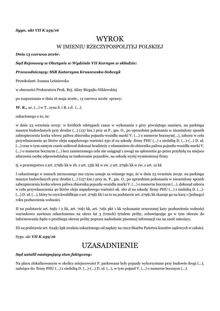 Sygn. akt VII K 259/16 WYROK W IMIENIU RZECZYPOSPOLITEJ POLSKIEJ Dnia 13 czerwca 2016r. Sąd Rejonowy w Olsztynie w Wydziale VII Karnym w składzie: Przewodniczący: SSR Katarzyna Kruszewska-Sobczyk Protokolant: Joanna Leśniewska w obecności Prokuratora Prok. Rej. Aliny Biegajło-Niklewskiej po rozpoznaniu w dniu 16 maja 2016r., 13 czerwca 2016r. sprawy: W. K., ur. (...) w T., syna S. i B. z d. (...), oskarżonego o to, że: w dniu 23 września 2015r. w krótkich odstępach czasu w wykonaniu z góry powziętego zamiaru, na parkingu maszyn budowlanych przy drodze (...) (137 km.) przy m.P., gm. O., po uprzednim pokonaniu w nieustalony sposób zabezpieczenia korka wlewu paliwa zbiornika pojazdu-wozidła marki V. (...) o numerze bocznym(...), zaboru w celu przywłaszczenia 40 litrów oleju napędowego wartości 250 zł na szkodę firmy PHU (...) z siedzibą D. (...)-(...) D. ul. (...) oraz w tym samym czasie usiłował dokonać kradzieży z włamaniem do zbiornika paliwa pojazdu-wozidła marki V. (...) o numerze bocznym (...) lecz zamierzonego celu nie osiągnął z uwagi na spłoszenie go przez przybyłą na miejsce zdarzenia osobę odpowiedzialną za tankowanie pojazdów, na szkodę wyżej wymienionej firmy tj. o przestępstwo z art. 279§1 kk w zb. z art. 13§1 kk w zw. z art. 279§1 kk w zw. z art. 12 kk I oskarżonego w ramach zarzucanego mu czynu uznaje za winnego tego, że w dniu 23 września 2015r. na parkingu maszyn budowlanych przy drodze (...) (137 km.) przy m. P., gm. O., po uprzednim pokonaniu w nieustalony sposób zabezpieczenia korka wlewu paliwa zbiornika pojazdu-wozidła marki V. (...) o numerze bocznym (...), dokonał zaboru w celu przywłaszczenia 40 litrów oleju napędowego wartości ok. 160 zł na szkodę firmy PHU (...) z siedzibą D. (...)(...) D. ul. (...), który to czyn kwalifikuje z art. 279§1 kk i za to na podstawie art. 279§1 kk skazuje go na karę 1 (jednego) roku pozbawienia wolności, II na podstawie art. 69§1 i 2 kk, art. 70§1 kk, art. 72§1 pkt 1 kk wykonanie orzeczonej kary pozbawienia wolności warunkowo zawiesza oskarżonemu na okres lat 3 (trzech) tytułem próby, zobowiązując go w tym okresie do informowania Sądu o przebiegu okresu próby poprzez nadesłanie pisemnej informacji raz na sześć miesięcy, III na podstawie art. 624§1 kpk zwalnia oskarżonego od zapłaty na rzecz Skarbu Państwa kosztów sądowych w całości. Sygn. akt VII K 259/16 UZASADNIENIE Sąd ustalił następujący stan faktyczny: Na placu zlokalizowanym w okolicy miejscowości P. parkowane były pojazdy wykorzystane przy budowie drogi (...), należące do firmy PHU (...) z siedzibą D. (...)-(...) D. ul. (...), w tym pojazd V. (...) o numerze bocznym (...). Operator pojazdu po wykonaniu zleconych mu robót drogowych tankował używaną przez siebie maszynę i pozostawiał ją na wskazanym parkingu. Do jego obowiązków należało zabezpieczenie korka wlewu paliwa i jego zamknięcie. W części pojazdów korek był wyposażony w zamek, a w innych chroniony był kłódką. Kluczyk do wlewu paliwa pozostawał w dyspozycji operatora sprzętu. Kluczyk do korka wlewu paliwa wozidła V. (...) posiadał S. A.. Każdego dnia po zatankowaniu pojazdów, D. C. sprawdzał czy operatorzy maszyn zamknęli zbiorniki paliwa. Nie zaobserwował on by wlewy do paliwa pozostawione były otwarte lub miały zniszczone czy też uszkodzone kłódki. W przypadku dostrzeżenia jakichkolwiek uchybień, zobowiązany był on dokonać zabezpieczenia wlewu paliwa. Pojazdy budowlane wyposażone były w system (...) wskazujący ubytek paliwa ze zbiornika. W dniu 23 września 2015 roku w godzinach wieczornych W. K., który wówczas pracował jako dozorca na placu budowy przy drodze (...), w nieustalony sposób pokonał zabezpieczenie wlewu paliwa – zamek zamontowany w korku i za pomocą gumowego węża przelał ze zbiornika pojazdu – wozidła V. (...) olej napędowy w ilości 40 litrów o wartości około 160 zł do dwóch kanistrów o pojemności 10 litrów i jednego o objętości 20 litrów. Następnie wskazane plastikowe pojemniki umieścił w bagażniku swojego samochodu. Około godziny 21:40 S. B. otrzymał wiadomość tekstową - SMS zawierający powiadomienie z sytemu (...) o nagłym ubytku paliwa w ilości 20 litrów z pojazdu V. (...). Skontaktował się on z operatorem sprzętu S. A., który jednak nie mógł udać się na parking. Po dwudziestu minutach przyszło następne powiadomienie o ubytku kolejnych 20 litrów paliwa. W związku z powyższym S. B. telefonicznie poprosił D. C. o sprawdzenie tych informacji. Wskazany po przybyciu na miejsce zdarzenia zastał tam dwóch pracowników ochrony – B. K. i W. K. stojących przy maszynach budowlanych. Następnie na miejsce wezwana została Policja. Przybyli funkcjonariusze wylegitymowali obecne osoby, dokonali oględzin miejsca zdarzenia i pojazdów. Znaleźli w pobliżu pojazdu V. (...) korek od wlewu paliwa i puste kanistry. Po sprawdzeniu zaś pojazdu należącego do W. K. w bagażniku auta znaleziono 3 kanistry z zawartością oleju napędowego, gumowy wąż, ubłocone buty, których podeszwa miała bieżnik tożsamy ze śladami obuwia ujawnionymi w pobliżu sprzętu V. (...). Wówczas W. K. oświadczył obecnym, że ściągnął 40 litrów oleju napędowego z jednego zbiornika. Po przeprowadzeniu oględzin pojemników, olej napędowy przekazano D. C.. Powyższy stan faktyczny, Sąd ustalił w oparciu o następujące dowody: zeznania S. B. k. 18v-19, D. C. k. 19-19v, 15, S. A. k. 40, J. P. k.19v, D. K. k. 39-40, częściowo wyjaśnienia W. K. k. 32-32v zbioru A, k. 17v-18, protokół oględzin miejsca i rzeczy k.6-7 zbioru A, protokół zatrzymania rzeczy k. 2-4 zbioru A, protokół oględzin rzeczy k. 21-24. Oskarżony W. K. w toku postępowania przygotowawczego przyznał się do dokonania kradzieży paliwa w ilości 40 litrów. Wyjaśnił, iż jest rencistą i dorabia jako stróż. W dniu 23 września stróżował pilnując pojazdów b