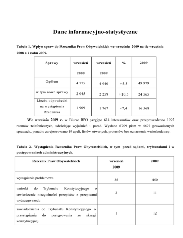 Dane informacyjno-statystyczne Tabela 1. Wpływ spraw do Rzecznika Praw Obywatelskich we wrześniu 2009 na tle września 2008 r. i roku 2009. Sprawy wrzesień wrzesień % 2009 2008 2009 Ogółem 4 775 4 940 +3,5 49 979 w tym nowe sprawy 2 045 2 259 +10,5 24 565 1 909 1 767 -7,4 16 568 Liczba odpowiedzi na wystąpienia Rzecznika We wrześniu 2009 r. w Biurze RPO przyjęto 614 interesantów oraz przeprowadzono 1995 rozmów telefonicznych, udzielając wyjaśnień i porad. Wysłano 6709 pism w 4697 prowadzonych sprawach, ponadto zarejestrowano 19 apeli, listów otwartych, protestów bez oznaczenia wnioskodawcy. Tabela 2. Wystąpienia Rzecznika Praw Obywatelskich, w tym przed sądami, trybunałami i w postępowaniach administracyjnych. Rzecznik Praw Obywatelskich wrzesień 2009 2009 wystąpienia problemowe wnioski do Trybunału Konstytucyjnego 35 450 2 11 1 12 o stwierdzenie niezgodności przepisów z przepisami wyższego rzędu zawiadomienia do Trybunału Konstytucyjnego o przystąpieniu konstytucyjnej do postępowania ze skargi pytania prawne do Sądu Najwyższego kasacje w sprawach karnych skarg kasacyjnych do Sądu Najwyższego kasacyjnych do Sądu Najwyższego kasacyjne do Naczelnego 3 26 - 1 - 1 - 2 1 6 - 11 - 1 1 5 1 2 44 532 w sprawach pracy skargi 4 w sprawach cywilnych skarg - Sądu Administracyjnego wnioski do Naczelnego Sądu Administracyjnego o wykładnię przepisów skargi do wojewódzkich sądów administracyjnych wnioski o unieważnienie orzeczenia przystąpienia do postępowania sądowego przystąpienia do postępowania administracyjnego łącznie Tabela 3. Sprawy rozpatrzone we wrześniu 2009 r. Sposób rozpatrzenia sprawy podjęto do prowadzenia * w tym, w ramach wystąpienia o charakterze W liczbach % rozpatrzonych bezwzględnych spraw 1055 34,5 45 1,5 generalnym *) Pojęcie "sprawy podjętej do prowadzenia" dotyczy spraw wskazujących na możliwe istnienie naruszenia praw obywatelskich, w sprawach tych Rzecznik prowadzi postępowanie wyjaśniające (art. 8 ustawy o Rzeczniku Praw Obywatelskich). udzielono wyjaśnień, wskazano wnioskodawcy 1665 54,4 przekazano wniosek wg. właściwości 41 1,3 zwrócono się do wnioskodawcy o uzupełnienie wniosku 245 8,0 nie podjęto ** 54 1,8 3060 100 przysługujące mu środki działania łącznie Sposób rozpatrzenia spraw we wrześniu 2009 r. 11,1% 34,5% 54,4% podjęto do prowadzenia udzielono wyjaśnień, wskazano wnioskodawcy przysługujące środki działania inne*** Tabela 4. Postępowania zakończone we wrześniu 2009 r. Efekt zakończenia postępowania W liczbach bezwzględnych % zakończonych postępowań uzyskano rozwiązanie oczekiwane przez 126 13,5 zasadność zarzutów wnioskodawcy 72 7,7 uwzględnienie wystąpienia generalnego RPO 54 5,8 odstąpiono od dalszego prowadzenia sprawy 98 10,5 30 3,2 68 7,3 wnioskodawcę ze względu na: ze względu na: toczące się w sprawie postępowanie (niewyczerpany tryb) rezygnację RPO z dalszego prowadzenia sprawy z przyczyn obiektywnych **) Przekazane Rzecznikowi do wiadomości wystąpienia kierowane do innych organów, pisma anonimowe i niezrozumiałej treści. ***) Pod pozycją „inne” znajdują się sprawy, w których: przekazano wniosek wg. właściwości, zwrócono się do wnioskodawcy o uzupełnienie wniosku oraz nie podjęto działań. nie uzyskano rozwiązania oczekiwanego przez 709 76,0 niepotwierdzenie się zarzutów wnioskodawcy 684 73,3 nieuwzględnienie wystąpienia generalnego RPO 23 2,5 2 0,2 933 100 wnioskodawcę ze względu na: z powodu wyczerpania przez RPO możliwości działania łącznie Zakończenie spraw podjętych uzyskano rozwiązanie oczekiwane przez wnioskodawcę 13,5% 10,5% odstąpiono od dalszego prowadzenia sprawy nie uzyskano rozwiązania oczekiwanego przez wnioskodawcę 76,0% Tabela 5. Przedmiot nowych spraw (wniosków) przedłożonych Rzecznikowi Praw Obywatelskich we wrześniu 2009 r. Przedmiot sprawy (wniosku) W liczbach W ujęciu bezwzględnych % prawo konstytucyjne i międzynarodowe 162 7,2 prawo karne 459 20,3 prawo pracy i zabezpieczenie społeczne 321 14,2 prawo cywilne i gospodarka nieruchomościami 308 13,6 prawo administracyjne i sprawy mieszkaniowe 242 10,7 prawo gospodarcze, daniny publiczne i 208 9,2 ochrona praw konsumenta prawo karne wykonawcze 242 10,7 prawa żołnierzy i funkcjonariuszy służb publicznych 65 2,9 administracja publiczna, zdrowie i ochrona praw cudzoziemców 216 9,6 sprawy nieklasyfikowalne 36 1,6 2259 100 łącznie Zakres spraw nowych dominujących we wrześniu 2009 r. 25% 20,3% 20% 15% 14,2% 13,6% 10,7% 10,7% 10% 5% 0% prawo karne prawo pracy i zabezpieczenie społeczne prawo cywilne i gospodarka nieruchomościami prawo administracyjne i sprawy mieszkaniowe prawo karne wykonawcze W Biurze Rzecznika Praw Obywatelskich działają trzy Zespoły Terenowe: we Wrocławiu (dla województw dolnośląskiego, lubuskiego i opolskiego), w Gdańsku (dla województw pomorskiego, zachodniopomorskiego i warmińsko – mazurskiego) i w Katowicach (dla województw śląskiego, małopolskiego i świętokrzyskiego), kierowane przez Pełnomocników terenowych Rzecznika Praw Obywatelskich. We wrześniu 2009 r. do Zespołów Terenowych wpłynęło 479 pism, z czego 19 pism przekazano, zgodnie z właściwością, do Biura w Warszawie, a 46 pism przyjęto z Biura w Warszawie. Nowych spraw wpłynęło 279. Z ogólnej liczby 614 interesantów w Zespołach Terenowych przyjęto 321. Przeprowadzono 544 rozmowy telefoniczne udzielając wyjaśnień i porad. Rozpatrzono 298 spraw. Tabela 6. Sprawy rozpatrzone we wrześniu 2009 r. w Zespołach Terenowych. Sposób rozpatrzenia sprawy W liczbach % bezwzględnych rozpatrzonych spraw podjęto do prowadzenia * 89 29,9 udzielono wyjaśnień, wskazano wnioskodawcy 192 64,4 przekazano wniosek wg. właściwości 3 1,0 zwrócono się do wnioskodawcy o uzupełnienie wniosku 14 4,7 łącznie 298 100 przysługujące mu środki działania Tabela 7. Przedmiot najważniejszych nowych spraw (wniosków) przedłożon