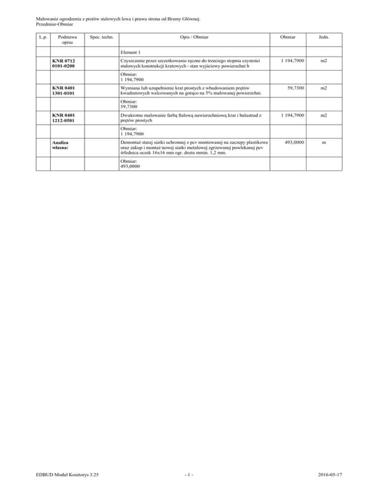 Malowanie ogrodzenia z pretów stalowych lewa i prawa strona od Bramy Głównej. Przedmiar-Obmiar L.p. Podstawa opisu Spec. techn. Opis / Obmiar Obmiar Jedn. Element 1 KNR 0712 0101-0200 Czyszczenie przez szczotkowanie ręczne do trzeciego stopnia czystości stalowych konstrukcji kratowych - stan wyjściowy powierzchni b 1 194,7900 m2 59,7300 m2 1 194,7900 m2 493,0000 m Obmiar: 1 194,7900 KNR 0401 1301-0101 Wymiana lub uzupełnienie krat prostych z wbudowaniem prętów kwadratowych walcowanych na gorąco na 5% malowanej powierzchni. Obmiar: 59,7300 KNR 0401 1212-0501 Dwukrotne malowanie farbą ftalową nawierzchniową krat i balustrad z prętów prostych Obmiar: 1 194,7900 Analiza własna: Demontaż starej siatki ochronnej z pcv montowanej na zaczepy plastikowe oraz zakup i montaż nowej siatki metalowej zgrzewanej powlekanej pcv śrfednica oczek 16x16 mm ogr. drutu mmin. 1,2 mm. Obmiar: 493,0000 EDBUD Moduł Kosztorys 3.25 -1- 2016-05-17