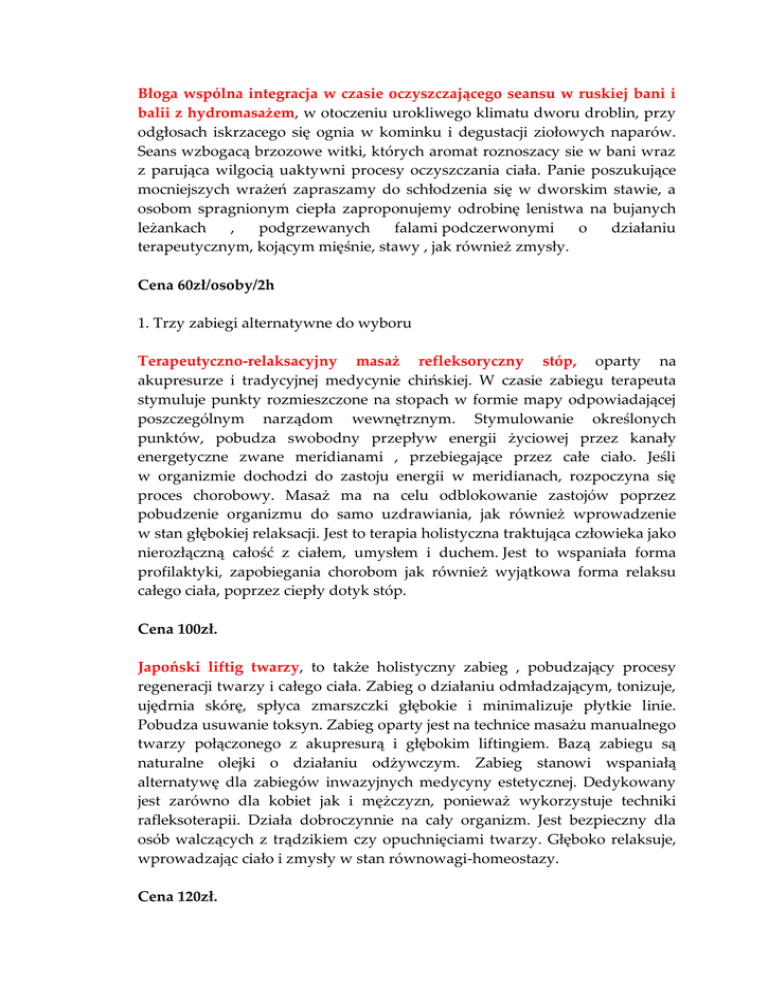 Błoga wspólna integracja w czasie oczyszczającego seansu w ruskiej bani i balii z hydromasażem, w otoczeniu urokliwego klimatu dworu droblin, przy odgłosach iskrzacego się ognia w kominku i degustacji ziołowych naparów. Seans wzbogacą brzozowe witki, których aromat roznoszacy sie w bani wraz z parująca wilgocią uaktywni procesy oczyszczania ciała. Panie poszukujące mocniejszych wrażeń zapraszamy do schłodzenia się w dworskim stawie, a osobom spragnionym ciepła zaproponujemy odrobinę lenistwa na bujanych leżankach , podgrzewanych falami podczerwonymi o działaniu terapeutycznym, kojącym mięśnie, stawy , jak również zmysły. Cena 60zł/osoby/2h 1. Trzy zabiegi alternatywne do wyboru Terapeutyczno-relaksacyjny masaż refleksoryczny stóp, oparty na akupresurze i tradycyjnej medycynie chińskiej. W czasie zabiegu terapeuta stymuluje punkty rozmieszczone na stopach w formie mapy odpowiadającej poszczególnym narządom wewnętrznym. Stymulowanie określonych punktów, pobudza swobodny przepływ energii życiowej przez kanały energetyczne zwane meridianami , przebiegające przez całe ciało. Jeśli w organizmie dochodzi do zastoju energii w meridianach, rozpoczyna się proces chorobowy. Masaż ma na celu odblokowanie zastojów poprzez pobudzenie organizmu do samo uzdrawiania, jak również wprowadzenie w stan głębokiej relaksacji. Jest to terapia holistyczna traktująca człowieka jako nierozłączną całość z ciałem, umysłem i duchem. Jest to wspaniała forma profilaktyki, zapobiegania chorobom jak również wyjątkowa forma relaksu całego ciała, poprzez ciepły dotyk stóp. Cena 100zł. Japoński liftig twarzy, to także holistyczny zabieg , pobudzający procesy regeneracji twarzy i całego ciała. Zabieg o działaniu odmładzającym, tonizuje, ujędrnia skórę, spłyca zmarszczki głębokie i minimalizuje płytkie linie. Pobudza usuwanie toksyn. Zabieg oparty jest na technice masażu manualnego twarzy połączonego z akupresurą i głębokim liftingiem. Bazą zabiegu są naturalne olejki o działaniu odżywczym. Zabieg stanowi wspaniałą alternatywę dla zabiegów inwazyjnych medycyny estetycznej. Dedykowany jest zarówno dla kobiet jak i mężczyzn, ponieważ wykorzystuje techniki rafleksoterapii. Działa dobroczynnie na cały organizm. Jest bezpieczny dla osób walczących z trądzikiem czy opuchnięciami twarzy. Głęboko relaksuje, wprowadzając ciało i zmysły w stan równowagi-homeostazy. Cena 120zł. Magia dotyku - harmonia od stóp do głów Wyjątkowo delikatny, odprężający masaż ciała przywracający równowagę, jakże często wytrąconego codziennym stresem organizmu. Masaż na bazie ciepłych, cudownie aromatycznych kompozycji olejowych, łączy nieocenioną dla zmysłów aromaterapię z rozluźniającą spięcia techniką zabiegu. Cena 140zł - całe ciało lub 90 zł plecy.