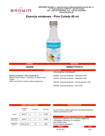 Esencja smakowa - Pina Colada 40 ml SYMBOL KOD EAN 404550 5908277707613 CHARAKTERYSTYKA Inne produkty z tej kategorii: Esencja smakowa - Pina Colada 40 ml Bardzo smaczny likier z wyraźnym aromatem Pina Colady Skład: aromat Pina Colada, glikol propylenowy 404540 - Esencja smakowa - Wiśniówka 40ml 404410 - Esencja smakowa - Czekolada 40ml 404430 - Esencja smakowa - Gorzka staropol. 40ml 404480 - Esencja smakowa - Rum 40ml DANE LOGISTYCZNE Sztuka PRZEZNACZENIE szer/gł/wys [cm] Ilość sztuk waga [kg] 3x3x11 1 0,052 Opakowanie jednostkowe 3x3x11 1 0,052 Opakowanie zbiorcze 10,5x13x12 12 0,66 Do 4L 40-45% czystej wódki wlać zawartość buteleczki. Całość pozostawić na 24h INFORMACJE DODATKOWE Pojemność buteleczki: 40 ml. Zawiera wgłębienia pozwalające odmierzyć 10 ml esencji. Nie zawiera cukru. Przed użyciem wstrząsnąć PKWiU VAT 20.53.10.0 23%