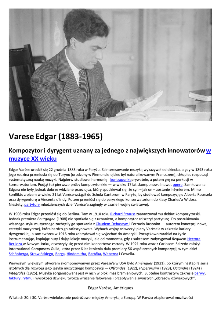 Varese Edgar (1883-1965) Kompozytor i dyrygent uznany za jednego z największych innowatorów w muzyce XX wieku Edgar Varèse urodził się 22 grudnia 1883 roku w Paryżu. Zainteresowanie muzyką wykazywał od dziecka, a gdy w 1893 roku jego rodzina przeniosła się do Turynu (urodzony w Piemoncie ojciec był naturalizowanym Francuzem), chłopiec rozpoczął systematyczną naukę muzyki. Najpierw studiował harmonię i kontrapunkt prywatnie, a potem grę na perkusji w konserwatorium. Podjął też pierwsze próby kompozytorskie — w wieku 17 lat skomponował nawet operę. Zamiłowania Edgara nie były jednak dobrze widziane przez ojca, który spodziewał się, że syn – jak on – zostanie inżynierem. Mimo konfliktu z ojcem w wieku 21 lat Varèse wstąpił do Schola Cantorum w Paryżu, by studiować kompozycję u Alberta Roussela oraz dyrygenturę u Vincenta d'Indy. Potem przeniósł się do paryskiego konserwatorium do klasy Charles’a Widora. Niestety, partytury młodzieńczych dzieł Varèse‘a zaginęły w czasie I wojny światowej. W 1908 roku Edgar przeniósł się do Berlina. Tam w 1910 roku Richard Strauss zaaranżował mu debiut kompozytorski. Jednak premiera Bourgogne (1908) nie spotkała się z uznaniem, a kompozytor zniszczył partyturę. Do poszukiwania własnego stylu muzycznego zachęciły go spotkania z Claudem Debussym i Ferrucio Busonim — autorem koncepcji nowej estetyki muzycznej, która bardzo go zafascynowała. Wybuch wojny zniweczył plany Varèse'a w zakresie kariery dyrygenckiej, a sam twórca w 1915 roku zdecydował się wyjechać do Ameryki. Początkowo zarabiał na życie instrumentując, kopiując nuty i dając lekcje muzyki, ale od momentu, gdy z sukcesem zadyrygował Requiem Hectora Berlioza w Nowym Jorku, otworzyły się przed nim koncertowe estrady. W 1921 roku wraz z Carlosem Salzedo założył International Composers Guild, która przez 6 lat istnienia dała premiery 56 współczesnych kompozycji, w tym dzieł Schönberga, Strawińskiego, Berga, Hindemitha, Bartóka, Weberna i Cowella. Pierwszym większym utworem skomponowanym przez Varèse'a w USA było Amériques (1921), po którym nastąpiła seria istotnych dla rozwoju jego języka muzycznego kompozycji — Offrandes (1922), Hyperprisim (1923), Octandre (1924) i Intégrales (1925). Muzyka zorganizowana jest w nich w bloki mas brzmieniowych. Subtelne kontrasty w zakresie barwy, faktury, rytmu i wysokości dźwięku tworzą wrażenie falowania i przepływania swoistych „obrazów dźwiękowych”. Edgar Varèse, Amériques W latach 20. i 30. Varèse wielokrotnie podróżował między Ameryką a Europą. W Paryżu eksplorował możliwości brzmieniowe instrumentów takich jak fale Martenota czy theremin, wykorzystany w Equatorial z 1932 roku. W Ionisation (1931) zademonstrował z kolei nieznane wcześniej możliwości operowania orkiestrowym zespołem instrumentów perkusyjnych. Varèse marzył o „wyzwoleniu dźwięku” z ograniczeń skali, stroju równomiernie temperowanego, o oderwaniu muzyki od dotychczasowych zasad rządzących jej strukturą. Bezskutecznie starał się zrealizować pomysł zbudowania nowego, uniwersalnego instrumentu muzycznego. Szukał wsparcia w Guggenheim Foundation i w Bell Telephone Company, próbował swą ideą zainteresować producentów filmowych. Brak sukcesu doprowadzał go do frustracji — w pierwszej połowie lat 40. przestał komponować, a w 1943 roku założył New York Chorus, z którym wykonywał muzykę barokową i renesansową, odwołując się do rozbudzonych jeszcze na studiach zainteresowań muzyką dawną. Największy sukces i sławę osiągnął Varèse dzięki Poème électronique — dziełu zamówionym na Wystawę Światową w Brukseli w 1958 roku. Zaprezentowany w zaprojektowanym przez Le Corbusiera pawilonie Philipsa utwór na taśmę wypełnił pomieszczenie niezwykłym brzmieniem z ponad 400 głośników, tworząc realistyczne poczucie przestrzenności muzyki. Ostatnim utworem Varèse’a okazał się Nocturnal z 1961 roku. Kompozytor planował jeszcze napisanie wokalnoinstrumentalnego dzieła pt. Nuit, jednak jego ukończenie uniemożliwiła mu choroba. Zmarł 6 listopada 1965 roku w nowojorskim szpitalu, w wyniku pooperacyjnego zakażenia. Jego ciało zostało — zgodnie z ostatnią wolą — skremowane, a prochy rozsypane. dr hab. Iwona Lindstedt Ciekawostki Ogromnie zafascynowany muzyką Varèse'a był Frank Zappa — ikona ekscentrycznego rocka i jazzu. Z religijną niemal obsesją słuchał perkusyjnych Jonizacji, co doprowadziło go do odkrycia innych modernistycznych kompozytorów i stylów. Niektóre nieukończone lub pozostające w szkicach dzieła do obiegu artystycznego włączył opiekun spuścizny Varèse'a — Chou Wen-Chung. Tak stało się np. z Etude pour Espace (1947) na chór, 2 fortepiany i perkusję. Kompozycja ta była studium do Espace, koncepcji swoistego „przestrzennego montażu dźwiękowego”, który miał być transmitowany jednocześnie z wielu miejsc na ziemi i następnie resyntetyzowany. Zobacz rysunek Andrzeja Wieteszki o Edgarze Varese.