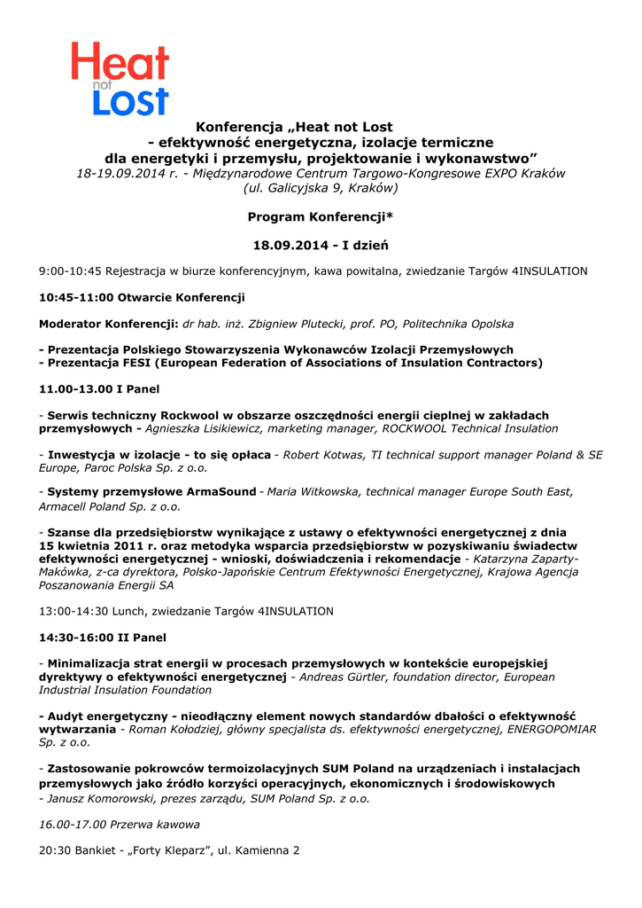 Konferencja „Heat not Lost - efektywność energetyczna, izolacje termiczne dla energetyki i przemysłu, projektowanie i wykonawstwo” 18-19.09.2014 r. - Międzynarodowe Centrum Targowo-Kongresowe EXPO Kraków (ul. Galicyjska 9, Kraków) Program Konferencji* 18.09.2014 - I dzień 9:00-10:45 Rejestracja w biurze konferencyjnym, kawa powitalna, zwiedzanie Targów 4INSULATION 10:45-11:00 Otwarcie Konferencji Moderator Konferencji: dr hab. inż. Zbigniew Plutecki, prof. PO, Politechnika Opolska - Prezentacja Polskiego Stowarzyszenia Wykonawców Izolacji Przemysłowych - Prezentacja FESI (European Federation of Associations of Insulation Contractors) 11.00-13.00 I Panel - Serwis techniczny Rockwool w obszarze oszczędności energii cieplnej w zakładach przemysłowych - Agnieszka Lisikiewicz, marketing manager, ROCKWOOL Technical Insulation - Inwestycja w izolacje - to się opłaca - Robert Kotwas, TI technical support manager Poland & SE Europe, Paroc Polska Sp. z o.o. - Systemy przemysłowe ArmaSound - Maria Witkowska, technical manager Europe South East, Armacell Poland Sp. z o.o. - Szanse dla przedsiębiorstw wynikające z ustawy o efektywności energetycznej z dnia 15 kwietnia 2011 r. oraz metodyka wsparcia przedsiębiorstw w pozyskiwaniu świadectw efektywności energetycznej - wnioski, doświadczenia i rekomendacje - Katarzyna ZapartyMakówka, z-ca dyrektora, Polsko-Japońskie Centrum Efektywności Energetycznej, Krajowa Agencja Poszanowania Energii SA 13:00-14:30 Lunch, zwiedzanie Targów 4INSULATION 14:30-16:00 II Panel - Minimalizacja strat energii w procesach przemysłowych w kontekście europejskiej dyrektywy o efektywności energetycznej - Andreas Gürtler, foundation director, European Industrial Insulation Foundation - Audyt energetyczny - nieodłączny element nowych standardów dbałości o efektywność wytwarzania - Roman Kołodziej, główny specjalista ds. efektywności energetycznej, ENERGOPOMIAR Sp. z o.o. - Zastosowanie pokrowców termoizolacyjnych SUM Poland na urządzeniach i instalacjach przemysłowych jako źródło korzyści operacyjnych, ekonomicznych i środowiskowych - Janusz Komorowski, prezes zarządu, SUM Poland Sp. z o.o. 16.00-17.00 Przerwa kawowa 20:30 Bankiet - „Forty Kleparz”, ul. Kamienna 2 19.09.2014 - II dzień 9:00-10:00 Kawa powitalna / zwiedzanie Targów 4INSULATION 10:00-12:30 III Panel - Prezentacja normy PN-B-20105 - izolacja cieplna wyposażenia budynków i instalacji przemysłowych. Wymagania dotyczące projektowania, wykonania i odbioru robót - Paweł Gajewski, prezes zarządu, Polskie Stowarzyszenie Wykonawców Izolacji Przemysłowych - Ekonomiczna izolacja - niedoceniany sprzymierzeniec - Mirosław Chodzikiewicz, dyrektor ds. technicznych, Dariusz Dziwiński, specjalista w dziale handlowym, KAEFER SA - Bamex Sp. z o.o. producent włókniny szklanej i innych materiałów izolacyjnych - Kinga Żelechowska, prezes zarządu, Bamex Sp. z o.o. - Płaskie wyroby do izolacji cieplnej instalacji przemysłowych - wymagania norm europejskich w zakresie deklaracji współczynnika przewodzenia ciepła - dr Artur Miros, kierownik Centrum Badawczego Materiałów Budowlanych „Izolacja”, Instytut Budownictwa i Górnictwa Skalnego - O. Katowice Podsumowanie Konferencji, dyskusja 12:30 Lunch, zwiedzanie Targów 4INSULATION *Organizator zastrzega sobie możliwość zmian w programie www.nowa-energia.com.pl