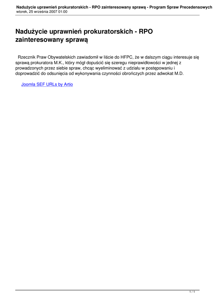 Nadużycie uprawnień prokuratorskich - RPO zainteresowany sprawą - Program Spraw Precedensowych wtorek, 25 września 2007 01:00 Nadużycie uprawnień prokuratorskich - RPO zainteresowany sprawą Rzecznik Praw Obywatelskich zawiadomił w liście do HFPC, że w dalszym ciągu interesuje się sprawą prokuratora M.K., który mógł dopuścić się szeregu nieprawidłowości w jednej z prowadzonych przez siebie spraw, chcąc wyeliminować z udziału w postępowaniu i doprowadzić do odsunięcia od wykonywania czynności obrończych przez adwokat M.D. Joomla SEF URLs by Artio 1/1