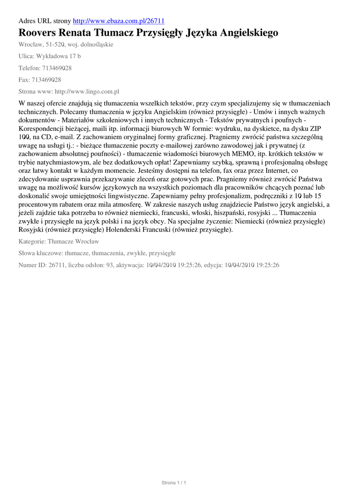 Adres URL strony http://www.ebaza.com.pl/26711 Roovers Renata Tłumacz Przysięgły Języka Angielskiego Wrocław, 51-520, woj. dolnośląskie Ulica: Wykładowa 17 b Telefon: 713469028 Fax: 713469028 Strona www: http://www.lingo.com.pl W naszej ofercie znajdują się tłumaczenia wszelkich tekstów, przy czym specjalizujemy się w tłumaczeniach technicznych. Polecamy tłumaczenia w języku Angielskim (również przysięgłe) - Umów i innych ważnych dokumentów - Materiałów szkoleniowych i innych technicznych - Tekstów prywatnych i poufnych Korespondencji bieżącej, maili itp. informacji biurowych W formie: wydruku, na dyskietce, na dysku ZIP 100, na CD, e-mail. Z zachowaniem oryginalnej formy graficznej. Pragniemy zwrócić państwa szczególną uwagę na usługi tj.: - bieżące tłumaczenie poczty e-mailowej zarówno zawodowej jak i prywatnej (z zachowaniem absolutnej poufności) - tłumaczenie wiadomości biurowych MEMO, itp. krótkich tekstów w trybie natychmiastowym, ale bez dodatkowych opłat! Zapewniamy szybką, sprawną i profesjonalną obsługę oraz łatwy kontakt w każdym momencie. Jesteśmy dostępni na telefon, fax oraz przez Internet, co zdecydowanie usprawnia przekazywanie zleceń oraz gotowych prac. Pragniemy również zwrócić Państwa uwagę na możliwość kursów językowych na wszystkich poziomach dla pracowników chcących poznać lub doskonalić swoje umiejętności lingwistyczne. Zapewniamy pełny profesjonalizm, podręczniki z 10 lub 15 procentowym rabatem oraz mila atmosferę. W zakresie naszych usług znajdziecie Państwo język angielski, a jeżeli zajdzie taka potrzeba to również niemiecki, francuski, włoski, hiszpański, rosyjski ... Tłumaczenia zwykłe i przysięgłe na język polski i na język obcy. Na specjalne życzenie: Niemiecki (również przysięgłe) Rosyjski (również przysięgłe) Holenderski Francuski (również przysięgłe). Kategorie: Tłumacze Wrocław Słowa kluczowe: tłumacze, tłumaczenia, zwykłe, przysięgłe Numer ID: 26711, liczba odsłon: 93, aktywacja: 10/04/2010 19:25:26, edycja: 10/04/2010 19:25:26 Strona 1 / 1