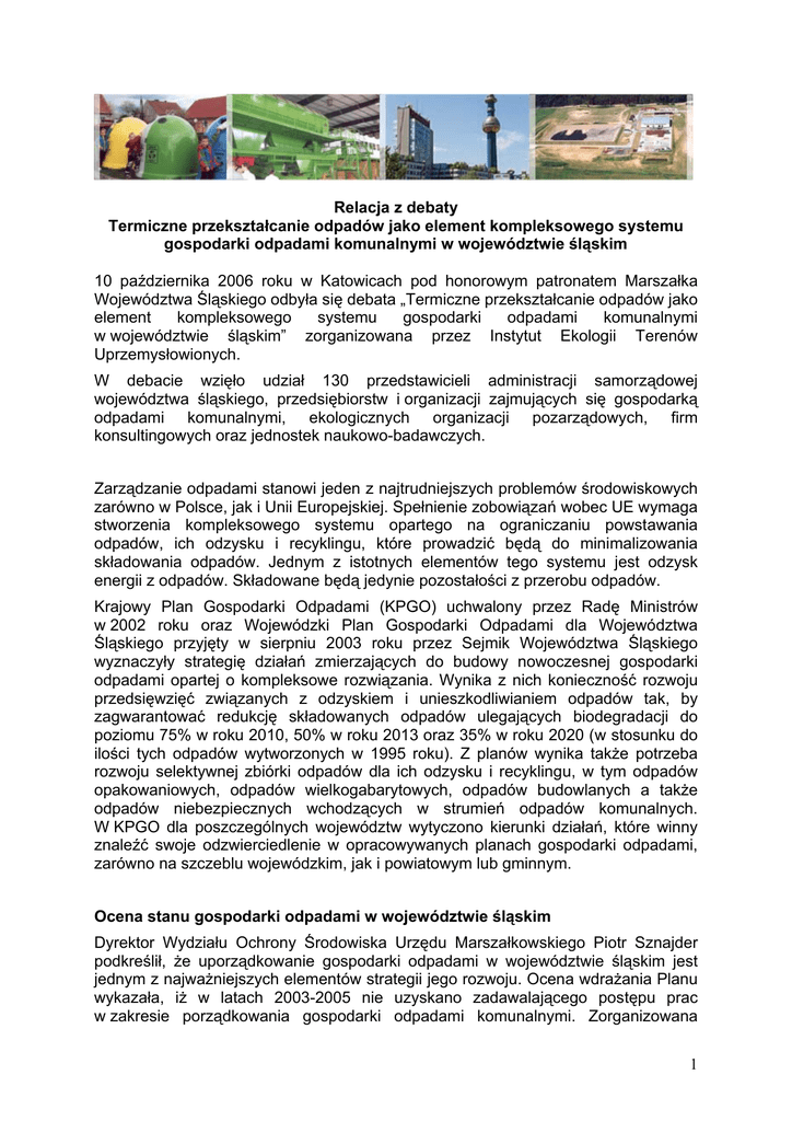 Relacja z debaty Termiczne przekształcanie odpadów jako element kompleksowego systemu gospodarki odpadami komunalnymi w województwie śląskim 10 października 2006 roku w Katowicach pod honorowym patronatem Marszałka Województwa Śląskiego odbyła się debata „Termiczne przekształcanie odpadów jako element kompleksowego systemu gospodarki odpadami komunalnymi w województwie śląskim” zorganizowana przez Instytut Ekologii Terenów Uprzemysłowionych. W debacie wzięło udział 130 przedstawicieli administracji samorządowej województwa śląskiego, przedsiębiorstw i organizacji zajmujących się gospodarką odpadami komunalnymi, ekologicznych organizacji pozarządowych, firm konsultingowych oraz jednostek naukowo-badawczych. Zarządzanie odpadami stanowi jeden z najtrudniejszych problemów środowiskowych zarówno w Polsce, jak i Unii Europejskiej. Spełnienie zobowiązań wobec UE wymaga stworzenia kompleksowego systemu opartego na ograniczaniu powstawania odpadów, ich odzysku i recyklingu, które prowadzić będą do minimalizowania składowania odpadów. Jednym z istotnych elementów tego systemu jest odzysk energii z odpadów. Składowane będą jedynie pozostałości z przerobu odpadów. Krajowy Plan Gospodarki Odpadami (KPGO) uchwalony przez Radę Ministrów w 2002 roku oraz Wojewódzki Plan Gospodarki Odpadami dla Województwa Śląskiego przyjęty w sierpniu 2003 roku przez Sejmik Województwa Śląskiego wyznaczyły strategię działań zmierzających do budowy nowoczesnej gospodarki odpadami opartej o kompleksowe rozwiązania. Wynika z nich konieczność rozwoju przedsięwzięć związanych z odzyskiem i unieszkodliwianiem odpadów tak, by zagwarantować redukcję składowanych odpadów ulegających biodegradacji do poziomu 75% w roku 2010, 50% w roku 2013 oraz 35% w roku 2020 (w stosunku do ilości tych odpadów wytworzonych w 1995 roku). Z planów wynika także potrzeba rozwoju selektywnej zbiórki odpadów dla ich odzysku i recyklingu, w tym odpadów opakowaniowych, odpadów wielkogabarytowych, odpadów budowlanych a także odpadów niebezpiecznych wchodzących w strumień odpadów komunalnych. W KPGO dla poszczególnych województw wytyczono kierunki działań, które winny znaleźć swoje odzwierciedlenie w opracowywanych planach gospodarki odpadami, zarówno na szczeblu wojewódzkim, jak i powiatowym lub gminnym. Ocena stanu gospodarki odpadami w województwie śląskim Dyrektor Wydziału Ochrony Środowiska Urzędu Marszałkowskiego Piotr Sznajder podkreślił, że uporządkowanie gospodarki odpadami w województwie śląskim jest jednym z najważniejszych elementów strategii jego rozwoju. Ocena wdrażania Planu wykazała, iż w latach 2003-2005 nie uzyskano zadawalającego postępu prac w zakresie porządkowania gospodarki odpadami komunalnymi. Zorganizowana 1 forma odbioru odpadów komunalnych, obejmująca wszystkich mieszkańców prowadzona jest jedynie w 40 gminach województwa śląskiego. Średni wskaźnik liczby mieszkańców, którzy do roku 2005 zostali objęci zorganizowaną formą odbioru odpadów komunalnych w województwie wynosi 65,4%. Nie udało się zwiększyć poziomu selektywnej zbiórki odpadów biodegradowalnych, wielkogabarytowych i budowlano-remotowych. Dominującym sposobem zagospodarowania niewysegregowanych odpadów komunalnych jest ich deponowanie na składowiskach. Na terenach o wysokim stopniu urbanizacji – centralna część województwa – należy jak najszybciej podjąć skuteczne działania dla stworzenia kompleksowego planu gospodarki odpadami, promującego metody termicznego przekształcania odpadów komunalnych. Założenia zintegrowanego systemu gospodarki odpadami komunalnymi w województwie śląskim przedstawiła doc. dr Lidia Sieja z Instytutu Ekologii Terenów Uprzemysłowionych. Podkreśliła, że obecnie na terenie województwa śląskiego 94% odpadów trafia na składowiska a zaledwie 6% jest odzyskiwanych bądź poddawanych recyklingowi organicznemu. Według założeń wojewódzkiego planu po roku 2015 powinno być odzyskiwanych i unieszkodliwianych poza składowiskiem 60% odpadów, a 40% składowanych. Plan gospodarki odpadami dla województwa śląskiego przewiduje budowę do 2013 r. dwóch instalacji termicznego przekształcania odpadów komunalnych o łącznej przepustowości, co najmniej 400 tys. Mg. Instalacje termicznego przekształcania odpadów stanowią nieodłączny element nowoczesnych, zgodnych z prawem wspólnotowym i krajowym, systemów kompleksowego zagospodarowania odpadów komunalnych. W warunkach województwa śląskiego celowe jest skojarzenie gospodarki odpadami z energetyką zawodową – planowane jest uruchamianie zakładów termicznego przekształcania odpadów komunalnych przy elektrowniach. Dr Janusz Mikuła, Podsekretarz Stanu w Ministerstwie Rozwoju Regionalnego, zwrócił uwagę na bardzo niski poziom wykorzystania środków unijnych na realizację zadań wynikających z zapisów Krajowego Planu Gospodarki Odpadami. Poinformował, że na lata 2007-2013 na gospodarkę odpadami przeznaczono około 990 mln euro. Podkreślił również, że konieczne jest zwiększenie zaangażowania gmin oraz podmiotów zajmujących się gospodarką odpadami w przygotowanie 2 projektów o znaczeniu regionalnym, tak by możliwe było stworzenie nowoczesnej gospodarki odpadami. Jest to niezbędne dla wypełnienia naszych zobowiązań wobec Unii Europejskiej oraz dla uniknięcia kar, w przypadku ich niedotrzymania. Minister stwierdził, że konieczne jest stworzenie takich mechanizmów, które motywowałyby samorządy do rozwiązywania problemów gospodarki odpadami. Jedną z możliwości, na którą zwrócił uwagę jest opracowanie i wdrożenie regulacji prawnych pozwalających na „handel” poziomami odzysku i unieszkodliwiania odpadów – poza składowaniem, na wzór handlu emisjami, np. CO2. Obligatoryjne poziomy odzysku odpadów, szczególnie tych ulegających biodegradacji mogłyby stać si