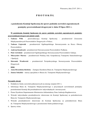 Warszawa, dnia 25.07. 2011 r. PROTOKÓŁ z posiedzenia Komisji Społecznej do spraw podziału zezwoleń zagranicznych pomiędzy przewoźnikami drogowymi w dniu 25 lipca 2011 r. W posiedzeniu Komisji Społecznej do spraw podziału zezwoleń zagranicznych pomiędzy przewoźnikami drogowymi udział wzięli: 1. Tadeusz Wilk – przewodniczący Komisji Społecznej - przedstawiciel Zrzeszenia Międzynarodowych Przewoźników Drogowych w Polsce; 2. Tadeusz Gajownik – przedstawiciel Ogólnopolskiego Stowarzyszenia na Rzecz Obrony Przewoźników; 3. Andrzej Kondracki - przedstawiciel Stowarzyszenia Przewoźników Podlasia; 4. Piotr Litwiński – przedstawiciel Ogólnopolskiego Stowarzyszenia Przewoźników Galicja; 5. Mieczysław Marosz – przedstawiciel Polskiej Izby Gospodarczej Transportu Samochodowego i Spedycji; 6. Sławomir Wasilewski – przedstawiciel Świętokrzyskiego Stowarzyszenia Przewoźników Drogowych oraz: 1. Anna Brzezińska-Rybicka - Zastępca Dyrektora Biura ds. Transportu Międzynarodowego 2. Janusz Sokalski – starszy specjalista w Biurze ds. Transportu Międzynarodowego Porządek obrad: 1. Dodatkowe limity zezwoleń jednorazowych na miesiąc sierpień 2011 r. 2. Informacja Biura ds. Transportu Międzynarodowego o przyznanych zezwoleniach pomiędzy posiedzeniami Komisji dla przedsiębiorców indywidualnych i stowarzyszeń. 3. Pismo Dyrektora Departamentu Ministerstwa Infrastruktury Pana Andrzeja Bogdanowicza. 4. Wnioski indywidualne przedsiębiorców skierowane do Komisji Społecznej za pośrednictwem Biura ds. Transportu Międzynarodowego. 5. Wnioski przedsiębiorców skierowane do Komisji Społecznej za pośrednictwem Biura ds. Transportu Międzynarodowego o przeniesienie limitu podstawowego. 6. Sprawy różne. Przewodniczący Komisji przedstawił informację z posiedzenia polsko – rosyjskiej Komisji Mieszanej ds. międzynarodowych przewozów drogowych, która odbyła się w Kazaniu w dniach 6 – 8 lipca 2011 r. Ze względu na brak wymiany (niedostarczenie przez stronę rosyjską zezwoleń zagranicznych) oraz niewypracowania jednolitego stanowiska uwzględniającego oczekiwania Forum Transportu Drogowego, Ministerstwa Infrastruktury, co do zasad podziału zezwoleń, Komisja nie ustaliła ostatecznych zasad podziału zezwoleń dodatkowych. Komisja ponownie zbierze się w tej sprawie niezwłocznie po otrzymaniu zezwoleń od strony rosyjskiej. Ad.1. Komisja postanowiła, iż zezwolenia Rosja ogólne, Rosja kr-3 oraz Białoruś ogólne w ramach limitów dodatkowych będą mogli pobierać wyłącznie przedsiębiorcy, którzy posiadają licencję na wykonywanie mtd rzeczy powyżej jednego roku (licząc od daty odebrania licencji). Zasada ta będzie obowiązywała od 1 sierpnia 2011 r. i będzie dotyczyła przedsiębiorców, którzy odbiorą licencję po dniu 31 lipca 2011 r. Podstawą przyznania zezwoleń w limicie dodatkowym jest: - poprawne wykorzystanie limitu zezwoleń przyznanych na rok 2011 proporcjonalnie do upływu roku, tj.7/12 limitu, zwróconych do 20 dnia każdego miesiąca. Armenia ogólne • Zezwolenia przydziela się po 2 szt. dla przedsiębiorcy, ale nie więcej niż wnioskował. Azerbejdżan ogólne • Zezwolenia przydziela się zgodnie z wnioskiem. Azerbejdżan kraje 3 • Zezwolenia przydziela się po 2 szt. dla przedsiębiorcy, ale nie więcej niż wnioskował. Białoruś kraje 3 • Zezwolenia przydziela się po 2 szt. dla przedsiębiorcy, ale nie więcej niż wnioskował. Bośnia i Hercegowina kraje 3 • Zezwolenia przydziela się po 1 szt. dla przedsiębiorcy. Bośnia i Hercegowina ogólne • Zezwolenia przydziela się po 4 szt. dla przedsiębiorcy, ale nie więcej niż wnioskował. Bułgaria kraje 3 • Zezwolenia przydziela się zgodnie z wnioskiem. Chorwacja kraje 3 • Zezwolenia przydziela się po 3 szt. dla przedsiębiorcy, ale nie więcej niż wnioskował. Czarnogóra kraje 3 • Brak wniosków Finlandia kraje 3 • Zezwolenia przydziela się zgodnie z wnioskiem. Gruzja ogólne • Zezwolenia przydziela się zgodnie z wnioskiem. Kirgistan kraje 3 • Zezwolenia przydziela się zgodnie z wnioskiem. Norwegia kraje 3 • Brak wniosków Rosja kraje 3 • Komisja postanowiła wstrzymać podział zezwoleń Rosja kraje 3 w ramach limitu dodatkowego Rumunia kraje 3 • Zezwolenia przydziela się zgodnie z wnioskiem. Szwecja kraje trzecie EURO 0 • Brak wniosków Tadżykistan kraje 3 • Brak wniosków Tadżykistan ogólne • Zezwolenia przydziela się po 1 szt. dla przedsiębiorcy. Turcja wjazd na pusto lub kraje trzecie • Zezwolenia przydziela się po 3 szt. dla przedsiębiorcy, ale nie więcej niż wnioskował. Uzbekistan ogólne • Zezwolenia przydziela się po 1 szt. dla przedsiębiorcy. Węgry kraje 3 EURO 3 + S • Zezwolenia przydziela się po 2 szt. dla przedsiębiorcy, ale nie więcej niż wnioskował. Komisja Społeczna przypomina, iż zasada, że zezwolenia zagraniczne przyznawane w limitach dodatkowych powinny być wykorzystane w okresie dwóch miesięcy, a w przypadku Tadżykistanu kr. III – trzech miesięcy od daty ich przyznania. Nie zwrócenie do BTM zezwoleń w ww. terminie, stanowi podstawę do negatywnego rozpatrzenia kolejnego wniosku, dotyczy również Stowarzyszeń. Ad. 2 Dyrektor przedstawił Komisji wykaz zezwoleń, które zostały przyznane pomiędzy posiedzeniami Komisji dla przedsiębiorców i Stowarzyszeń. Komisja zaakceptowała przedstawiony wykaz nie wnosząc zastrzeżeń. Ad. 3 Komisja zapoznała się z treścią pisma. Ad. 4 Wnioski różne przedsiębiorców skierowane do Komisji: 1) KOMIREX Sp. j. z siedzibą w Siemiatyczach w sprawie zezwoleń Białoruś ogólne – zgodnie z zasadami; 2) W. Toczek EKO-ROL z siedzibą w Łęg Tarnowski w sprawie zezwoleń Rosja ogólne i Uzbekistan ogólne – zgodnie z zasadami; 3) EUROTTER RK Sp. z o.o. z siedzibą w Olsztynie w sprawie zezwoleń Rosja ogólne - zgodnie z zasadami; 4) Cz. Niedziela z siedzibą w Warszawie w sprawie zezwoleń Rosja kr-3 – zgodnie z za