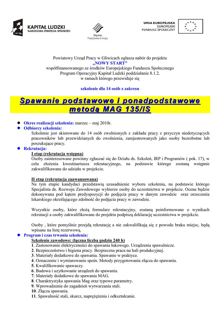 Powiatowy Urząd Pracy w Gliwicach ogłasza nabór do projektu „NOWY START” współfinansowanego ze środków Europejskiego Funduszu Społecznego Program Operacyjny Kapitał Ludzki poddziałanie 8.1.2. w ramach którego przewiduje się szkolenie dla 14 osób z zakresu Spawanie podstawowe i ponadpodstawowe metodą MAG 135/IS Okres realizacji szkolenia: marzec – maj 2010r. Odbiorcy szkolenia: Szkolenie jest skierowane do 14 osób zwolnionych z zakładu pracy z przyczyn niedotyczących pracowników lub przewidzianych do zwolnienia, zarejestrowanych jako osoby bezrobotne lub poszukujące pracy. Rekrutacja: I etap (rekrutacja wstępna) Osoby zainteresowane powinny zgłaszać się do Działu ds. Szkoleń, IRP i Programów ( pok. 17), w celu złoŜenia kwestinariusza rekrutacyjnego, na podstawie którego zostaną wstępnie zakwalifikawane do udziału w projekcie. II etap (rekrutacja zaawansowana) Na tym etapie kandydaci przedstawią uzasadnienie wyboru szkolenia, na podstawie którego Specjalista ds. Rozwoju Zawodowego wybierze osoby do uczestnictwa w projekcie. Ocena będzie dokonywana pod kątem predyspozycji do podjęcia pracy w danym zawodzie oraz orzeczenia lekarskiego określającego zdolność do podjęcia pracy w zawodzie. Wszystkie osoby, które złoŜą formularz rekrutacyjny, zostaną poinformowane o wynikach rekrutacji a osoby zakwalifikowane do projektu podpiszą deklarację uczestnictwa w projekcie. Osoby , które pomyślnie przejdą rekrutację a nie zakwalifikują się z powodu braku miejsc, będą wpisane na listę rezerwową. Program i czas trwania szkolenia: Szkolenie zawodowe: (łączna liczba godzin 240 h) 1. Zastosowanie elektryczności do spawania łukowego. Urządzenia spawalnicze. 2. Bezpieczeństwo i higiena pracy. Bezpieczna praca na hali produkcyjnej. 3. Materiały dodatkowe do spawania. Spawanie w praktyce. 4. Oznaczenie i wymiarowanie spoin. Metody przygotowania złącza do spawania. 5. Kwalifikowanie spawaczy. 6. Budowa i uzytkowanie urządzeń do spawania. 7. Materiały dodatkowe do spawania MAG. 8. Charaktrystyka spawania Mag oraz typowe parametry. 9. Wprowadzenie do zagadnień wytwarzania stali. 10. Złącza spawania. 11. Spawalność stali, skurcz, napręŜęŜenia i odkształcanie. 12. Niezgodności spawalnicze. 13. Przegląd procesów spawania. 14. Bezpieczna praca na montaŜu. 15. Kontrola i badania. Zapewnienie jakości w spawalnictwie. 16. Budowa i uŜytkowanie urządzeń do spawania MAG. 17. Zajęcia praktyczne. Wsparcie psychologiczno – doradcze (łączna liczba godzin 40 h) KaŜde szkolenie zawodowe poprzedzać będą zajęcia z psychologiem (15 h), a zakończy się realizacją modułu doradztwa zawodowego (25 h).