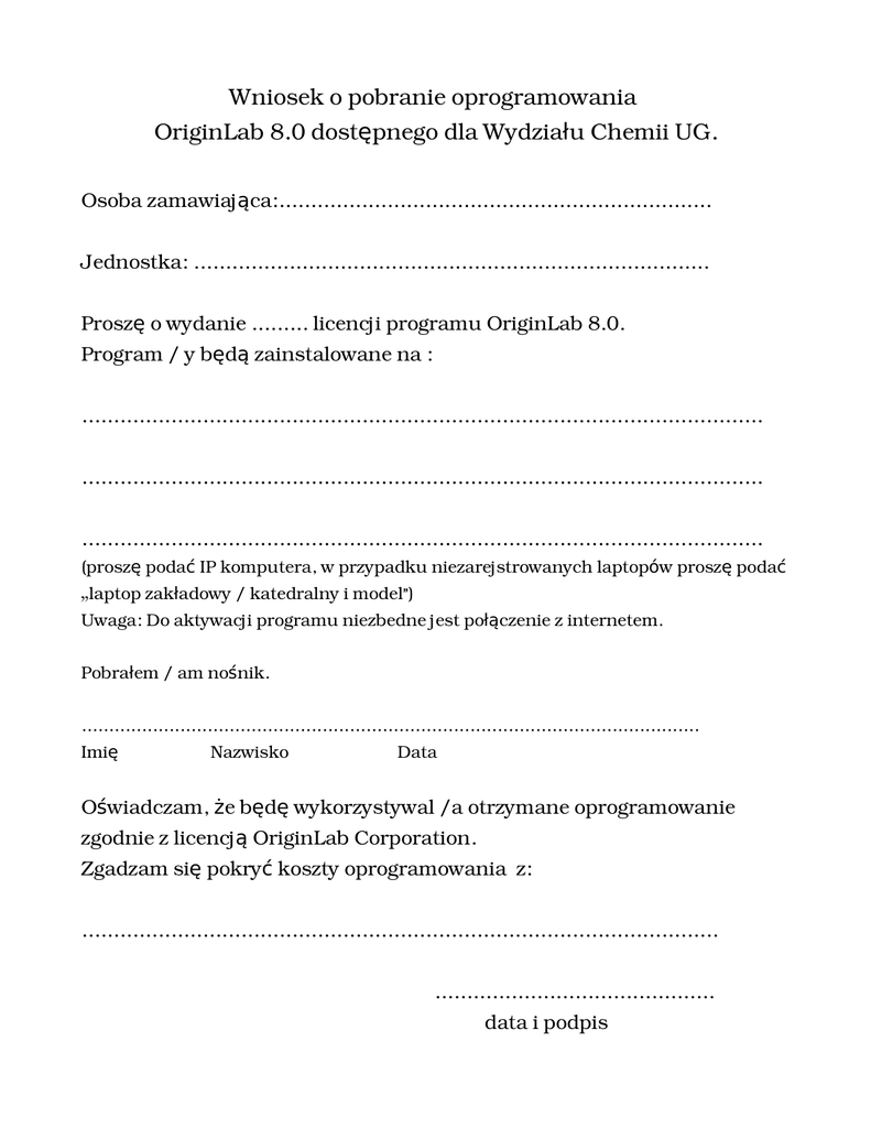 Wniosek o pobranie oprogramowania OriginLab 8.0 dostępnego dla Wydziału Chemii UG. Osoba zamawiająca:.................................................................... Jednostka: ................................................................................. Proszę o wydanie ......... licencji programu OriginLab 8.0. Program / y będą zainstalowane na : ........................................................................................................... ........................................................................................................... ........................................................................................................... (proszę podać IP komputera, w przypadku niezarejstrowanych laptopów proszę podać „laptop zakładowy / katedralny i model”) Uwaga: Do aktywacji programu niezbedne jest połączenie z internetem. Pobrałem / am nośnik. ................................................................................................................. Imię Nazwisko Data Oświadczam, że będę wykorzystywal /a otrzymane oprogramowanie zgodnie z licencją OriginLab Corporation. Zgadzam się pokryć koszty oprogramowania z: .................................................................................................... ............................................ data i podpis