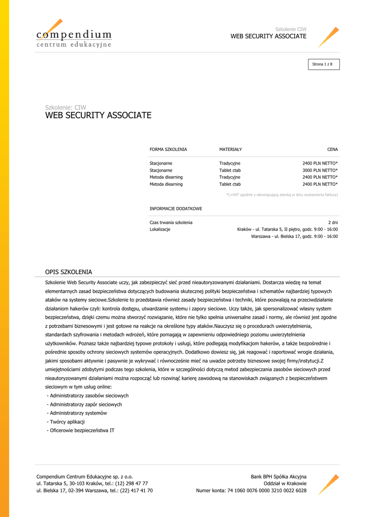 Szkolenie CIW WEB SECURITY ASSOCIATE Strona 1 z 8 Szkolenie: CIW WEB SECURITY ASSOCIATE FORMA SZKOLENIA MATERIAŁY CENA Stacjonarne Tradycyjne 2400 PLN NETTO* Stacjonarne Tablet ctab 3000 PLN NETTO* Metoda dlearning Tradycyjne 2400 PLN NETTO* Metoda dlearning Tablet ctab 2400 PLN NETTO* *(+VAT zgodnie z obowiązującą stawką w dniu wystawienia faktury) INFORMACJE DODATKOWE Czas trwania szkolenia Lokalizacje 2 dni Kraków - ul. Tatarska 5, II piętro, godz. 9:00 - 16:00 Warszawa - ul. Bielska 17, godz. 9:00 - 16:00 OPIS SZKOLENIA Szkolenie Web Security Associate uczy, jak zabezpieczyć sieć przed nieautoryzowanymi działaniami. Dostarcza wiedzę na temat elementarnych zasad bezpieczeństwa dotyczących budowania skutecznej polityki bezpieczeństwa i schematów najbardziej typowych ataków na systemy sieciowe.Szkolenie to przedstawia również zasady bezpieczeństwa i techniki, które pozwalają na przeciwdziałanie działaniom hakerów czyli: kontrola dostępu, utwardzanie systemu i zapory sieciowe. Uczy także, jak spersonalizować własny system bezpieczeństwa, dzięki czemu można stworzyć rozwiązanie, które nie tylko spełnia uniwersalne zasad i normy, ale również jest zgodne z potrzebami biznesowymi i jest gotowe na reakcje na określone typy ataków.Nauczysz się o procedurach uwierzytelnienia, standardach szyfrowania i metodach wdrożeń, które pomagają w zapewnieniu odpowiedniego poziomu uwierzytelnienia użytkowników. Poznasz także najbardziej typowe protokoły i usługi, które podlegają modyfikacjom hakerów, a także bezpośrednie i pośrednie sposoby ochrony sieciowych systemów operacyjnych. Dodatkowo dowiesz się, jak reagować i raportować wrogie działania, jakimi sposobami aktywnie i pasywnie je wykrywać i równocześnie mieć na uwadze potrzeby biznesowe swojej firmy/instytucji.Z umiejętnościami zdobytymi podczas tego szkolenia, które w szczególności dotyczą metod zabezpieczania zasobów sieciowych przed nieautoryzowanymi działaniami można rozpocząć lub rozwinąć karierę zawodową na stanowiskach związanych z bezpieczeństwem sieciowym w tym usług online: - Administratorzy zasobów sieciowych - Administratorzy zapór sieciowych - Administratorzy systemów - Twórcy aplikacji - Oficerowie bezpieczeństwa IT Compendium Centrum Edukacyjne sp. z o.o. ul. Tatarska 5, 30-103 Kraków, tel.: (12) 298 47 77 ul. Bielska 17, 02-394 Warszawa, tel.: (22) 417 41 70 Bank BPH Spółka Akcyjna Oddział w Krakowie Numer konta: 74 1060 0076 0000 3210 0022 6028 Szkolenie CIW WEB SECURITY ASSOCIATE Strona 2 z 8 PLAN SZKOLENIA - Co to jest bezpieczeństwo? - Niezbędne podstawy dla bezpieczeństwa sieciowego - Co to jest bezpieczeństwo? - Statystyki - hakerzy - Mit o 100-procentowym bezpieczeństwie - Atrybuty skutecznej macierzy bezpieczeństwa - Co próbujesz chronić? - Kto stanowi zagrożenie? - Standardy bezpieczeństwa - Elementy bezpieczeństwa - Elementy zabezpieczeń i mechanizmy bezpieczeństwa - Polityka bezpieczeństwa - Kopie zapasowe - Szyfrowanie - Uwierzytelnianie - Wybrane techniki uwierzytelniania - Kontrola dostępu - Audyt - Wady i kompromisy bezpieczeństwa Compendium Centrum Edukacyjne sp. z o.o. ul. Tatarska 5, 30-103 Kraków, tel.: (12) 298 47 77 ul. Bielska 17, 02-394 Warszawa, tel.: (22) 417 41 70 Bank BPH Spółka Akcyjna Oddział w Krakowie Numer konta: 74 1060 0076 0000 3210 0022 6028 Szkolenie CIW WEB SECURITY ASSOCIATE Strona 3 z 8 - Stosowane rodzaje szyfrowania - Powody, dla których powinno się korzystać z szyfrowania - Tworzenie relacji zaufania - Szyfrowanie przy użyciu kluczy symetrycznych - Algorytmy symetryczne - Szyfrowanie przy użyciu kluczy asymetrycznych - Szyfrowanie jednokierunkowe (One-Way (Hash)) - Stosowane procesy szyfrowania - Przegląd metod szyfrowania - Rodzaje ataków - Kategorie ataków sieciowych - Brute-force i ataki słownikowe - Błędy w systemach i "tylne drzwi" (Back Doors) - Malware (złośliwe oprogramowanie) - Ataki socjotechniczne - Ataki typu Denial-of-Service (DoS) - Ataki typu Distributed Denial of Service (DDoS) - Podszywanie Compendium Centrum Edukacyjne sp. z o.o. ul. Tatarska 5, 30-103 Kraków, tel.: (12) 298 47 77 ul. Bielska 17, 02-394 Warszawa, tel.: (22) 417 41 70 Bank BPH Spółka Akcyjna Oddział w Krakowie Numer konta: 74 1060 0076 0000 3210 0022 6028 Szkolenie CIW WEB SECURITY ASSOCIATE Strona 4 z 8 - Skanowanie - Ataki typu Man-in-the-middle - Boty i Botnety - SQL Injection - Audyt - Przedstawienie ostatnie podatności sieciowych - Prezentacja podatności sieciowych - Technologie sieci bezprzewodowych i bezpieczeństwo - Standardy IEEE 802.11 Wireless - Tryby sieci bezprzewodowych - Wireless Application Protocol (WAP) - Problemy z bezpieczeństwem sieci bezprzewodowych - Rozwiązania problemów z bezpieczeństwem dla sieci bezprzewodowych - Wykrywanie sieci - Konwergencja sieci i bezpieczeństwa - Technologie Web 2.0 - Nieautoryzowane aplikacje (Greynet Applications) - Podatności w przechowywanych danych - Zagrożenia pochodzące od zaufanych użytkowników - Anonimowe pobieranie danych i niekontrolowane kliknięcie w linki Compendium Centrum Edukacyjne sp. z o.o. ul. Tatarska 5, 30-103 Kraków, tel.: (12) 298 47 77 ul. Bielska 17, 02-394 Warszawa, tel.: (22) 417 41 70 Bank BPH Spółka Akcyjna Oddział w Krakowie Numer konta: 74 1060 0076 0000 3210 0022 6028 Szkolenie CIW WEB SECURITY ASSOCIATE Strona 5 z 8 - Ogólne zasady bezpieczeństwa - Wspólne zasady bezpieczeństwa - Bądź paranoikiem - Musisz mieć Politykę Bezpieczeństwa - Bez systemu lub technika "bycia samym" (Stands Alone) - Minimalizacja szkody - Wprowadzanie zasad w życie w obrębie całej organizacji - Zapewnienie szkoleń - Używanie zintegrowanej strategii bezpieczeństwa - Instalacja rozwiązań zgodnie z potrzebami - Identyfikowanie problemów z bezpieczeństwem w relacji z prowadzoną działalnością - Elementy bezpieczeństwa fizycznego - Model warstwowy OSI i bezpieczeństwo - Wprowadzenie do bezp