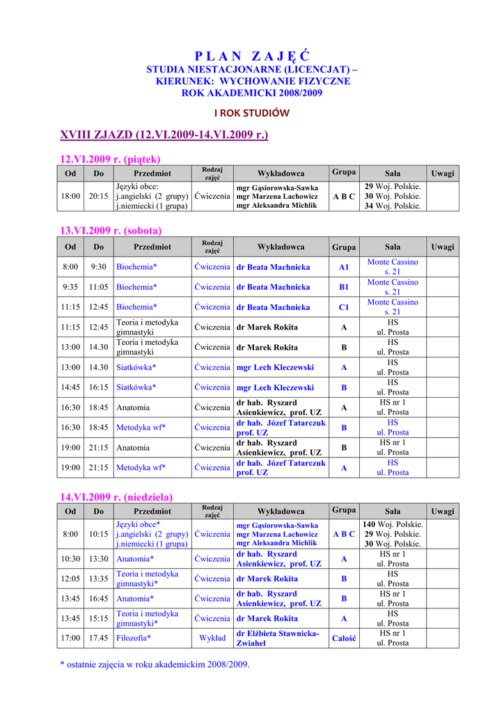 PLAN ZAJĘĆ STUDIA NIESTACJONARNE (LICENCJAT) – KIERUNEK: WYCHOWANIE FIZYCZNE ROK AKADEMICKI 2008/2009 I ROK STUDIÓW XVIII ZJAZD (12.VI.2009-14.VI.2009 r.) 12.VI.2009 r. (piątek) Od 18:00 Do Przedmiot Rodzaj zajęć Wykładowca Języki obce: mgr Gąsiorowska-Sawka 20:15 j.angielski (2 grupy) Ćwiczenia mgr Marzena Lachowicz mgr Aleksandra Michlik j.niemiecki (1 grupa) Grupa Sala ABC 29 Woj. Polskie. 30 Woj. Polskie. 34 Woj. Polskie. Grupa Sala Uwagi 13.VI.2009 r. (sobota) Do 8:00 9:30 Biochemia* Ćwiczenia dr Beata Machnicka A1 9:35 11:05 Biochemia* Ćwiczenia dr Beata Machnicka B1 11:15 12:45 Biochemia* Ćwiczenia dr Beata Machnicka C1 11:15 12:45 Ćwiczenia dr Marek Rokita A Ćwiczenia dr Marek Rokita B 13:00 Przedmiot Rodzaj zajęć Od Teoria i metodyka gimnastyki Teoria i metodyka 14.30 gimnastyki Wykładowca 13:00 14.30 Siatkówka* Ćwiczenia mgr Lech Kleczewski A 14:45 16:15 Siatkówka* Ćwiczenia mgr Lech Kleczewski B 16:30 18:45 Anatomia 16:30 18:45 Metodyka wf* 19:00 21:15 Anatomia 19:00 21:15 Metodyka wf* dr hab. Ryszard Asienkiewicz, prof. UZ dr hab. Józef Tatarczuk Ćwiczenia prof. UZ dr hab. Ryszard Ćwiczenia Asienkiewicz, prof. UZ dr hab. Józef Tatarczuk Ćwiczenia prof. UZ Ćwiczenia A B B A Uwagi Monte Cassino s. 21 Monte Cassino s. 21 Monte Cassino s. 21 HS ul. Prosta HS ul. Prosta HS ul. Prosta HS ul. Prosta HS nr 1 ul. Prosta HS ul. Prosta HS nr 1 ul. Prosta HS ul. Prosta 14.VI.2009 r. (niedziela) Od 8:00 10:30 12:05 13:45 13:45 17:00 Do Przedmiot Rodzaj zajęć Wykładowca Języki obce* mgr Gąsiorowska-Sawka 10:15 j.angielski (2 grupy) Ćwiczenia mgr Marzena Lachowicz mgr Aleksandra Michlik j.niemiecki (1 grupa) dr hab. Ryszard 13:30 Anatomia* Ćwiczenia Asienkiewicz, prof. UZ Teoria i metodyka 13:35 Ćwiczenia dr Marek Rokita gimnastyki* dr hab. Ryszard 16:45 Anatomia* Ćwiczenia Asienkiewicz, prof. UZ Teoria i metodyka 15:15 Ćwiczenia dr Marek Rokita gimnastyki* dr ElŜbieta Stawnicka17.45 Filozofia* Wykład Zwiahel * ostatnie zajęcia w roku akademickim 2008/2009. Grupa Sala 140 Woj. Polskie. A B C 29 Woj. Polskie. 30 Woj. Polskie. HS nr 1 A ul. Prosta HS B ul. Prosta HS nr 1 B ul. Prosta HS A ul. Prosta HS nr 1 Całość ul. Prosta Uwagi
