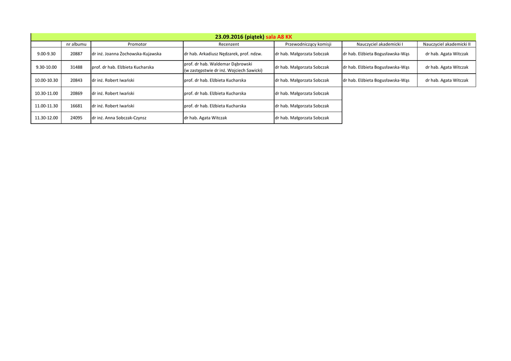 23.09.2016 (piątek) sala A8 KK nr albumu Promotor Recenzent Przewodniczący komisji Nauczyciel akademicki I Nauczyciel akademicki II 9.00-9.30 20887 dr inż. Joanna Żochowska-Kujawska dr hab. Arkadiusz Nędzarek, prof. ndzw. dr hab. Małgorzata Sobczak dr hab. Elżbieta Bogusławska-Wąs dr hab. Agata Witczak 9.30-10.00 31488 prof. dr hab. Elżbieta Kucharska prof. dr hab. Waldemar Dąbrowski (w zastępstwie dr inż. Wojciech Sawicki) dr hab. Małgorzata Sobczak dr hab. Elżbieta Bogusławska-Wąs dr hab. Agata Witczak 10.00-10.30 20843 dr inż. Robert Iwański prof. dr hab. Elżbieta Kucharska dr hab. Małgorzata Sobczak dr hab. Elżbieta Bogusławska-Wąs dr hab. Agata Witczak 10.30-11.00 20869 dr inż. Robert Iwański prof. dr hab. Elżbieta Kucharska dr hab. Małgorzata Sobczak 11.00-11.30 16681 dr inż. Robert Iwański prof. dr hab. Elżbieta Kucharska dr hab. Małgorzata Sobczak 11.30-12.00 24095 dr inż. Anna Sobczak-Czynsz dr hab. Agata Witczak dr hab. Małgorzata Sobczak