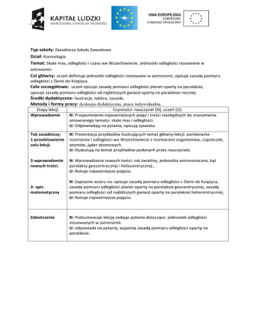 [Wpisz tekst] Typ szkoły: Zasadnicza Szkoła Zawodowa Dział: Kosmologia. Temat: Skale mas, odległości i czasu we Wszechświecie. Jednostki odległości stosowane w astronomii. Cel główny: uczeń definiuje jednostki odległości stosowane w astronomii, opisuje zasadę pomiaru odległości z Ziemi do Księżyca. Cele szczegółowe: uczeń opisuje zasadę pomiaru odległości planet opartą na paralaksie, opisuje zasadę pomiaru odległości od najbliższych gwiazd opartą na paralaksie rocznej. Środki dydaktyczne: ilustracje, tablica, rysunki. Metody i formy pracy: dyskusja dydaktyczna, praca indywidualna. Etapy lekcji Czynności: nauczyciel (N), uczeń (U). Wprowadzenie N: Przypomnienie najważniejszych pojęć i treści niezbędnych do zrozumienia omawianego tematu: skale mas i odległości. U: Odpowiadają na pytania, opisują zjawiska. Tok zasadniczy: 1-przedstawienie celu lekcji. N: Prezentacja przykładów ilustrujących temat główny lekcji: porównanie rozmiarów i odległości we Wszechświecie z rozmiarami organizmów, cząsteczek, atomów, jąder atomowych. U: Dyskutują na temat przykładów podanych przez nauczyciela. 2-wprowadzenie nowych treści. N: Wprowadzenie nowych treści: rok świetlny, jednostka astronomiczna, kąt paralaksy geocentrycznej i heliocentrycznej , . U: Notuje najważniejsze pojęcia. 3- opis matematyczny Zakończenie N: Zapisanie wzoru na: opisuje zasadę pomiaru odległości z Ziemi do Księżyca, zasadę pomiaru odległości planet opartą na paralaksie geocentrycznej, zasadę pomiaru odległości od najbliższych gwiazd opartą na paralaksie heliocentrycznej. U: Notuje najważniejsze pojęcia. N: Podsumowuje lekcję zadając pytania dotyczące: jednostek odległości stosowanych w astronomii. U: odpowiada na pytania, wyjaśnia zasadę pomiaru odległości opartą na paralaksie.