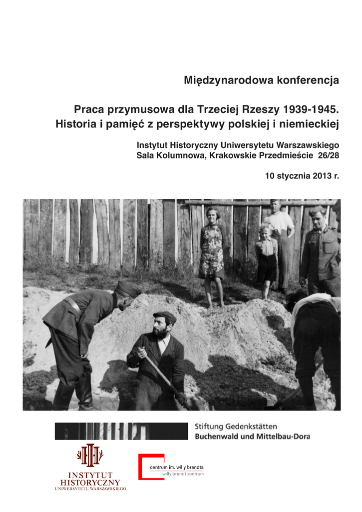 Międzynarodowa konferencja Praca przymusowa dla Trzeciej Rzeszy 1939-1945. Historia i pamięć z perspektywy polskiej i niemieckiej Instytut Historyczny Uniwersytetu Warszawskiego Sala Kolumnowa, Krakowskie Przedmieście 26/28 10 stycznia 2013 r. Międzynarodowa konferencja „Praca przymusowa dla Trzeciej Rzeszy 1939-1945. Historia i pamięć z perspektywy polskiej i niemieckiej“ Organizowana przez Instytut Historyczny Uniwersytetu Warszawskiego, Centrum Studiów Niemieckich i Europejskich im. Willy’ego Brandta Uniwersytetu Wrocławskiego oraz Fundację Miejsc Pamięci Buchenwald i Mittelbau-Dora. W dniach od 9 stycznia do 8 marca 2013 r. Fundacja Miejsc Pamięci Buchenwald i Mittelbau-Dora zaprezentuje w Warszawie w Zamku Królewskim międzynarodową wystawę „Praca przymusowa. Niemcy, robotnicy przymusowi i wojna“. Wystawa objęta jest Patronatem Honorowym Prezydentów Polski i Niemiec, została zainicjowana i sfinansowana przez Fundację „Pamięć, Odpowiedzialność i Przyszłość“ (EVZ). Praca przymusowa była w Niemczech w czasach narodowego socjalizmu zjawiskiem masowym . Nie była tajemnicą, lecz publicznym przestępstwem. To przestępstwo dotyczyło Polaków w szczególny sposób: niemieccy okupanci deportowali stąd między 1939 a 1945 ponad dwa miliony mężczyzn, kobiet i dzieci do pracy przymusowej w Rzeszy Niemieckiej. Wielu innych musiało wykonywać pracę przymusową na terenach okupowanych. Międzynarodowa konferencja naukowa: „Praca przymusowa dla Trzeciej Rzeszy w latach 1939 – 1945. Praktyka i pamięć z polskiej i niemieckiej perspektywy“ organizowana przez Uniwersytet Warszawski, Uniwersytet Wrocławski, oraz Fundację Miejsc Pamięci Buchenwald i Mittelbau-Dora odbędzie się w dniu 10 stycznia 2013 r. w Warszawie i towarzyszy wystawie. Celem konferencji jest przedstawienie stanu badań w Polsce i w Niemczech na temat pracy przymusowej w czasach narodowego socjalizmu. Poza tym podjęty zostanie problem pamięci zbiorowej w obu krajach oraz doświadczenia samych robotnikow przymusowych, utrwalone w relacjach i wspomnieniach. Na koniec poruszony zostanie problem odszkodowań. Na zakończenie konferencji w Zamku Królewskim przewidziana jest dyskusja panelowa na temat „Co zmieniła wypłata odszkodowań dla byłych robotników przymusowych?“ Konferencja odbędzie się w Instytucie Historycznym Uniwersytetu Warszawskiego (Sala Kolumnowa, Krakowskie Przedmieście 26/28) oraz w Zamku Królewskim (sala kinowa, plac Zamkowy 4). Językami konferencji są polski i niemiecki. Dla wszystkich zainteresowanych wstęp wolny. Program konferencji 10 stycznia 2013 Instytut Historyczny Uniwersytetu Warszawskiego, Sala Kolumnowa, Krakowskie Przedmieście 26/28 09.30 – 10.00 Otwarcie konferencji i powitanie Dariusz Kołodziejczyk, Krzysztof Ruchniewicz, Jens-Christian Wagner 10.00 – 11.30 Praca przymusowa jako filar niemieckiej władzy okupacyjnej i gospodarki wojennej Praca przymusowa w czasach narodowego socjalizmu. Stan i perspektywy badawcze Jens-Christian Wagner (Weimar) Praca przymusowa jako studium przypadku. Dylemat historyka Jerzy Kochanowski (Warszawa) Dzień powszedni robotnika przymusowego w Rzeszy Niemieckiej Roland Borchers (Berlin) Moderacja: Krzysztof Ruchniewicz (Wrocław) 11.30 – 12.00 Przerwa kawowa 12.00-13.30 Problem odszkodowań Problem odszkodowań po 1945 r. Constantin Goschler (Bochum) Zabiegi o odszkodowania byłych polskich robotników przymusowych Krzysztof Ruchniewicz (Wrocław) Działalność Fundacji „Pamięć, Odpowiedzialność i Przyszłość” oraz jej orga- nizacji partnerskich Benno Nietzel (Bielefeld) Moderacja: Tanja Penter (Hamburg) 13.30 – 14.45 Przerwa obiadowa 14.45 – 16.15 Formy prezentacji i pamięć Byli robotnicy przymusowi w Polsce Piotr Filipkowski (Warszawa) Pamięć o byłych robotnikach przymusowych w Niemczech i w Polsce Arnd Bauerkämper (Berlin) Obraz Niemiec i Niemców w świetle wspomnień robotników przymusowych Cord Pagenstecher (Berlin) Moderacja: Stanisław Bereś (Wrocław) 16.15 Przerwa kawowa Zamek Królewski w Warszawie, plac Zamkowy 4 (sala kinowa) 17.00 Dyskusja panelowa: Co zmieniła wypłata odszkodowań dla byłych robotni- ków przymusowych? Uczestnicy: Karl-Joseph Hummel (Bonn/Erfurt), Konstanty Gebert (Warszawa), Tomáš Jelínek (Praga) Moderacja: Włodzimierz Borodziej (Warszawa/Jena) 19.00 Wspólne zwiedzanie wystawy „Praca przymusowa. Niemcy, robotnicy przy- musowi i wojna“ (Zamek Królewski w Warszawie) Oprowadzenie po wystawie: Jens-Christian Wagner Organizatorzy: Konferencję współfinansowała: