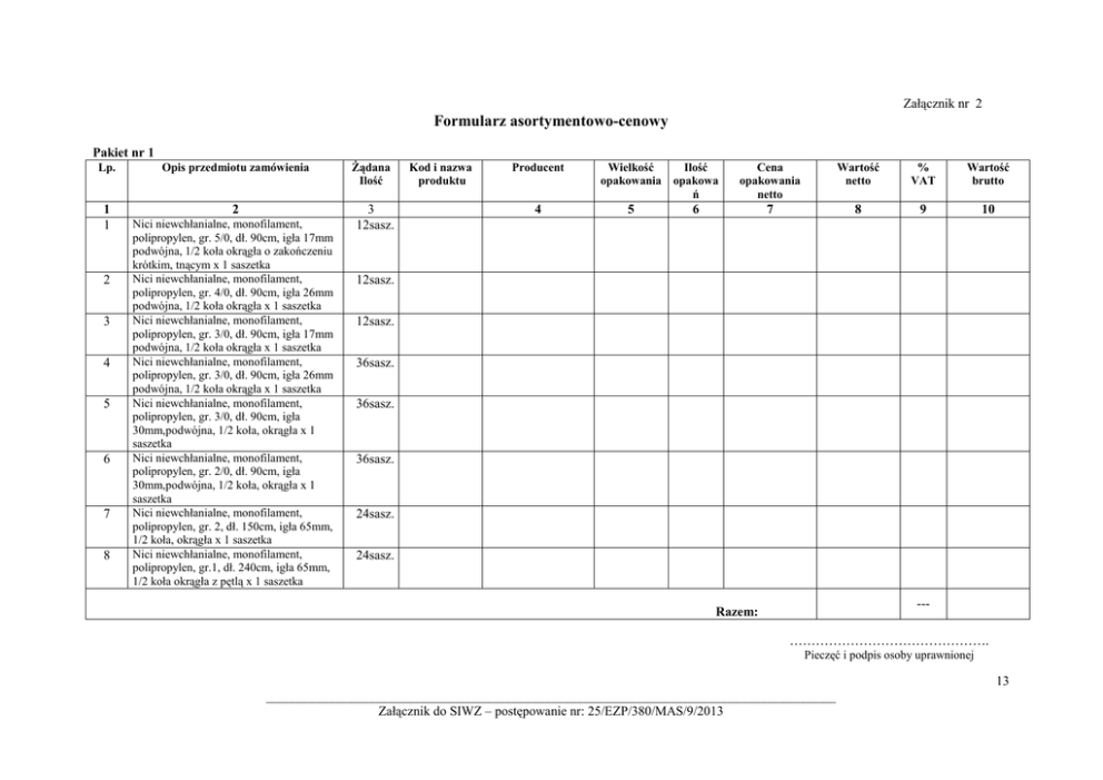 Załącznik nr 2 Formularz asortymentowo-cenowy Pakiet nr 1 Lp. 1 1 2 3 4 5 6 7 8 Opis przedmiotu zamówienia 2 Nici niewchłanialne, monofilament, polipropylen, gr. 5/0, dł. 90cm, igła 17mm podwójna, 1/2 koła okrągła o zakończeniu krótkim, tnącym x 1 saszetka Nici niewchłanialne, monofilament, polipropylen, gr. 4/0, dł. 90cm, igła 26mm podwójna, 1/2 koła okrągła x 1 saszetka Nici niewchłanialne, monofilament, polipropylen, gr. 3/0, dł. 90cm, igła 17mm podwójna, 1/2 koła okrągła x 1 saszetka Nici niewchłanialne, monofilament, polipropylen, gr. 3/0, dł. 90cm, igła 26mm podwójna, 1/2 koła okrągła x 1 saszetka Nici niewchłanialne, monofilament, polipropylen, gr. 3/0, dł. 90cm, igła 30mm,podwójna, 1/2 koła, okrągła x 1 saszetka Nici niewchłanialne, monofilament, polipropylen, gr. 2/0, dł. 90cm, igła 30mm,podwójna, 1/2 koła, okrągła x 1 saszetka Nici niewchłanialne, monofilament, polipropylen, gr. 2, dł. 150cm, igła 65mm, 1/2 koła, okrągła x 1 saszetka Nici niewchłanialne, monofilament, polipropylen, gr.1, dł. 240cm, igła 65mm, 1/2 koła okrągła z pętlą x 1 saszetka śądana Ilość 3 12sasz. Kod i nazwa produktu Producent Wielkość opakowania Ilość opakowa ń Cena opakowania netto Wartość netto % VAT Wartość brutto 4 5 6 7 8 9 10 12sasz. 12sasz. 36sasz. 36sasz. 36sasz. 24sasz. 24sasz. --- Razem: ………………………………………. Pieczęć i podpis osoby uprawnionej 13 _______________________________________________________________________________________ Załącznik do SIWZ – postępowanie nr: 25/EZP/380/MAS/9/2013 Załącznik nr 2 Formularz asortymentowo-cenowy Pakiet nr 2 Lp. 1 1 2 3 4 5 6 Opis przedmiotu zamówienia śądana Ilość 2 3 Nici niewchłanialne,syntetyczne, monofilament,poliamidowe, gr.3/0, dł.75cm,igła 30mm; 3/8 koła;odwrotnie tnąca x 1 saszetka Nici niewchłanialne,syntetyczne, monofilament, poliamidowe, gr.4/0, dł.75cm, igła 30mm,3/8 koła, odwrotnie tnąca x 1 saszetka Nici niewchłanialne,syntetyczne, monofilament,poliamidowe, gr. 1,dł. 75 100 cm, igła 39mm-40 mm ; ½ koła, odwrotnie tnąca x 1 saszetka Nici niewchłanialne, syntetyczne, monofilament, poliamidowe, gr. 6/0, dł. 45 cm , igła 16 mm ;3/8 koła, odwrotnie tnąca x 1 saszetka Nici niewchłanialne, syntetyczne, monofilament, poliamidowe, gr. 2/0, dł. 90cm , igła 30 mm ;3/8 koła, odwrotnie tnąca x 1 saszetka Nici niewchłanialne, syntetyczne, monofilament, poliamidowe, gr. 0, dł. 90cm , igła 37-40 mm ;3/8 koła, odwrotnie tnąca x 1 saszetka Kod i nazwa produktu Producent Wielkość opakowania Ilość opakowa ń Cena opakowania netto Wartość netto % VAT Wartość brutto 4 5 6 7 8 9 10 108 sasz 12 sasz 36sasz. 12 sasz. 1308sasz 36sasz. --- Razem: ……………………………. Pieczęć i podpis osoby uprawnionej 14 _______________________________________________________________________________________ Załącznik do SIWZ – postępowanie nr: 25/EZP/380/MAS/9/2013 Załącznik nr 2 Formularz asortymentowo-cenowy Pakiet nr 3 Lp. 1 1 2 3 4 5 6 7 Opis przedmiotu zamówienia śądana Ilość 2 3 Nici niewchłanialne, skręcone włókna lniane, powlekane silikonem i roztworem poliwinylu nr 1 dł. nitki 150cm bez igły x 1 saszetka Nici niewchłanialne, skręcone włókna lniane, powlekane silikonem i roztworem poliwinylu nr 2 dł. nitki 150cm bez igły x 1 saszetka Nici niewchłanialne, skręcone włókna lniane, powlekane silikonem i roztworem poliwinylu nr 1 dł. nitki 75cm z igłą ; ½ koła 30 mm x 1 saszetka Nici niewchłanialne, skręcone włókna lniane, powlekane silikonem i roztworem poliwinylu nr 1 dł. nitki 75cm z igłą ; ½ koła 37mm x 1 saszetka Nici niewchłanialne, skręcone włókna lniane, powlekane silikonem i roztworem poliwinylu nr 3 dł. nitki 150cm , bez igły x 1 saszetka Znacznik chirurgiczny silikonowy , biały 2,5mmx75cm x 1 sasz. Znacznik chirurgiczny bawełniany, fioletowy 4mmx75cm x 1 sasz. Kod i nazwa produktu Producent Wielkość opakowania Ilość opakowa ń Cena opakowania netto Wartość netto % VAT Wartość brutto 4 5 6 7 8 9 10 2880 sasz. 2088 sasz. 468 sasz. 180 sasz. 180 sasz. 24 sasz. 72 sasz. --- Razem: ………………………………………. Pieczęć i podpis osoby uprawnionej 15 _______________________________________________________________________________________ Załącznik do SIWZ – postępowanie nr: 25/EZP/380/MAS/9/2013 Załącznik nr 2 Formularz asortymentowo-cenowy Pakiet nr 4 Lp. 1 1 2 3 Opis przedmiotu zamówienia śądana Ilość 2 3 Nici wchłanialne, syntetyczne, monofilament, okres podtrzym. 56 dni, grubość 2/0, dł. 70cm , igła 30mm;½ koła; okrągła x 1 saszetka Nici wchłanialne, syntetyczne, monofilament, okres podtrzym. 56 dni, grubość 3/0, dł. 70cm , igła 26mm;½ koła; okrągła x 1 saszetka Nici wchłanialne, syntetyczne, monofilament, okres podtrzym. 56 dni, grubość 3/0, dł. 90cm , igła 30mm;½ koła; okrągła x 1 saszetka Kod i nazwa produktu Producent Wielkość opakowania Ilość opakowa ń Cena opakowania netto Wartość netto % VAT Wartość brutto 4 5 6 7 8 9 10 192sasz. 24sasz 24sasz --- Razem: ………………………………………. Pieczęć i podpis osoby uprawnionej 16 _______________________________________________________________________________________ Załącznik do SIWZ – postępowanie nr: 25/EZP/380/MAS/9/2013 Załącznik nr 2 Formularz asortymentowo-cenowy Pakiet nr 5 Lp. 1 1 Opis przedmiotu zamówienia 2 Pętla endoskopowa z prowadnicą, niewchłanialna, jednowłók. polipropylen, grubość 2/0 x 1 saszetka śądana Ilość 3 Kod i nazwa produktu Producent Wielkość opakowania Ilość opakowa ń Cena opakowania netto Wartość netto % VAT Wartość brutto 4 5 6 7 8 9 10 36sasz --- Razem: ………………………………………. Pieczęć i podpis osoby uprawnionej = 17 _______________________________________________________________________________________ Załącznik do SIWZ – postępowani