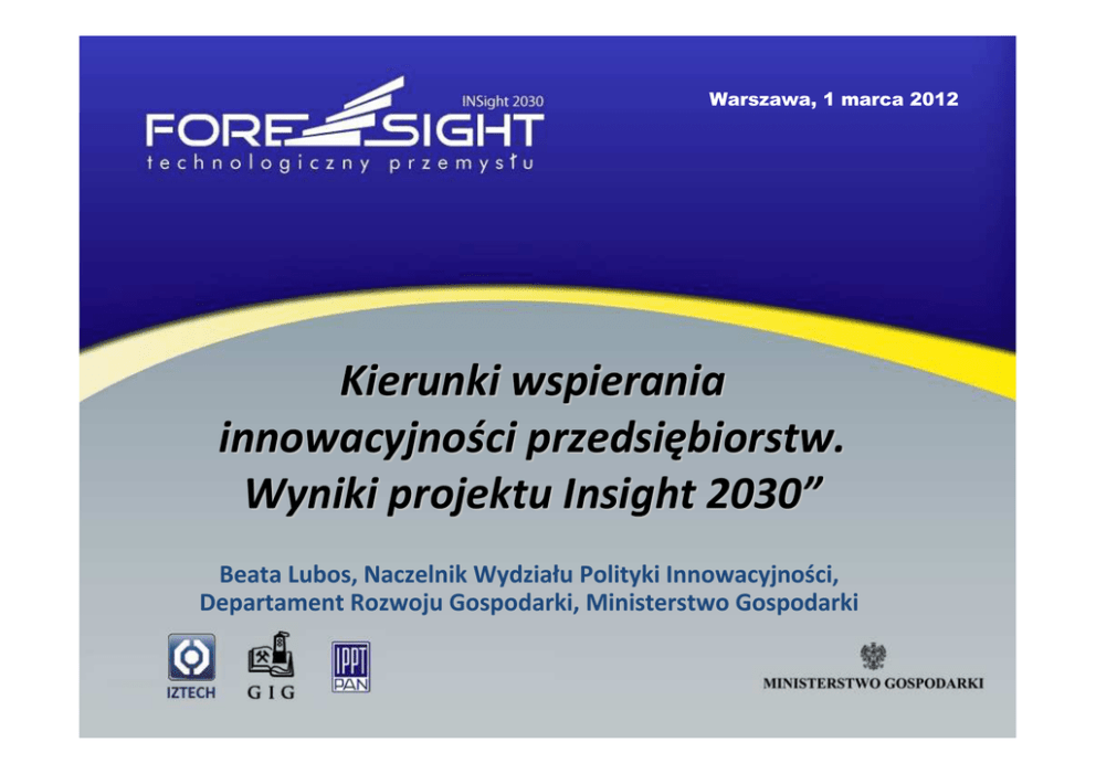 Warszawa, 1 marca 2012 Kierunki wspierania innowacyjności przedsiębiorstw. Wyniki projektu Insight 2030” Beata Lubos, Naczelnik Wydziału Polityki Innowacyjności, Departament Rozwoju Gospodarki, Ministerstwo Gospodarki Program Rozwoju Przedsiębiorstw • Program wykonawczy do Strategii Innowacyjności i Efektywności Gospodarki (SIiEG) • Podstawa nowych PO 2014-2020 w kompetencji Ministerstwa Gospodarki • Kompleksowy system wsparcia innowacyjnych przedsiębiorstw • Działania: - przegląd istniejących instrumentów - przegląd najlepszych praktyk międzynarodowych - przegląd wstępnych konsultacji z partnerami - współpraca z Bankiem Światowym (raport ewaluacyjny ex ante) Program Rozwoju Przedsiębiorstw – założenia • Koncentracja na innowacyjności • Wypełnienie luki finansowej – unikanie wypierania środków prywatnych • Im większe ryzyko, tym większa intensywność wsparcia - Granty na B+R Instrumenty zwrotne na innowacje • Nacisk na rozwój przedsiębiorstw - mentoring/coaching Szkolenia „tailor made” Założenia projektu InSight2030 Zakres projektu: 4 obszary – sektory przemysłowe, usługi powiązane z przemysłem, przemysł energetyczny i przemysł wydobywczy Ogólnopolski zasięg analizy Foresight technologiczny przemysłu InSight2030 Aktualizacja dokumentów strategicznych administracji publicznej i przedsiębiorstw Pierwszy projekt foresightowy w Polsce analizujący przemysł w podejściu sektorowym i horyzontalnym Analiza potencjału rozwoju sektorów przemysłowych w kontekście globalnych trendów Cele projektu InSight 2030 Wskazanie obszarów specjalizacji polskiego przemysłu (polskie rynki wiodące) Zidentyfikowanie technologii wiodących i priorytetowych do 2030 roku Zwiększenie powiązania sektora nauki, biznesu i administracji publicznej Metodyka prac oraz zakres foresightu (1) I etap prac – analiza sektorowa w ramach 4 obszarów Sektory przemysłowe Usługi powiązane z przemysłem Przemysł energetyczny Przemysł wydobywczy Metodyka prac oraz zakres foresightu (2) II etap prac – analiza horyzontalna - wytypowanie 10 Pól Badawczych: Zaawansowane systemy wytwarzania Technologie mikroelektroniczne Nanotechnologie Technologie informacyjne i telekomunikacyjne Biotechnologie przemysłowe Technologie fotoniczne Nowoczesne urządzenia dla przemysłu wydobywczego Rozwój czystych technologii węglowych Technologie pozyskiwania surowców naturalnych Technologie racjonalizacji gospodarowania energią Konkurencyjne obszary przemysłowe • W ramach projektu zidentyfikowano najbardziej konkurencyjne obszary przemysłowe (polskie rynki wiodące), które charakteryzują się dużym potencjałem rozwoju oraz innowacyjnością • Analogicznie do założeń europejskiej Inicjatywy Rynków Wiodących (LMI), identyfikującej 6 rynków o największym potencjale rozwoju dla Europy • Zidentyfikowano 35 obszarów konkurencyjnych tematycznie powiązanych z 10 Polami Badawczymi, np. Nanotechnologie w ochronie zdrowia i produkcji farmaceutyków, energooszczędne budownictwo, technologie ICT w bezpieczeństwie ruchu drogowego Technologie kluczowe i priorytetowe Kryteria wyboru technologii: • • • • wpływ na rozwój społeczno-gospodarczy kraju, spójność z kierunkami prac B+R w świecie, potencjał B+R i przemysłowy Polski w obszarze danej technologii, wielkość nakładów finansowych niezbędnych do wdrożenia wyników prac B+R i wejścia na rynek globalny, • zapotrzebowanie rynku krajowego, • struktura rynku światowego, w tym europejskiego, w zakresie wyrobów i usług, które w przyszłości będą korzystać z analizowanej innowacyjnej technologii, w tym istnienie nisz rynkowych. Technologie kluczowe i priorytetowe W ramach 10 Pól Badawczych wskazano 127 technologii kluczowych Po uwzględnieniu czynników zewnętrznych (np. zapotrzebowanie rynku światowego na daną technologię) i wewnętrznych (np. potencjał B+R Polski w obszarze danej technologii) wyłoniono 34 technologie priorytetowe Zidentyfikowane technologie w dużej mierze pokrywają się z kluczowymi technologiami wspomagającymi (Key Enabling Technologies) wskazanymi przez Unię Europejską Mapy drogowe • Mapy drogowe rozwoju technologii w formie graficznej (horyzont czasowy: 2015-2030) - - Zaprezentowanie kluczowych momentów rozwoju technologii i jej wdrożenia komercyjnego Ukazanie natury, tempa i kierunku potencjalnego rozwoju naukowotechnologicznego do 2030 roku Cel: narzędzie do określania strategii i planowania współdziałania nauki i biznesu w celu osiągnięcia zamierzonych efektów komercyjnych, a także wskazujące działania niezbędne do podjęcia przez administrację publiczną Mapy drogowe Atlas technologii - lokalizacja przestrzenna na terenie Polski podmiotów zajmujących się badaniami nad kluczowymi technologiami lub zajmującymi się ich komercjalizacją - interaktywność prezentacji na stronie internetowej umożliwiająca szybką (http://www.fortech2030.pl/atlas-klastrow) aktualizację danych oraz ich dostępność dla zainteresowanych podmiotów - Cel: geograficzna identyfikacja technologii oraz kompleksowe zebranie danych na ich temat Plan działań Ministerstwa Gospodarki • Ministerstwo Gospodarki do końca I kwartału 2012 przeprowadzi konsultacje społeczne oraz dokona we współpracy z interesariuszami pogłębionej analizy wyników foresightu • W konsekwencji opracowana zostanie ostateczna wersja Programu wdraŜania projektu, wskazująca konkretne działania, instrumenty finansowe oraz pozafinansowe, horyzont czasowy, źródło finansowania, a takŜe podmioty odpowiedzialne za realizację konkretnego działania • Wyniki projektu zostaną rozpowszechnione pośród interesariuszy projektu (administracja publiczna, przedsiębiorcy, instytuty naukowe i badawcze) celem uwzględnienia wyników strategiach rozwojowych powyŜszych podmiotów oraz zainicjowania procesu wymiany dobrych praktyk. • Wyniki projektu oraz konsultacji s