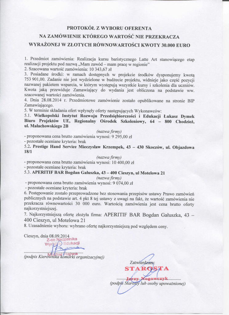 PROTOKOL Z WYBORU OFERENTA NA Z A M O W I E N I E K T O R E G O W A R T O S C N I E P R Z E K R A C Z A W Y R A Z O N E J W Z L O T Y C H R O W N O W A R T O S C I K W O T Y 30.000 E U R O 1. Przedmiot zamowienia: Realizacja kursu baristycznego Latte Art stanowi^cego etap realizacji projektu pod nazw^ „Mam zawod - mam prac? w regionie" 2. Szacowana wartosc zamowienia: 10 343,67 zl 3. Posiadane srodki: w ramach dost^pnych w projekcie srodkow dysponujemy kwot^ 753 901,00. Zadanie nie jest wydzielone w budzecie projektu, widnieje jako cz^sc pozycji nazwanej pakietem wsparcia, w ktorym wyst^puj^ wszystkie kursy i szkolenia dla uczniow. Kwota jak^ przewiduje Zamawiaj^cy do wydania jest obliczona na podstawie ww. szacowanej wartosci zamowienia. 4. Dnia 28.08.2014 r. Przedmiotowe zamowienie zostaio opublikowane na stronie BIP Zamawiaj^cego. 5. W terminie skladania ofert wplyn^ly oferty nast^puj^cych Wykonawcow: 5.1. Wielkopolski Instytut Rozwoju Przedsi^biorczosci i Edukacji Lukasz Dymek Biuro Projektow U E , Regionalny Osrodek Szkoleniowy, 64 - 800 Chodziez, ul. Malachowskiego 2B (nazwa firmy) - proponowana cena brutto zamowienia wynosi: 9 295,00 zl - pozostate oceniane krj^eria: brak 5.2. Prestige Hand Service Mieczyslaw Krzempek, 43 - 430 Skoczow, ul. Objazdowa 18/1 (nazwa firmy) - proponowana cena brutto zamowienia wynosi: 10 400,00 zt - pozostale oceniane kryteria: brak 5.3. A P E R I T I F B A R Bogdan Gaiuszka, 43 - 400 Cieszyn, ul Motelowa 21 (nazwa firmy) - proponowana cena brutto zamowienia wynosi: 9 074,00 zl - pozostale oceniane kryteria: brak 6. Post^powanie zostaio przeprowadzone bez stosowania przepisow ustawy Prawo zamowien publicznych na podstawie art. 4 pkt 8 tej ustawy z uwagi na fakt, ze wartosc zamowienia nie przekracza rownowartosci 30 000 euro. Wartosci^ zamowienia jest cena brutto oferty najkorzystniej szej. 7. NajkorzystniejSZ4 oferty zlozyla firma: APERITIF BAR Bogdan Gaiuszka, 43 - 400 Cieszyn, ul Motelowa 21 8. Uzasadnienie wyboru: wybrano oferty najkorzystniejsz^ pod wzgl^dem ceny. Cieszyn, dnia 08.09.2014 . Z-ce ^4acz8!n!ka VVvcfeljp) Edukacji (podpis KierMmi^3%orrwrki organizacyjnej) z.y.k... (podpi^ Si osoby upowaznionej)