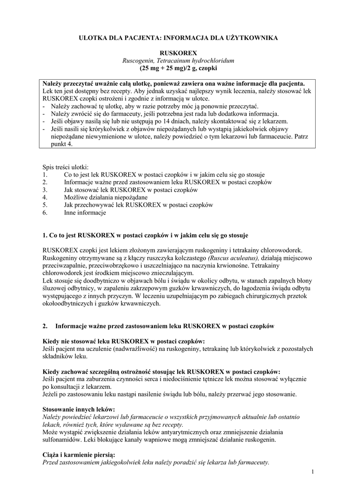 ULOTKA DLA PACJENTA: INFORMACJA DLA UŻYTKOWNIKA RUSKOREX Ruscogenin, Tetracainum hydrochloridum (25 mg + 25 mg)/2 g, czopki Należy przeczytać uważnie całą ulotkę, ponieważ zawiera ona ważne informacje dla pacjenta. Lek ten jest dostępny bez recepty. Aby jednak uzyskać najlepszy wynik leczenia, należy stosować lek RUSKOREX czopki ostrożeni i zgodnie z informacją w ulotce. - Należy zachować tę ulotkę, aby w razie potrzeby móc ją ponownie przeczytać. - Należy zwrócić się do farmaceuty, jeśli potrzebna jest rada lub dodatkowa informacja. - Jeśli objawy nasilą się lub nie ustępują po 14 dniach, należy skontaktować się z lekarzem. - Jeśli nasili się krórykolwiek z objawów niepożądanych lub wystąpią jakiekolwiek objawy niepożądane niewymienione w ulotce, należy powiedzieć o tym lekarzowi lub farmaceucie. Patrz punkt 4. Spis treści ulotki: 1. Co to jest lek RUSKOREX w postaci czopków i w jakim celu się go stosuje 2. Informacje ważne przed zastosowaniem leku RUSKOREX w postaci czopków 3. Jak stosować lek RUSKOREX w postaci czopków 4. Możliwe działania niepożądane 5. Jak przechowywać lek RUSKOREX w postaci czopków 6. Inne informacje 1. Co to jest RUSKOREX w postaci czopków i w jakim celu się go stosuje RUSKOREX czopki jest lekiem złożonym zawierającym ruskogeniny i tetrakainy chlorowodorek. Ruskogeniny otrzymywane są z kłączy ruszczyka kolczastego (Ruscus aculeatus), działają miejscowo przeciwzapalnie, przeciwobrzękowo i uszczelniająco na naczynia krwionośne. Tetrakainy chlorowodorek jest środkiem miejscowo znieczulającym. Lek stosuje się doodbytniczo w objawach bólu i świądu w okolicy odbytu, w stanach zapalnych błony śluzowej odbytnicy, w zapaleniu zakrzepowym guzków krwawniczych, do łagodzenia świądu odbytu występującego z innych przyczyn. W leczeniu uzupełniającym po zabiegach chirurgicznych przetok okołoodbytniczych i guzków krwawniczych. 2. Informacje ważne przed zastosowaniem leku RUSKOREX w postaci czopków Kiedy nie stosować leku RUSKOREX w postaci czopków: Jeśli pacjent ma uczulenie (nadwrażliwość) na ruskogeniny, tetrakainę lub którykolwiek z pozostałych składników leku. Kiedy zachować szczególną ostrożność stosując lek RUSKOREX w postaci czopków: Jeśli pacjent ma zaburzenia czynności serca i niedociśnienie tętnicze lek można stosować wyłącznie po konsultacji z lekarzem. Jeżeli po zastosowaniu leku nastąpi nasilenie świądu lub bólu, należy przerwać jego stosowanie. Stosowanie innych leków: Należy powiedzieć lekarzowi lub farmaceucie o wszystkich przyjmowanych aktualnie lub ostatnio lekach, również tych, które wydawane są bez recepty. Może wystąpić zwiększenie działania leków antyarytmicznych oraz zmniejszenie działania sulfonamidów. Leki blokujące kanały wapniowe mogą zmniejszać działanie ruskogenin. Ciąża i karmienie piersią: Przed zastosowaniem jakiegokolwiek leku należy poradzić się lekarza lub farmaceuty. 1 Brak badań potwierdzających bezpieczeństwo stosowania w okresie ciąży i karmienia piersią. Ekstrakty z ruszczyka kolczastego mogą zwiększać skurcze macicy. Prowadzenie pojazdów i obsługiwanie maszyn: Lek nie wpływa na sprawność psychofizyczną oraz nie zaburza zdolności prowadzenia pojazdów i obsługiwania maszyn. 3. Jak stosować RUSKOREX w postaci czopków Lek jest przeznaczony dla osób dorosłych. Stosować doodbytniczo: 1 czopek, 1 do 2 razy na dobę. Czopki stosować po wypróżnieniu. Jednorazowa terapia nie powinna trwać dłużej niż 2 tygodnie. Stosowanie u pacjentów w podeszłym wieku: Osoby w podeszłym wieku mogą wykazywać zwiększoną wrażliwość na działanie leku, dlatego przed rozpoczęciem leczenia wskazana jest konsultacja z lekarzem. W razie jakichkolwiek dalszych wątpliwości związanych ze stosowaniem leku należy zwrócić się do lekarza lub farmaceuty. Zastosowanie większej niż zalecana dawki leku RUSKOREX w postaci czopków: Nie są znane objawy przedawkowania i zatrucia lekiem. W razie zastosowania większej niż zalecana dawki leku, należy niezwłocznie zwrócić się do lekarza lub farmaceuty. Pominięcie dawki leku RUSKOREX w postaci czopków: Należy kontynuować stosowanie leku. Nie należy stosować dawki podwójnej w celu uzupełnienia pominiętej dawki. 4. Możliwe działania niepożądane Jak każdy lek, lek RUSKOREX, czopki może powodować działania niepożądane, chociaż nie u każdego one wystąpią. Niekiedy może wystąpić nasilenie pieczenia w okolicy odbytu na początku stosowania leku. Ponadto mogą wystąpić luźne stolce. Zgłaszanie działań niepożądanych Jeśli wystąpią jakiekolwiek objawy niepożądane, w tym wszelkie objawy niepożądane niewymienione w ulotce, należy powiedzieć o tym lekarzowi lub farmaceucie. Działania niepożądane można zgłaszać bezpośrednio do Departamentu Monitorowania Niepożądanych Działań Produktów Leczniczych Urzędu Rejestracji Produktów Leczniczych, Wyrobów Medycznych i Produktów Biobójczych, Al. Jerozolimskie 181C, 02-222 Warszawa, tel. + 48 22 49 21 301, faks: + 48 22 49 21 309, e-mail: [email protected] Dzięki zgłaszaniu działań niepożądanych można zgromadzić więcej informacji na temat bezpieczeństwa stosowania leku. 5. Jak przechowywać lek RUSKOREX w postaci czopków: Przechowywać w miejscu niedostępnym i niewidocznym dla dzieci. Nie należy stosować leku RUSKOREX po upływie terminu ważności zamieszczonym na opakowaniu. 2 Lek należy przechowywać w temperaturze poniżej 25°C. Leków nie należy wyrzucać do kanalizacji ani do domowych pojemników na odpadki. Należy zapytać farmaceutę co zrobić z lekami, które nie są już potrzebne. Takie postępowanie pomoże chronić środowisko. 6. Inne informacje Co zawiera lek RUSKOREX w postaci czopków Substancjami czynnymi leku są Ruskogeniny 0,025 g i Tetrakainy chlorowodorek 0,025 g. Ponadto lek zawiera polisorbat 60, triglicerydy 