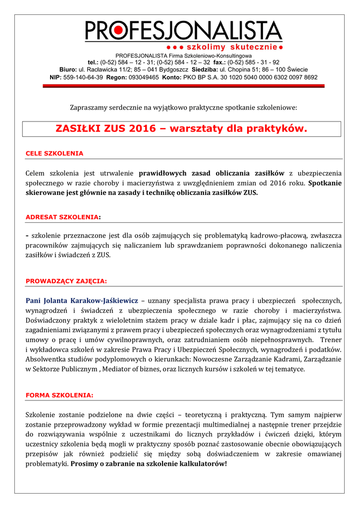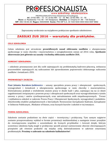 PROFESJONALISTA Firma Szkoleniowo-Konsultingowa tel.: (0-52) 584 – 12 - 31; (0-52) 584 - 12 – 32 fax.: (0-52) 585 - 31 - 92 Biuro: ul. Racławicka 11/2; 85 – 041 Bydgoszcz Siedziba: ul. Chopina 51; 86 – 100 Świecie NIP: 559-140-64-39 Regon: 093049465 Konto: PKO BP S.A. 30 1020 5040 0000 6302 0097 8692 Zapraszamy serdecznie na wyjątkowo praktyczne spotkanie szkoleniowe: ZASIŁKI ZUS 2016 – warsztaty dla praktyków. CELE SZKOLENIA Celem szkolenia jest utrwalenie prawidłowych zasad obliczania zasiłków z ubezpieczenia społecznego w razie choroby i macierzyństwa z uwzględnieniem zmian od 2016 roku. Spotkanie skierowane jest głównie na zasady i technikę obliczania zasiłków ZUS. ADRESAT SZKOLENIA: szkolenie przeznaczone jest dla osób zajmujących się problematyką kadrowo-płacową, zwłaszcza pracowników zajmujących się naliczaniem lub sprawdzaniem poprawności dokonanego naliczenia zasiłków i świadczeń z ZUS. - PROWADZĄCY ZAJĘCIA: Pani Jolanta Karakow-Jaśkiewicz – uznany specjalista prawa pracy i ubezpieczeń społecznych, wynagrodzeń i świadczeń z ubezpieczenia społecznego w razie choroby i macierzyństwa. Doświadczony praktyk z wieloletnim stażem pracy w dziale kadr i płac, zajmujący się na co dzień zagadnieniami związanymi z prawem pracy i ubezpieczeń społecznych oraz wynagrodzeniami z tytułu umowy o pracę i umów cywilnoprawnych, oraz zatrudnianiem osób niepełnosprawnych. Trener i wykładowca szkoleń w zakresie Prawa Pracy i Ubezpieczeń Społecznych, wynagrodzeń i podatków. Absolwentka studiów podyplomowych o kierunkach: Nowoczesne Zarządzanie Kadrami, Zarządzanie w Sektorze Publicznym , Mediator of biznes, oraz licznych kursów i szkoleń w tej tematyce. FORMA SZKOLENIA: Szkolenie zostanie podzielone na dwie części – teoretyczną i praktyczną. Tym samym najpierw zostanie przeprowadzony wykład w formie prezentacji multimedialnej a następnie trener przejdzie do rozwiązywania wspólnie z uczestnikami do licznych przykładów i ćwiczeń dzięki, którym uczestnicy szkolenia będą mogli w praktyczny sposób poznać zastosowanie obecnie obowiązujących przepisów jak również podzielić się między sobą doświadczeniem w zakresie omawianej problematyki. Prosimy o zabranie na szkolenie kalkulatorów! W trakcie spotkania omówimy/przećwiczymy następujące zagadnienia: CZĘŚĆ I. 1. Zmiany w ustawie o świadczeniach pieniężnych w razie choroby i macierzyństwa wchodzące w życie 1 stycznia 2016 roku o wystawianie, przesyłanie i odbiór zaświadczeń lekarskich w formie elektronicznej o rozszerzenie kręgu osób uprawnionych do zasiłku macierzyńskiego o rozszerzenie kręgu osób uprawnionych do zasiłku opiekuńczego 2. „Formy” zaświadczeń lekarskich o zaświadczenie lekarskie elektroniczne (E-zwolnienie) o wydruk zaświadczenia lekarskiego o zaświadczenie lekarskie w formie pisemnej o zaświadczenie lekarskie wystawione na formularzu wydrukowanym z systemu teleinformatycznego 3. Zasiłek macierzyński po nowelizacji przepisów: o z tytułu urodzenia dziecka oraz z tytułu przyjęcia dziecka na wychowanie o nowe terminy występowania z wnioskiem o urlopy macierzyńskie o nowe zasady ustalania okresu wypłaty zasiłku w razie urodzenie dziecka w czasie urlopu wychowawczego o zasady udzielania urlopów dodatkowych, skracanie urlopu i dzielenie się urlopem przez matkę i ojca dziecka, o zasady udzielania, skracania urlopu rodzicielskiego i dzielenie się urlopem rodzicielskim z drugim z rodziców dziecka, kiedy urlop rodzicielski nie może zostać skrócony o zasady postępowania w razie wygaśnięcia umowy o pracę w okresie przysługiwania zasiłku macierzyńskiego o różna wysokość zasiłku macierzyńskiego w zależności od rodzaju urlopu, uzależnienie wysokości zasiłku macierzyńskiego od terminu wystąpienia z wnioskiem i okresu jego pobierania o zasady dokonywania wyrównania zasiłku macierzyńskiego do 100% o zasiłek macierzyński za okres urlopu dodatkowego i rodzicielskiego - możliwość podejmowania pracy w okresie urlopu dodatkowego i urlopu rodzicielskiego, zmienione zasady podejmowania pracy, obliczanie wysokości zasiłku w proporcji do wymiaru czasu pracy o zasady rezygnacji z urlopu macierzyńskiego/pobierania zasiłku macierzyńskiego o zasiłek macierzyński za okres urlopu ojcowskiego o zasiłek macierzyński dla osób niebędących pracownikami 4. Wynagrodzenie za czas choroby, zasiłek chorobowy, świadczenie rehabilitacyjne i zasiłek opiekuńczy: o warunki nabycia prawa, okres przysługiwania o brak prawa o wysokość świadczeń 5. Zasady dokumentowania prawa do zasiłków i ich wypłaty o zasady dokumentowania prawa do zasiłku macierzyńskiego, w tym: o w razie dzielenia się przez rodziców okresami pobierania zasiłku macierzyńskiego o za okres urlopu rodzicielskiego o w razie rezygnacji z urlopu i zasiłku macierzyńskiego o dokumenty składane do ZUS, gdy umowa o pracę wygasa w okresie przysługiwania zasiłku macierzyńskiego, w tym gdy jest przedłużona do dnia porodu o informacje, które musi zawierać zaświadczenie dla celów wypłaty zasiłku macierzyńskiego drugiemu z rodziców dziecka - z tytułu przyjęcia dziecka na wychowanie o dokumenty wymagane do zasiłku opiekuńczego w razie choroby niani lub dziennego opiekuna sprawujących opiekę nad dzieckiem o dane, które powinno zawierać zaświadczenie o opiece nad zdrowym dzieckiem nowy wzór zaświadczenia płatnika składek ZUS Z-3 zasady wypełniania druku ZUS Z-3 - składniki stałe, zmienne, uzupełniane, nieuzupełniane, składniki za dłuższe okresy o kiedy nie trzeba składać ZUS Z-3 6. Zasady ustalania podstawy wymiaru świadczeń: o okres, z którego podstawa wymiaru jest ustalana o uzupełnianie wynagrodzenia oraz składniki przyjmowane bez uzupełniania o składniki nieuwzględniane w podstawie wymiaru o składniki miesięczne, kwartalne i roczne o składniki do określonego terminu, zaprzestani