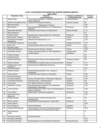 LISTA CZŁONKÓW PARTNERSTWA BORÓW NIEMODLIŃSKICH lipiec 2016 Nazwisko i imię 1 Bartek Rafał 2 Bazarnik-Kowalska Irmina 3 Bernacka Maria 4 Bonk Marcin 5 Podmiot reprezentowany Towarzystwo Społeczno - Kulturalne Niemców na Śląsku Opolskim Ludowy Klub Jeździecki Moszna Funkcja w podmiocie reprezentowanym Przewodniczący Nr karty członka 134 Członek Zarządu 65 102 Proboszcz 122 Borkowski Mirosław Nadleśnictwo Tułowice Rzymskokatolicka Parafia pw. św. Wawrzyńca w Dąbrowie Ochotnicza Straż Pożarna w Żerkowicach Prezes Zarządu 112 6 Byra Katarzyna - - 41 7 Czollek Daniel Kompleksowe Usługi Ogrodnicze i Brukarskie Właściciel 135 8 Domaradzki Tadeusz OSP Jaśkowice Prezes 104 9 Stadnina Koni Moszna Sp. z o.o prezes 123 10 Donimirska-Wodzicka Magdalena Duchnowska Dagmara Gmina Biała Zastępca burmistrza 170 11 Duran Jan Stowarzyszenie Odnowy Wsi Gracze prezes 28 12 13 Dzumla Lucjan Filipowski Waldemar Stowarzyszenie Rozwoju „Stodoła” Prezes 177 145 14 Gandziała Andrzej Gawlik Grzegorz Członek Rady Parafialnej - 69 15 Parafia rzymskokatolicka św. Marii Magdaleny w Łambinowicach - 16 Gawlista Ditmar - - 82 17 Gąsiorek Mirosław Zastępca prezesa 76 18 Gliniorz Renata Stowarzyszenie Rozwoju Wsi Jasienica Dolna i Drogoszów Samorządowy Ośrodek Kultury w Komprachcicach Dyrektor 131 19 Stowarzyszenie Miłośników Chróściny Prezes 109 20 Gołebiowska-Jarek Katarzyna Gruszka Andrzej 21 Hanich Andrzej Proboszcz 9 22 Heince Marek Parafia Rzymskokatolicka Św. Jerzego w Prószkowie Ochotnicza Straż Pożarna w Ochodzach Prezes 160 23 Janikula Krzysztof - - 147 24 Janowski Zbigniew Gminny Ośrodek Kultury i Rekreacji w Dąbrowie Dyrektor 103 25 Jarmoliński Sławomir Ośrodek Kultury w Strzeleczkach Dyrektor 54 26 Jary Marek OFF MEDIA GROUP w Grabinie Właściciel 138 27 Józkowicz Tomasz proboszcz 154 28 Jucha Andrzej Proboszcz 129 29 Juros Marek Rzymskokatolicka Parafia pw. Św. Klemensa Rzymskiego w Rusocinie Rzymskokatolicka Parafia Trójcy Przenajświętszej w Zielinie- Kujawach Diagnostyka i mechanika pojazdowa Właściciel 152 30 - - 173 31 Kalinowska Ilków Bogumiła Kiraga Jadwiga prezes 45 32 Klosa Joachim Stowarzyszenie na Rzecz Rozwoju Wsi Skarbiszowice Gospodarstwo Agroturystyczne Ligocki Młyn Właściciel 21 33 Klosa Jolanta - - 164 34 Knura Zygmunt Gmina Strzeleczki Inspektor 4 35 Kobylarz-Buła Renata Sekretarz 126 36 Kojat Waranka Alicja Stowarzyszenie Przyjaciół Centralnego Muzeum Jeńców Wojennych w Łambinowicach-Opolu - - 5 37 Koncewicz Dorota Gmina Niemodlin 38 Korzekwa Stanisław - - 153 39 Kownacka Kornelia Stowarzyszenie na rzecz Rozwoju Publicznej Przewodnicząca 108 44 167 1 1 Nazwisko i imię 40 Kremer Józef Podmiot reprezentowany Szkoły Podstawowej w Prószkowie „Szerokie Horyzonty” Ludowy Zespół Sportowy w Wawelnie Funkcja w podmiocie reprezentowanym Nr karty członka 41 Kurpiela Izabela - - 176 42 Kurpiela Marek TSKN koło Strzeleczki Przewodniczący 58 43 Leja Marek Gmina Dąbrowa Wójt 2 44 Lenkiewicz Alfred Właściciel 30 45 Lisson-Pastwa Bernadeta Przedsiębiorstwo Usług, Handlu i Produkcji BUDGRI Stowarzyszenie Rozwoju Wsi Wawelno Skarbnik 85 46 Lissy Kluczny Aneta Gmina Prószków Burmistrz 8 47 Litwinowicz Łukasz Prezes stowarzyszenia 128 48 Los Piotr Stowarzyszenie Ochrony Dóbr Kultury w Gminie Dąbrowa „Dąbrowskie Skarby” Ochotnicza Staż Pożarna w Wawelnie Naczelnik 36 49 Luda Hubert Mechanika Pojazdowa Usługi właściciel 174 50 Łubiński Zygmunt Nadleśnictwo Prószków Inżynier Nadzoru 78 51 Madej Beata Centralne Muzeum Jeńców Wojennych w Łambinowicach Asystent muzealny 96 52 Magdy Teresa 53 Malejki Jakub Green Line Jakub Malejki Właściciel 142 54 Maślej Wojciech - - 13 55 Matysek Urszula Mencler Katarzyna Członek rady duszpasterskiej Skarbnik 169 56 Parafia Rzymskokatolicka pw. Św. Jana Chrzciciela w Dobrej Stowarzyszenie Odnowy Wsi Solec 57 Mierzyńska Jolanta dyrektor 22 58 Miśta Andrzej Prezes 87 59 Moździerz Zdzisław Proboszcz 50 60 Mróz Andrzej Gminny Ośrodek Kultury, Sportu i Rekreacji w Łambinowicach Przedsiębiorstwo Surowców Sklanych „Bazalt Gracze „ sp z o.o Rzymskokatolicka Parafia pw. Świętego Jana Nepomucena - - 121 61 Mueller Bernadeta Kancelaria Księgowo- Podatkowa Właściciel 136 62 Mueller Victoria Nieckarz Mariusz 64 Oleksy Grzegorz Prezes zarządu stowarzyszenia Przewodniczący Stowarzyszenia prezes 116 63 Stowarzyszenie „Nasza Wioska – Ligota Prószkowska Stowarzyszenie Odnowy i Rozwoju Wsi Rzędziwojowice Ludowy Zespół Sportowy Zieloni, Ligota Tułowicka 65 Niemodlińskie Towarzystwo Regionalne Przewodnicząca 150 66 Paszkowska-Witkowska Aleksandra Paszula Katarzyna Ośrodek Kultury w Niemodlinie Dyrektor 97 67 Pawleta Daniel Ochotnicza Straż Pożarna w Polskiej Nowej Wsi Sekretarz 159 68 Pawłowski Dariusz 69 - - 179 70 Pestka Adam Pobóg-Lenartowicz Anna Towarzystwo Przyjaciół Chmielowic Prezes 25 71 Podobiński Daniel - - 12 72 Podsada Magdalena - - 175 73 Pogonowski Wiesław - - 91 74 Przywara Maria - - 133 75 Raina Aleksandra Przewodnicząca 114 76 Robota Krzysztof Stowarzyszenie Odnowy i Rozwoju wsi Grodziec „Tysiącletnie Grodzisko” Ochotnicza Straż Pożarna w Zielinie Zastępca prezesa 64 77 Rosiński Jerzy Gmina Łambinowice sekretarz 10 78 Rynkiewicz Mirosław Proboszcz 119 79 Sawicz Janusz Rzymskokatolicka Parafia p.w. Wniebowzięcia NMP w Niemodlinie - - 162 Prezes 35 165 171 100 74 166 2 Nazwisko i imię 80 Siano Janusz - Funkcja w podmiocie reprezentowanym - 81 - - 178 Gmina Komprachcice Inspektor 3 83 Skrzypek Wiesław Słodkowska-Mędrecka Joanna Stanek Radosław - - 137 84 Staniów Mariusz Ośrodek Kultury i Sportu w Prószkowie Dyrektor 79 85 Syguła Kajetan Wild Boat Kajetan Syguła właściciel 172 86 Szołtysik Grzegorz prezes 168 87 Tataruch Marcin Stowarzyszenie na Rzecz Trwałego i Zrównoważonego Rozwoju Zielona Ziemia Firma ROSA Marcin Tatatuch - 124 88 Urbacka Maria Parafia Św. Trójcy Boguszyce Proboszcz 92 89 Wa