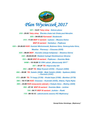 Plan Wycieczek 2017 001 - 14.01 Tatry zimą: Zelone pleso 010 - 25.02 Tatry zimą: Žiarska chata lub Chata pod Náružím 005 – 04-05.02 Karnawał: Studzionki 015 - 11.03 MSP V wariant: Łętowe – Mszana Dolna MSP III wariant: Harkabuz - Piątkowa 020 – 25-26.03 KGŚ: Kamień Michniowski, Bukowa Góra, Osieczyńska Góra, Masłów Pierwszy – Ciosowa (GSŚ) 024 – 09.04 MSP: Hucisko (stacja kolejowa) – Skawica Górna 030 - 29.04-03.05 Śladami trylogii Sienkiewicza Ukraina 033 – 06.05 MSP III wariant: Piątkowa – Kasinka Mała 049B – 15-18.06 55 CRH udział „Bieszczady 2017” 057 – 01.07 TD: Kôprovský štít 062 – 22.07 TD: Mały Krywań (2335) – Krywań (2494) 066 – 05.08 TD: Salatín (2048) - Malý Salatín (2046) - Spálená (2083) – Pachoľa (2167) 073 –20.08 TD: Tri kopy (2136) - Hrubá kopa (2166) - Baníkov (2178) 080 – 16-17.09 KGŚ: Ciosowa – Kuźniaki (GSŚ), Altana, Fajna Ryba 085 – 23.09 KGŚ (wręczenie odznak ): Kobyla Góra – Bieliny (GSŚ) 092 - 07.10 MSP III wariant: Kasinka Mała - Jurków 104 - 04.11 MSP III wariant: Jurków – Rzeki 110 - 09-10.12 - zakończenie sezonu KG Wędrowcy Zarząd Klubu Górskiego „Wędrowcy”