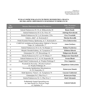 Załącznik nr 1 do Zarządzenia Nr 0152-46/10 Burmistrza Miasta Nowy Targ z dnia 25 października 2010 r WYKAZ OSÓB WSKAZANYCH PRZEZ BURMISTRZA MIASTA DO SKŁADÓW OBWODOWYCH KOMISJI WYBORCZYCH NR OKW SIEDZIBA OBWODOWEJ KOMISJI WYBORCZEJ IMIĘ I NAZWISKO 1 Szkoła Podstawowa Nr 10, ul. Klikuszówka 30 Beata Stasik 2 Szkoła Podstawowa Nr 4, Os. Niwa 18 Jadwiga Kowalczuk 3 Szkoła Podstawowa Nr 3, ul. Kowaniec 125a Ewa Twardzik 4 Galeria „Jatki”, ul. Kościuszki 4 Marian Kowalik 5 Polski Komitet Pomocy Społecznej, ul. T. Kościuszki 8 Ewa Zaborowska 6 CARITAS Archidiecezji Krakowskiej, Oddział w Nowym Targu, ul. Ludźmierska 17 Anna Garbacz 7 Szkoła Podstawowa Nr 6, Os. Na Skarpie 11 Halina Fryźlewicz 8 Miejski Ośrodek Kultury, Al. Tysiąclecia 37 Elżbieta Klocek 9 Gimnazjum Nr 1, Pl. Słowackiego 14 Małgorzata Brożek 10 Szkoła Podstawowa Nr 5, ul. W Orkana 17 Małgorzata Smarduch 11 Szkoła Podstawowa Nr 2, Al. M. Kopernika 28 Iwona Bizub 12 Zespół Szkół Technicznych, ul. Wojska Polskiego 9 Ewa Augustyn 13 Przedszkole Prywatne „Wesoła Ciuchcia”, ul. Wojska Polskiego 26 Magdalena Giełczyńska 14 Nowotarska Spółdzielnia Mieszkaniowa, Al. M. Kopernika 12 Katarzyna Stanek 15 Klub Sportowy "Gorce", Al. Tysiąclecia 74 Lucyna Czubernat 16 Gimnazjum Nr 2, Plac Evry 3 Katarzyna Kojs 17 Szkoła Podstawowa Nr 11, Plac Evry 3 Józef Abramek 18 Podhalański Szpital Specjalistyczny im. Jana Pawła II w Nowym Targu ul. Szpitalna 14 Gabriel Solecki ZGŁASZANEGO