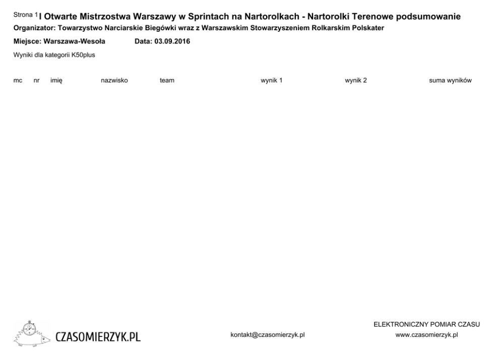 Strona 1 I Otwarte Mistrzostwa Warszawy w Sprintach na Nartorolkach - Nartorolki Terenowe podsumowanie Organizator: Towarzystwo Narciarskie Biegówki wraz z Warszawskim Stowarzyszeniem Rolkarskim Polskater Miejsce: Warszawa-Wesoła Data: 03.09.2016 Wyniki dla kategorii K50plus mc nr imię nazwisko team wynik 1 wynik 2 suma wyników ELEKTRONICZNY POMIAR CZASU [email protected] www.czasomierzyk.pl