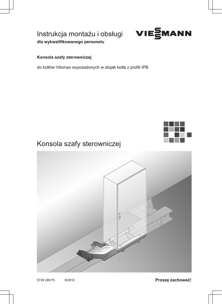 Instrukcja montażu i obsługi VIESMANN dla wykwalifikowanego personelu Konsola szafy sterowniczej do kotłów Vitomax wyposażonych w stojak kotła z profili IPB Konsola szafy sterowniczej 5728 289 PL 8/2010 Proszę zachować! Wskazówki bezpieczeństwa Wskazówki dotyczące bezpieczeństwa Prosimy o dokładne przestrzeganie wskazówek bezpieczeństwa w celu wykluczenia ryzyka utraty zdrowia oraz powstania szkód materialnych. Objaśnienia do wskazówek bezpieczeństwa Niebezpieczeństwo Ten znak ostrzega przed niebezpieczeństwem zranienia. ! Uwaga Ten znak ostrzega przed stratami materialnymi i zanieczyszczeniem środowiska. Wskazówka Tekst oznaczony słowem Wskazówka zawiera dodatkowe informacje. ■ ustawowych przepisów bezpieczeństwa i higieny pracy (BHP), ■ ustawowych przepisów o ochronie środowiska, ■ rozporządzenia o bezpieczeństwie eksploatacji (BetrSichV), ■ przepisów zrzeszeń zawodowo-ubezpieczeniowych, ■ dyrektywy 97/23/WE oraz właściwych przepisów bezpieczeństwa niżej wymienionych krajów d DVGW, TRGI, TRF i VDE, TRD a KG, ABV, LRG-K, LRV-K, DKBG c SEV, SUVA, SVGW, SVTI, SWKI, VKF oraz dyrektywy EKAS 1942: gaz płynny, część 2 Grupa docelowa Niniejsza instrukcja skierowana jest wyłącznie do wykwalifikowanego personelu. ■ Prace przy instalacji gazowej może wykonywać wyłącznie instalator posiadający odpowiednie uprawnienia. ■ Prace na podzespołach elektrycznych mogą być wykonywane tylko przez wykwalifikowany personel. ■ Pierwsze uruchomienie powinien przeprowadzić serwis przemysłowy firmy Viessmann, wykonawca instalacji lub wyznaczona przez niego osoba posiadająca odpowiednie uprawnienia. Podczas prac należy przestrzegać 2 5728 289 PL Przepisy Wskazówki bezpieczeństwa Wskazówki dotyczące bezpieczeństwa (ciąg dalszy) Postępowanie w przypadku wycieku oleju i wystąpienia zapachu gazu Niebezpieczeństwo Wyciekające paliwo może spowodować eksplozję, a w jej następstwie ciężkie obrażenia. ■ Nie palić! Nie dopuszczać do powstania otwartego ognia i tworzenia się iskier. Pod żadnym pozorem nie włączać ani nie wyłączać oświetlenia i urządzeń elektrycznych. ■ Zamknąć szybkozamykający zawór paliwa i zawór odcinający paliwo. ■ Otworzyć okna i drzwi. ■ Ewakuować osoby z obszaru zagrożenia. ■ Po opuszczeniu budynku zawiadomić zakład gazowniczy i energetyczny. ■ Zasilanie prądowe budynku rozłączyć z bezpiecznego miejsca (z miejsca poza budynkiem). Jeżeli występuje zapach spalin ■ Zamknąć zawór odcinający paliwo i zabezpieczyć przed przypadkowym otwarciem. ■ Odłączyć instalację od napięcia elektrycznego (np. za pomocą oddzielnego bezpiecznika lub wyłącznika głównego) i sprawdzić jego brak w obwodach. ■ Zabezpieczyć instalację przed przypadkowym włączeniem. ! Uwaga Wyładowania elektrostatyczne mogą doprowadzić do uszkodzenia podzespołów elektronicznych. Przed rozpoczęciem prac należy dotknąć uziemionych obiektów, np. rur wodociągowych, w celu odprowadzenia ładunków statycznych. Niebezpieczeństwo Niebezpieczeństwo oparzenia o gorące powierzchnie ■ Przewód parowy, ■ przewód gorącej wody, ■ pokrywa wyczystkowa i zamknięcia w instalacjach kotłowych, ■ drzwi kotłów oraz znajdujące się za nimi elementy konstrukcyjne mogą mieć podwyższone temperatury. Przestrzegać przepisów bezpieczeństwa pracy! 5728 289 PL Niebezpieczeństwo Wdychanie spalin może powodować zatrucia zagrażające życiu i zdrowiu. ■ Wyłączyć instalację z eksploatacji. ■ Przewietrzyć pomieszczenie kotłowni. Prace przy instalacji 3 Wskazówki bezpieczeństwa Wskazówki dotyczące bezpieczeństwa (ciąg dalszy) Prace naprawcze Odprowadzanie gorącej wody ! ! Uwaga Naprawianie podzespołów spełniających funkcje zabezpieczające zagraża bezpieczeństwu eksploatacji instalacji. Uszkodzone części muszą być wymienione na oryginalne części firmy Viessmann. Elementy dodatkowe, części zamienne i szybko zużywające się ! Uwaga Części zamienne i szybkozużywalne, które nie zostały sprawdzone wraz z instalacją, mogą zakłócić jej prawidłowe funkcjonowanie. Montaż niedopuszczonych elementów oraz nieuzgodnione zmiany konstrukcyjne mogą obniżyć bezpieczeństwo pracy instalacji i spowodować ograniczenie praw gwarancyjnych. Stosować wyłącznie oryginalne części zamienne firmy Viessmann lub części przez tę firmę dopuszczone. Uwaga Woda szlamowa i słona w instalacjach kotłowych może mieć temperaturę 100°C i więcej. Instalację należy wykonać w taki sposób, aby woda ta przed odprowadzeniem do kanalizacji była schładzana do temperatury < 35°C. W razie potrzeby skonsultować się z Urzędem Gospodarki Wodnej. Odprowadzanie gromadzącego się kondensatu po stronie spalin ! Uwaga Podczas uruchamiania instalacji kotłowej bądź w określonych warunkach eksploatacyjnych może dojść do tworzenia się kondensatu w kanałach spalin, w kolektorze spalin oraz w dołączonych przewodach spalinowych łącznie z kominem. Wykonawca musi przewidzieć odpowiednie instalacje, aby kondensat ten był odprowadzany bezpiecznie. 5728 289 PL W zależności od przepisów krajowych gromadzący się kondensat musi być neutralizowany. W takim przypadku należy skonsultować się z Urzędem Gospodarki Wodnej lub z lokalnym urzędem właściwym do wydania zezwolenia. 4 Wskazówki bezpieczeństwa Wskazówki bezpieczeństwa Rzucające się w oczy zjawiska występujące przy spoinach, nieszczelne, uszkodzone miejsca, silne nadrdzewienie, odbiegające od normy zachowanie wskaźników eksploatacyjnych i części instalacji oraz nietypowe dźwięki w kotle należy niezwłocznie zgłaszać. Wady i usterki instalacji, których nie można fachowo usunąć samemu, należy za każdym razem zgłaszać producentowi. Wszystkie części kotła i urządzenia regulacyjne należy chronić przed deszczem, przeciekającą wodą i ulatniającą się parą. Występujące def