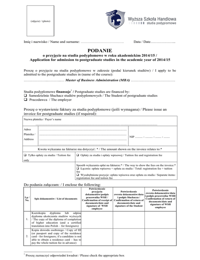 (zdjęcie) / (photo) Imię i nazwisko / Name and surname: ……………………………………. Data / Date………………... PODANIE o przyjęcie na studia podyplomowe w roku akademickim 2014/15 / Application for admission to postgraduate studies in the academic year of 2014/15 Proszę o przyjęcie na studia podyplomowe w zakresie (podać kierunek studiów) / I apply to be admitted to the postgraduate studies in (name of the course): ………………..………..… Master of Business Administration (MBA) ……………………………… Studia podyplomowe finansuje* / Postgraduate studies are financed by: Samodzielnie Słuchacz studiów podyplomowych / The Student of postgraduate studies Pracodawca / The employer Proszę o wystawienie faktury za studia podyplomowe (jeśli wymagana) / Please issue an invoice for postgraduate studies (if required): Nazwa płatnika / Payer’s name ................................................................................................................ ................................................. Adres …………………………............................................................................ Płatnika / .................................................................................................................... Address ………………………….………............................................................... NIP .......... - .......... - ........ - ........ .................................................................................................................... Kwota wykazana na fakturze ma dotyczyć: * / The amount shown on the invoice relates to:* Tylko opłaty za studia / Tuition fee Opłaty za studia i opłaty wpisowej / Tuition fee and registration fee only Sposób wykazania opłat na fakturze:* / The way to show the fees on the invoice:* Łącznie: opłata wpisowa + opłata za studia / Total: registration fee + tuition fee Wyodrębnione pozycje: opłata wpisowa oraz opłata za studia / Separate items: registration fee and tuition fee Do podania załączam: / I enclose the following: Lp / No. Spis dokumentów / List of documents 1. Kserokopia dyplomu lub odpisu dyplomu ukończenia studiów wyższych / The copy of the diploma of completion of higher education (and a certified translation into Polish – for foreigners) 2. Kopia dowodu osobistego / Copy of ID (or passport and copy of the residence card - for foreigners; if a candidate is not able to obtain a residence card – has to pay the whole tuition fee in advance) * Potwierdzenie Potwierdzenie przyjęcia Potwierdzenie zwrotu dokumentów/data dokumentów/podpis zwrotu dokumentów/data i podpis pracownika WSH/ pracownika WSH / i podpis Słuchacza / Confirmation of return of Confirmation of receipt of Confirmation of return of documents/date and documents/date and documents/date and signature of WSH signature of WSH signature of the Student employee employee Proszę zaznaczyć odpowiedni kwadrat / Please check the appropriate box 3. 1 zdjęcie (wymiar 35x45 mm) / 1 photo in paper form of 35x45 mm 4. Dowód wniesienia opłaty wpisowej / Confirmation of payment of registration fee ............................................................... (data i podpis Kandydata / Date and Candidate’s signature) Decyzja o przyjęciu na studia podyplomowe / Decision by the Recruitment Committee Na podstawie wyników postępowania kwalifikacyjnego, Kandydata przyjęto na studia zgodnie z podaniem. / According to the results of the qualification process the Candidate was admitted to the postgraduate studies according to the application. Dyrektor Programu MBA i Studiów Podyplomowych / MBA Program and Postgraduate Studies Director Wrocław, dnia / Wroclaw, on ……………………….………..…......