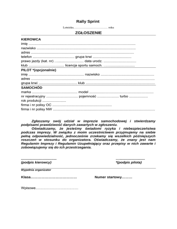 Rally Sprint Lotnisko, …………………………… roku ZGŁOSZENIE KIEROWCA imię ............................................................................................................ nazwisko .................................................................................................... adres ........................................................................................................ telefon .......................................... grupa krwi ....................................... prawo jazdy (kat. nr) ….......................... data urodz. ................................. klub .................................... licencja sportu samoch. …............................ PILOT *(opcjonalnie) imię ........................................................ nazwisko ...................................................... adres ............................................................................................................................. grupa krwi ....................................... klub ...................................................................... SAMOCHÓD marka .............................................. model ................................................................. nr rejestracyjny ................................ pojemność ...................... turbo ................... rok produkcji ........................ firma i nr polisy OC ............................................................ firma i nr polisy NW ....................................................................................................... Zgłaszamy swój udział w imprezie samochodowej i stwierdzamy podpisami prawdziwość danych zawartych w zgłoszeniu. Oświadczamy, że jesteśmy świadomi ryzyka i niebezpieczeństwa podczas imprezy. W związku z moim uczestnictwem przyjmujemy na siebie pełną odpowiedzialność, jednocześnie zrzekamy się wszelkich późniejszych roszczeń w stosunku do organizatora. Oświadczamy, że znany jest nam Regulamin Imprezy i Regulamin Uzupełniający oraz przepisy w nich zawarte i zobowiązujemy się do ich przestrzegania. .................................... (podpis kierowcy) ….......................... *(podpis pilota) Wypełnia organizator Klasa………………………………… Wpisowe……………………………… Numer startowy………