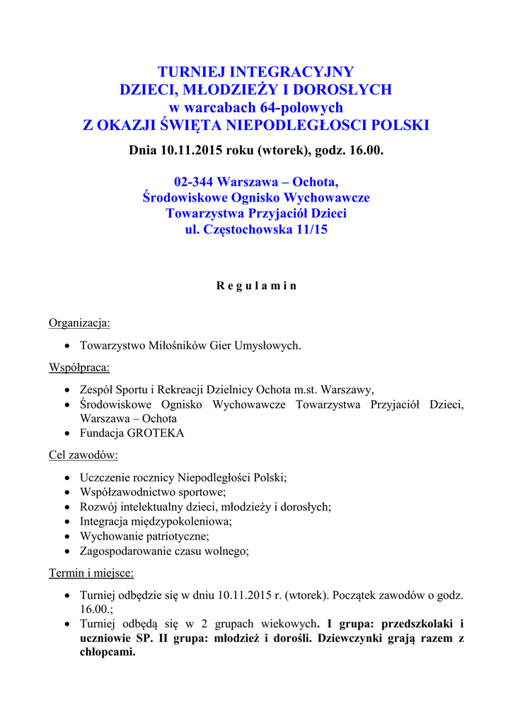 TURNIEJ INTEGRACYJNY DZIECI, MŁODZIEŻY I DOROSŁYCH w warcabach 64-polowych Z OKAZJI ŚWIĘTA NIEPODLEGŁOSCI POLSKI Dnia 10.11.2015 roku (wtorek), godz. 16.00. 02-344 Warszawa – Ochota, Środowiskowe Ognisko Wychowawcze Towarzystwa Przyjaciół Dzieci ul. Częstochowska 11/15 Regulamin Organizacja: Towarzystwo Miłośników Gier Umysłowych. Współpraca: Zespół Sportu i Rekreacji Dzielnicy Ochota m.st. Warszawy, Środowiskowe Ognisko Wychowawcze Towarzystwa Przyjaciół Dzieci, Warszawa – Ochota Fundacja GROTEKA Cel zawodów: Uczczenie rocznicy Niepodległości Polski; Współzawodnictwo sportowe; Rozwój intelektualny dzieci, młodzieży i dorosłych; Integracja międzypokoleniowa; Wychowanie patriotyczne; Zagospodarowanie czasu wolnego; Termin i miejsce: Turniej odbędzie się w dniu 10.11.2015 r. (wtorek). Początek zawodów o godz. 16.00.; Turniej odbędą się w 2 grupach wiekowych. I grupa: przedszkolaki i uczniowie SP. II grupa: młodzież i dorośli. Dziewczynki grają razem z chłopcami. Miejsce: 02-344 Warszawa – Ochota, Środowiskowe Ognisko Wychowawcze Towarzystwa Przyjaciół Dzieci, ul. Częstochowska 11/15 Warunki uczestnictwa: W turnieju mogą uczestniczyć wszyscy zainteresowani grą, dzieci, młodzież i dorośli; Udział w turnieju jest bezpłatny, ilość miejsc ograniczona, prosimy o wcześniejsze zgłoszenia; Przed rozpoczęciem turnieju należy wypełnić kartę startową; System rozgrywek: Turniej zostanie rozegrany systemem szwajcarskim kontrolowanym na dystansie 5 rund; Tempo gry wynosi 15 minut dla zawodnika na całkowite zakończenie partii. Nie obowiązuje prowadzenie zapisu. Nagrody: Puchary za zajęcie pierwszych trzech miejsc w każdym z turniejów; Nagrody rzeczowe dla najlepszych; Dyplomy. Uwagi końcowe: Ostateczna interpretacja niniejszego regulaminu należy do organizatora; Organizatorzy zapewniają bezpłatne napoje Wszelkich dodatkowych informacji udziela: Cezary Domińczak, tel.: 600727357, drogą elektroniczną: [email protected] Harmonogram godzinowy: Do godz. 16.00. Do godz. 16.10. - potwierdzenie obecności - ostateczne sprawdzenie listy startowej. Godz. 16.15. – 16.30. 16.30. – 17.00. 17.00. – 17.30. 17.30. – 18.00. 18.00. – 18.30. 18.30. - rozgrywki I rundy - rozgrywki II rundy - rozgrywki III rundy - rozgrywki IV rundy - rozgrywki V rundy - wręczenie nagród i zakończenie turnieju