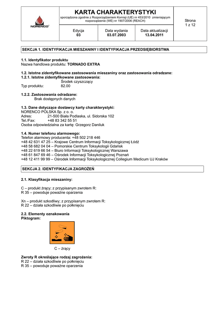 Kartę charakterystyki sporządzono zgodnie z Rozporządzeniem Komisji (UE) nr 453/2010 z dnia 20 maja