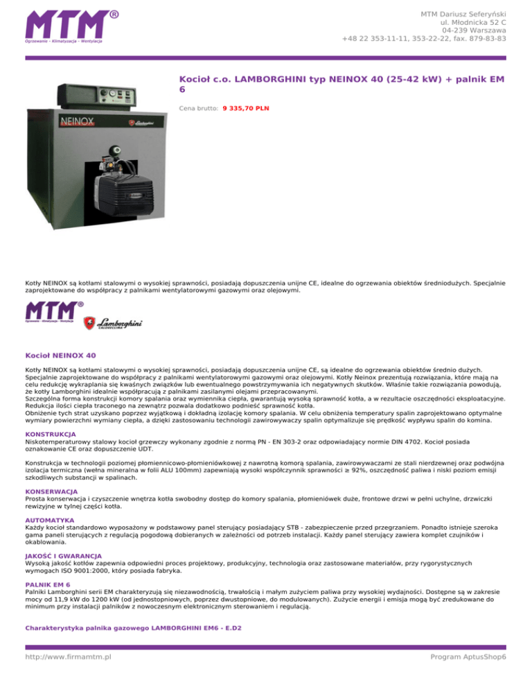 MTM Dariusz Seferyński ul. Młodnicka 52 C 04-239 Warszawa +48 22 353-11-11, 353-22-22, fax. 879-83-83 Kocioł c.o. LAMBORGHINI typ NEINOX 40 (25-42 kW) + palnik EM 6 Cena brutto: 9 335,70 PLN Kotły NEINOX są kotłami stalowymi o wysokiej sprawności, posiadają dopuszczenia unijne CE, idealne do ogrzewania obiektów średniodużych. Specjalnie zaprojektowane do współpracy z palnikami wentylatorowymi gazowymi oraz olejowymi. Kocioł NEINOX 40 Kotły NEINOX są kotłami stalowymi o wysokiej sprawności, posiadają dopuszczenia unijne CE, są idealne do ogrzewania obiektów średnio dużych. Specjalnie zaprojektowane do współpracy z palnikami wentylatorowymi gazowymi oraz olejowymi. Kotły Neinox prezentują rozwiązania, które mają na celu redukcję wykraplania się kwaśnych związków lub ewentualnego powstrzymywania ich negatywnych skutków. Właśnie takie rozwiązania powodują, że kotły Lamborghini idealnie współpracują z palnikami zasilanymi olejami przepracowanymi. Szczególna forma konstrukcji komory spalania oraz wymiennika ciepła, gwarantują wysoką sprawność kotła, a w rezultacie oszczędności eksploatacyjne. Redukcja ilości ciepła traconego na zewnątrz pozwala dodatkowo podnieść sprawność kotła. Obniżenie tych strat uzyskano poprzez wyjątkową i dokładną izolację komory spalania. W celu obniżenia temperatury spalin zaprojektowano optymalne wymiary powierzchni wymiany ciepła, a dzięki zastosowaniu technologii zawirowywaczy spalin optymalizuje się prędkość wypływu spalin do komina. KONSTRUKCJA Niskotemperaturowy stalowy kocioł grzewczy wykonany zgodnie z normą PN - EN 303-2 oraz odpowiadający normie DIN 4702. Kocioł posiada oznakowanie CE oraz dopuszczenie UDT. Konstrukcja w technologii poziomej płomiennicowo-płomieniówkowej z nawrotną komorą spalania, zawirowywaczami ze stali nierdzewnej oraz podwójna izolacja termiczna (wełna mineralna w folii ALU 100mm) zapewniają wysoki współczynnik sprawności ≥ 92%, oszczędność paliwa i niski poziom emisji szkodliwych substancji w spalinach. KONSERWACJA Prosta konserwacja i czyszczenie wnętrza kotła swobodny dostęp do komory spalania, płomieniówek duże, frontowe drzwi w pełni uchylne, drzwiczki rewizyjne w tylnej części kotła. AUTOMATYKA Każdy kocioł standardowo wyposażony w podstawowy panel sterujący posiadający STB - zabezpieczenie przed przegrzaniem. Ponadto istnieje szeroka gama paneli sterujących z regulacją pogodową dobieranych w zależności od potrzeb instalacji. Każdy panel sterujący zawiera komplet czujników i okablowania. JAKOŚĆ I GWARANCJA Wysoką jakość kotłów zapewnia odpowiedni proces projektowy, produkcyjny, technologia oraz zastosowane materiałów, przy rygorystycznych wymogach ISO 9001:2000, który posiada fabryka. PALNIK EM 6 Palniki Lamborghini serii EM charakteryzują się niezawodnością, trwałością i małym zużyciem paliwa przy wysokiej wydajności. Dostępne są w zakresie mocy od 11,9 kW do 1200 kW (od jednostopniowych, poprzez dwustopniowe, do modulowanych). Zużycie energii i emisja mogą być zredukowane do minimum przy instalacji palników z nowoczesnym elektronicznym sterowaniem i regulacją. Charakterystyka palnika gazowego LAMBORGHINI EM6 - E.D2 http://www.firmamtm.pl Program AptusShop6 MTM Dariusz Seferyński ul. Młodnicka 52 C 04-239 Warszawa +48 22 353-11-11, 353-22-22, fax. 879-83-83 palniki jednostopniowe (EM), przeznaczone do kotłów ciśnieniowych, mogą być zastosowane do nowych instalacji, jak również do przebudowy i modernizacji starych kotłów, ścieżka gazowa ze stabilizatorem, podwójny zawór i filtr, niska emisja CO2, regulacja głowicy spalania (poza modelem EM 26-E - EM 35-E), wyciszona obudowa, kompaktowy rozmiar, uniwersalność dzięki możliwości podłączenia różnego rodzaju gazu, dostarczany w 2 opakowaniach (palnik + rampa gazowa), łatwy montaż dzięki ruchomemu kołnierzowi, zasilanie: gaz ziemny lub LPG (dla modelu EM 16-E - 26-E potrzebny jest zestaw do konwersji). W skład zestawu wliczone są również niezbędne akcesoria takie jak: Flansza montażowa Śruby mocowania flanszy Uszczelka flanszy Reduktor gazu z przyłączem 1/2'' Wtyk gniazda EURO (Euro 7-pin) Instrukcja Obsługi Dokumentacja Techniczna (DTR) Do ostatecznego uruchomienia palnika potrzebne są (do nabycia oddzielnie w sklepie MTM): Doprowadzona instalacja gazowa Komin Dane techniczne KOCIOŁ NEINOX 40 Zakres mocy cieplnej Sprawność Średnica wylotu spalin Pojemność wodna kotła Wymiary (dł. x szer. x wys.) Masa kotła z izolacją i obudową PALNIK EM6 Zakres mocy palnika Napięcie Moc znamionowa silnika Moc zasilania Waga Paliwo Ciśnienie gazu http://www.firmamtm.pl Powered by TCPDF (www.tcpdf.org) 25-42 kW 91,3 % 180 mm 66 l. 920x660x760 mm 160 kg 27-66,6 kW 230V/50Hz 100 W 280 W 11,5 kg Gaz ziemny 20 mbar Program AptusShop6