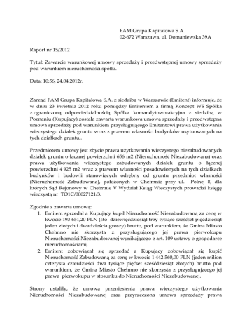 FAM Grupa Kapitałowa S.A. 02-672 Warszawa, ul. Domaniewska 39A Raport nr 15/2012 Tytuł: Zawarcie warunkowej umowy sprzedaży i przedwstępnej umowy sprzedaży pod warunkiem nieruchomości spółki. Data: 10:56, 24.04.2012r. Zarząd FAM Grupa Kapitałowa S.A. z siedzibą w Warszawie (Emitent) informuje, że w dniu 23 kwietnia 2012 roku pomiędzy Emitentem a firmą Koncept WS Spółka z ograniczoną odpowiedzialnością Spółka komandytowo-akcyjna z siedzibą w Poznaniu (Kupujący) została zawarta warunkowa umowa sprzedaży i przedwstępna umowa sprzedaży pod warunkiem przysługującego Emitentowi prawa użytkowania wieczystego działek gruntu wraz z prawem własności budynków usytuowanych na tych działkach gruntu,. Przedmiotem umowy jest zbycie prawa użytkowania wieczystego niezabudowanych działek gruntu o łącznej powierzchni 656 m2 (Nieruchomość Niezabudowana) oraz prawa użytkowania wieczystego zabudowanych działek gruntu o łącznej powierzchni 4 925 m2 wraz z prawem własności posadowionych na tych działkach budynków i budowli stanowiących odrębny od gruntu przedmiot własności (Nieruchomość Zabudowana), położonych w Chełmnie przy ul. Polnej 8, dla których Sąd Rejonowy w Chełmnie V Wydział Ksiąg Wieczystych prowadzi księgę wieczystą nr TO1C/00027121/3. Zgodnie z zawarta umową: 1. Emitent sprzedał a Kupujący kupił Nieruchomość Niezabudowaną za cenę w kwocie 193 651,20 PLN (sto dziewięćdziesiąt trzy tysiące sześćset pięćdziesiąt jeden złotych i dwadzieścia groszy) brutto, pod warunkiem, że Gmina Miasto Chełmno nie skorzysta z przysługującego jej prawa pierwokupu Nieruchomości Niezabudowanej wynikającego z art. 109 ustawy o gospodarce nieruchomościami, 2. Emitent zobowiązał się sprzedać a Kupujący zobowiązał się kupić Nieruchomość Zabudowaną za cenę w kwocie 1 442 560,00 PLN (jeden milion czterysta czterdzieści dwa tysiące pięćset sześćdziesiąt złotych) brutto pod warunkiem, że Gmina Miasto Chełmno nie skorzysta z przysługującego jej prawa pierwokupu w stosunku do Nieruchomości Niezabudowanej. Strony ustaliły, że umowa przeniesienia prawa wieczystego użytkowania Nieruchomości Niezabudowanej oraz przyrzeczona umowa sprzedaży prawa wieczystego użytkowania Nieruchomości Zabudowanej (dalej: Umowa Sprzedaży) zostaną zawarte w terminie 14 (czternastu) dni od dnia otrzymania oświadczenia Gminy Miasta Chełmna o nieskorzystaniu z prawa pierwokupu lub upływu terminu do wykonania tego prawa, nie później jednak niż do dnia 16 lipca 2012r. Cena sprzedaży za Nieruchomość Niezabudowaną i Nieruchomość Zabudowaną w łącznej kwocie 1 636 211,20 PLN (jeden milion sześćset trzydzieści sześć tysięcy dwieście jedenaście tysięcy złotych i dwadzieścia groszy) brutto zostanie zapłacona przez Kupującego z depozytu notarialnego na rachunek bankowy wskazany przez Emitenta, w terminie 1 (jednego) dnia roboczego od dnia zawarcia Umowy Sprzedaży. Część ceny sprzedaży w kwocie 800 000 PLN została w dniu zawarcia warunkowej umowy sprzedaży i przedwstępnej umowy sprzedaży pod warunkiem, wpłacona przez Kupującego do depozytu notarialnego i pozostanie tam do chwili wymagalności płatności. Pozostała część ceny tj. kwota 836 211,20 PLN zostanie wpłacona do depozytu notariusza na co najmniej 1 dzień roboczy przed dniem zawarcia Umowy Sprzedaży i pozostanie tam do chwili wymagalności płatności. W przypadku uchybienia przez Kupującego obowiązkowi złożenia do depozytu notariusza całości ceny za Nieruchomość Niezabudowaną i Nieruchomość Zabudowaną we wskazanym terminie, Emitent wezwie Kupującego do wykonania tego obowiązku w terminie 3 dni roboczych od dnia otrzymania wezwania pod rygorem odstąpienia od Umowy Sprzedaży, zaś po bezskutecznym upływie tego terminu będzie uprawniony do odstąpienia od Umowy Sprzedaży w terminie 14 dni od dnia upływu wyznaczonego terminu. Strony ponadto ustaliły, że w przypadku gdy przed dniem zawarcia Umowy Sprzedaży wejdzie w życie zmiana miejscowego planu zagospodarowania przestrzennego dla terenu Nieruchomości Niezabudowanej i Nieruchomości Zabudowanej, niezależnie od zapłaty ceny za Nieruchomość Niezabudowaną i Nieruchomość Zabudowaną, Kupujący zobowiązuje się pokryć koszty opłaty, o której mowa w art. 36 ust. 4 ustawy o planowaniu i zagospodarowaniu przestrzennym (Opłata), ustalonej ostateczną decyzją wydaną w związku ze zbyciem Nieruchomości Niezabudowanej i Nieruchomości Zabudowanej (w tym poszczególnych działek wchodzących w ich skład) przez Emitenta na rzecz Kupującego, lecz do wysokości nie wyższej niż 250 000 PLN (dwieście pięćdziesiąt tysięcy złotych). Zapłata przez Kupującego kwoty poniesionej przez Emitenta Opłaty, o której mowa w art. 36 ust. 4 ustawy o planowaniu i zagospodarowaniu przestrzennym do wysokości nie wyższej niż 250 000 PLN nastąpi w terminie 21 dni od dnia doręczenia Kupującemu decyzji ustalającej Opłatę z klauzulą ostateczności i przedłożeniu przez Emitenta dowodu zapłaty Opłaty. W przypadku uchybienia przez Kupującego terminowi zapłaty Opłaty, Emitentowi przysługiwać będą odsetki ustawowe za okres opóźnienia. Dla zabezpieczenia ewentualnego zwrotu Opłaty w wysokości nie wyższej niż 250 000 PLN wraz z ewentualnymi odsetkami z tytułu opóźnienia, w przypadku gdy w terminie do dnia zawarcia Umowy Sprzedaży wejdzie w życie zmiana miejscowego planu zagospodarowania przestrzennego dla terenu Nieruchomości Niezabudowanej i Nieruchomości Zabudowanej, Kupujący zobowiązał się w Umowie Sprzedaży poddać się egzekucji z aktu notarialnego do kwoty 300 000 PLN (trzysta tysięcy złotych) na podstawie artykułu 777 § 1 pkt 5 Kodeksu postępowania cywilnego. Podstawa prawna: art. 56 ust. 1 pkt 1 ustawy z dnia 29 lipca 2005 r. o ofercie publicznej i warunkach wprowadzania instrumentów finansowych do zorganizowanego systemu obrotu oraz o 
