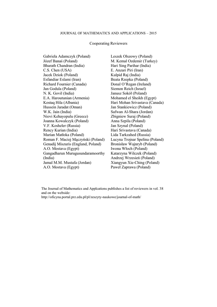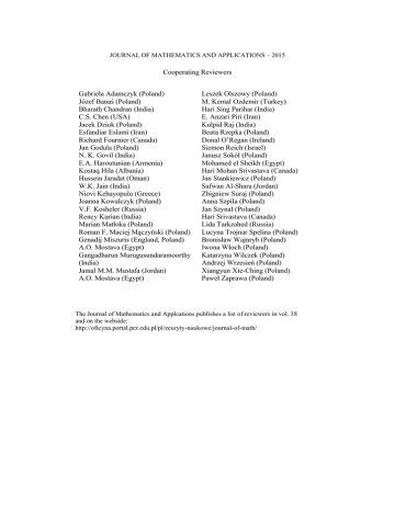 JOURNAL OF MATHEMATICS AND APPLICATIONS – 2015 Cooperating Reviewers Gabriela Adamczyk (Poland) Józef Banaś (Poland) Bharath Chandran (India) C.S. Chen (USA) Jacek Dziok (Poland) Esfandiar Eslami (Iran) Richard Fournier (Canada) Jan Godula (Poland) N. K. Govil (India) E.A. Haroutunian (Armenia) Kostaq Hila (Albania) Hussein Jaradat (Oman) W.K. Jain (India) Niovi Kehayopulu (Greece) Joanna Kowalczyk (Poland) V.F. Kosheler (Russia) Rency Kurian (India) Marian Matłoka (Poland) Roman F. Maciej Mączyński (Poland) Genadij Miszuris (England, Poland) A.O. Mostava (Egypt) Gangadharun Murugusundaramoorthy (India) Jamal M.M. Mustafa (Jordan) A.O. Mostava (Egypt) Leszek Olszowy (Poland) M. Kemal Ozdemir (Turkey) Hari Sing Parihar (India) E. Anzari Piri (Iran) Kulpid Raj (India) Beata Rzepka (Poland) Donal O’Regan (Ireland) Siemon Reich (Israel) Janusz Sokół (Poland) Mohamed el Sheikh (Egypt) Hari Mohan Srivastava (Canada) Jan Stankiewicz (Poland) Safwan Al-Shara (Jordan) Zbigniew Suraj (Poland) Anna Szpila (Poland) Jan Szynal (Poland) Hari Srivastava (Canada) Lida Tarkzahed (Russia) Lucyna Trojnar Spelina (Poland) Bronisław Wajnryb (Poland) Iwona Włoch (Poland) Katarzyna Wilczek (Poland) Andrzej Wrzesień (Poland) Xiangyun Xie-Ching (Poland) Paweł Zaprawa (Poland) The Journal of Mathematics and Applcations publishes a list of reviewers in vol. 38 and on the webside: http://oficyna.portal.prz.edu.pl/pl/zeszyty-naukowe/journal-of-math/