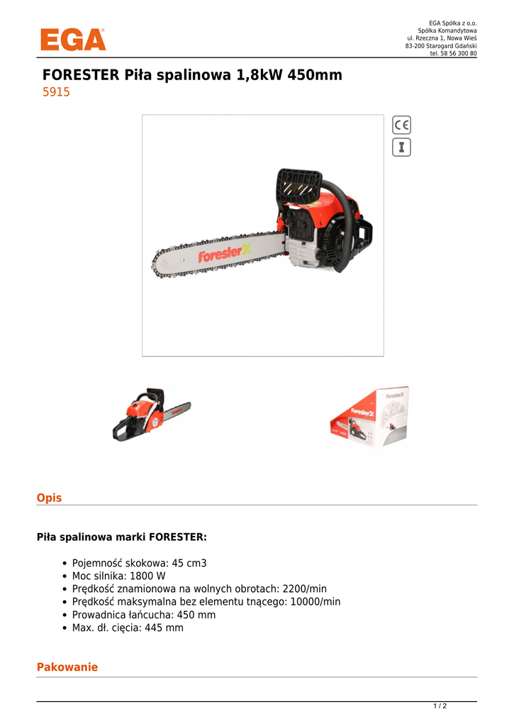 EGA Spółka z o.o. Spółka Komandytowa ul. Rzeczna 1, Nowa Wieś 83-200 Starogard Gdański tel. 58 56 300 80 FORESTER Piła spalinowa 1,8kW 450mm 5915 Opis Piła spalinowa marki FORESTER: Pojemność skokowa: 45 cm3 Moc silnika: 1800 W Prędkość znamionowa na wolnych obrotach: 2200/min Prędkość maksymalna bez elementu tnącego: 10000/min Prowadnica łańcucha: 450 mm Max. dł. cięcia: 445 mm Pakowanie 1/2 EGA Spółka z o.o. Spółka Komandytowa ul. Rzeczna 1, Nowa Wieś 83-200 Starogard Gdański tel. 58 56 300 80 Jednostkowe Karton: 1 szt. Warianty Lp. Nr katalogowy 1 5915 EAN 2/2 Powered by TCPDF (www.tcpdf.org)