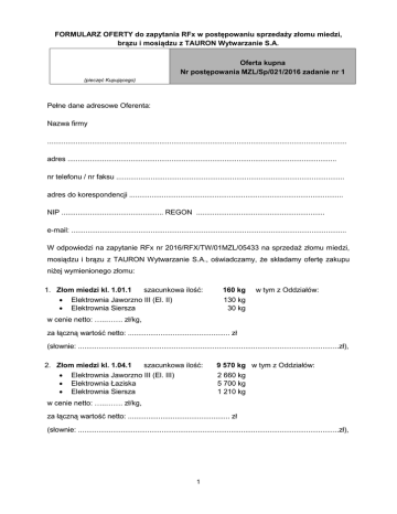 FORMULARZ OFERTY do zapytania RFx w postępowaniu sprzedaży złomu miedzi, brązu i mosiądzu z TAURON Wytwarzanie S.A. Oferta kupna Nr postępowania MZL/Sp/021/2016 zadanie nr 1 (pieczęć Kupującego) Pełne dane adresowe Oferenta: Nazwa firmy ................................................................................................................................................... adres .................................................................................................................................... nr telefonu / nr faksu ................................................................................................................ adres do korespondencji ......................................................................................................... NIP .................................................. REGON ............................................................... e-mail: ....................................................................................................................................... W odpowiedzi na zapytanie RFx nr 2016/RFX/TW/01MZL/05433 na sprzedaż złomu miedzi, mosiądzu i brązu z TAURON Wytwarzanie S.A., oświadczamy, że składamy ofertę zakupu niżej wymienionego złomu: 1. Złom miedzi kl. 1.01.1 szacunkowa ilość: Elektrownia Jaworzno III (El. II) Elektrownia Siersza 160 kg 130 kg 30 kg w tym z Oddziałów: w cenie netto: …..……. zł/kg, za łączną wartość netto: .................................................. zł (słownie: ................................................................................................................................zł), 2. Złom miedzi kl. 1.04.1 szacunkowa ilość: Elektrownia Jaworzno III (El. III) Elektrownia Łaziska Elektrownia Siersza 9 570 kg w tym z Oddziałów: 2 660 kg 5 700 kg 1 210 kg w cenie netto: …..……. zł/kg, za łączną wartość netto: .................................................. zł (słownie: ................................................................................................................................zł), 1 3. Złom mosiądzu kl. 1.12.1 szacunkowa ilość: Elektrownia Jaworzno III (El. III) 200 kg 200 kg z Oddziału: w cenie netto: …..……. zł/kg, za łączną wartość netto: .................................................. zł (słownie: ................................................................................................................................zł), 4. Złom brązu kl. 1.13.6 szacunkowa ilość: Elektrownia Jaworzno III (El. III) 35 kg 35 kg z Oddziału: w cenie netto: …..……. zł/kg, za łączną wartość netto: .................................................. zł (słownie: ................................................................................................................................zł). Łączna wartość netto za cały przedmiot zamówienia (poz. 1, 2, 3 i 4): netto: .....................................zł (słownie: ...............................................................................................................................zł). Oświadczenia Oferenta: Oświadczamy, że uważamy się za związanych niniejszą ofertą do 60 dni od daty zakończenia postępowania. Deklarujemy dokonywanie przedpłat (zaliczek) na zakup złomu w formie przelewu przed odbiorem złomu. Oświadczamy, że zapoznaliśmy się z projektem umowy oraz zobowiązujemy się do jej podpisania w przypadku wyboru naszej oferty, pod rygorem utraty wadium. Deklaracja o odbiorze planowanej do sprzedaży ilości złomu w terminie wskazanym przez Sprzedającego w ust 1. Ogłoszenia. Oświadczamy, że dokonaliśmy oględzin złomu. Oświadczamy, że treść dokumentów załączonych do oferty jest zgodna ze stanem faktycznym. W złączeniu (w postaci plików dołączonych do oferty): skan potwierdzenia wpłaty wadium, skan aktualnego odpisu KRS lub z CEiDG skan aktualnego zaświadczenia o nadaniu numerów NIP, REGON, skan aktualnego zezwolenia na prowadzenie działalności w zakresie zbierania odpadów skan aktualnego zezwolenia na transportu odpadów lub oświadczenie o zleceniu usługi transportowej podwykonawcy wraz z kserokopią jego aktualnego zezwolenia na transport w/w odpadów, skan aktualnej polisy ubezpieczenia OC w zakresie prowadzonej działalności. ........................................... dnia ......................... (miejscowość) .............................................................. (podpis Oferenta lub jego pełnomocnika) 2