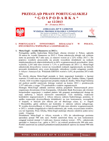 PRZEGLĄD PRASY PORTUGALSKIEJ *GOSPODARKA* nr 12/2013 18 – 24 marca 2013 r. AMBASADA RP W LIZBONIE WYDZIAŁ PROMOCJI HANDLU I INWESTYCJI Rua António de Saldanha Nº 48/ Lizbona/Portugalia Tel. (00351) 21 301 33 27/ Fax. (00351) 21 301 28 70 e-mail:[email protected], www.lisbon.trade.gov.pl I. PORTUGALSCY INWESTORZY DZIAŁAJĄCY DWUSTRONNA WSPÓŁPRACA GOSPODARCZA W POLSCE, 1. Mota-Engil – wyniki finansowe za 2012 r. Portugalska spółka budowlana Mota-Engil, obecna również w Polsce, ogłosiła 20 marca br. wyniki finansowe za 2012 r. Firma zakończyła ubiegły rok zyskiem netto na poziomie 40,7 mln euro, co stanowi wzrost aż o 22% wobec 2011 r. Do poprawy wyników przyczyniła się przede wszystkim działalność na rynkach międzynarodowych odpowiedzialnych za 66% wygenerowanych przychodów, które wyniosły 2,243 mld euro (wzrost o 7,1% w porównaniu do 2011 r.). Mota-Engil odnotowała dwucyfrowy wzrost na wszystkich rynkach zagranicznych, na których prowadzi działalność, przy czym doskonałe, rekordowe wyniki osiągnięte zostały w Afryce i Ameryce Łac. Wskaźnik EBITDA wzrósł o 3,6%, do poziomu 287,4 mln euro. Na chwilę obecną Mota-Engil posiada w fazie negocjacji kontrakty o łącznej wartości 3,9 mld euro na rynkach afrykańskich takich, jak: Zambia, Ghana, Uganda i Kenia. Jeśli wszystkie negocjowane projekty dojdą do skutku, Mota-Engil bardziej niż podwoi portfel zamówień, którego wartość na koniec 2012 r. przekroczyła 3,357 mld euro, z czego 77% pochodziło z rynków zagranicznych. Strategia Mota-Engil zakłada zarówno analizę projektów finansowanych przez organizacje dwustronne (Unia Europejska, Afrykański Bank Rozwoju), jak również bezpośrednie negocjacje z rządami państw lub grupami posiadającymi dostęp do ropy naftowej i innych surowców naturalnych. Tym niemniej, większość kontraktów negocjowanych w Afryce dotyczy sektora budowlanego, pomimo, iż spółka rozpoczęła dywersyfikację działalności na tym kontynencie, szczególnie w krajach, w których jest obecna już od dłuższego czasu, tj.: w Angoli i Mozambiku, gdzie zdobywa już kontrakty w zakresie sektora usługowego. W wyniku dywersyfikacji, w Afryce ponad 50 mln euro obrotów wygenerowanych w 2012 r. zostało osiągniętych w takich sektorach, jak: woda, oczyszczanie ścieków, czy też logistyka. Poza Afryką, Mota-Engil analizuje obecnie zaledwie jeden nowy rynek – Urugwaj. Działalność Mota-Engil w Afryce wzrosła o 19% do rekordowego poziomu sprzedaży ponad 700 mln euro. Portfel zamówień firmy na tym kontynencie osiągnął wartość niemal 1,5 mld euro. Jeszcze większy wzrost – 93% - odnotowała sprzedaż w Ameryce Łac., gdzie w 2012 r. jej wartość przekroczyła 300 mln euro. Portfel zamówień na rynkach południowoamerykańskich opiewa na niemal 900 mln euro. WPHI AMBASADY RP W LIZBONIE Strona 1 PRZEGLĄD PRASY PORTUGALSKIEJ “GOSPODARKA” - nr 12/2013 Działalność Mota-Engil na rynku portugalskim skurczyła się o 17% pomimo, iż spółka w dalszym ciągu zwiększa swój udział w rynku. Drugim obszarem o niezbyt korzystnych wynikach w 2012 r. był region Europy Centralnej, gdzie pomimo wzrostu wartości sprzedaży o 12% do poziomu ponad 400 mln euro, wskaźnik EBITDA był negatywny. (Vida Económica, Diário Económico, Jornal de Negócios) 2. Jerónimo Martins Pomimo wcześniejszych zapowiedzi, Alexandre Soares dos Santos pozostanie na czele zarządu grupy Jerónimo Martins (JM) przez okres najbliższych 3 lat. Ostatecznie, decyzja w tym zakresie zostanie podjęta przez akcjonariuszy grupy podczas Walnego Zgromadzenia zaplanowanego na 10 kwietnia br. Alexandre Soares dos Santos stoi na czele JM od 1996 r. (Vida Económica, Diário de Notícias, Diário Económico, Expresso) 3. Banco Comercial Português BCP Po rocznej nieobecności bank BCP powrócił do STOXX Europe 600, indeksu skupiającego 600 największych spółek europejskich. Tym samym Portugalia wzmocniła swoją obecność w indeksie posiadając reprezentację 6 spółek: BES, EDP, Galp Energia, Jerónimo Martins, Portugal Telecom i BCP. (Diário de Notícias, Diário Económico) 4. Internacjonalizacja spółki Energias de Portugal EDP Spółka energetyczna EDP analizuje rynek mozambicki i angolański pod kątem możliwości w sektorze tradycyjnej produkcji energii elektrycznej. EDP wskazuje na szacunki dot. wzrostu rocznego zużycia energii elektrycznej w Mozambiku na poziomie 10% w latach 2013 – 2020, głównie w związku z niedawnym odkryciem złóż naftowych. Spółka przygląda się również rynkom krajów takich, jak: Meksyk, Peru i Kolumbia. Działania na rzecz zwiększenia internacjonalizacji podyktowane są silnie ograniczonymi możliwościami na rynku wewnętrznym. (Diário de Notícias - Dinheiro Vivo) 5. Grupa Finansowa Espírito Santo - wyniki finansowe za 2012 r. Grupa Finansowa Espírito Santo (Espírito Santo Financial Group), kontrolująca bezpośrednio i pośrednio 27% udziałów banku BES, wygenerowała w 2012 r. zyski o wartości 313,6 mln euro. Jednocześnie, zysk wypracowany przez bank BES wyniósł 96,1 mln euro. Holding BES zawdzięcza zysk pozytywnym rezultatom pionu ubezpieczeniowego, który wygenerował wyniki znacznie przewyższające te zarejestrowane przez bank. Dobre wyniki działalności bankowej i ubezpieczeniowej holdingu zostały dodatkowo wzmocnione przez nabycie pozostałych 50% udziałów w spółce BES Vida, które BES kosztem 54,1 mln euro zakupił od Crédit Agricole. Kolejnym czynnikiem mającym pozytywny wpływ na wyniki holdingu było wyłączenie wyników spółki Espírito Santo Saúde (właściciela szpitali), kontrola nad którą została przekazana na rzecz holdingu niefinansowego Rio Forte. Pomimo wzrostu zysków BES pogorszyły się wyniki z działalności międzynarodowej. BES África odnotowała spadek zysku o 62,8% do poziomu 33,9 mln euro, w Brazylii zyski banku spadły o 45,8% do 11,1 mln euro, a w Stanach Zjednoczonych o 59,