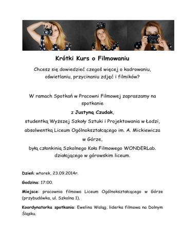 Krótki Kurs o Filmowaniu Chcesz się dowiedzieć czegoś więcej o kadrowaniu, oświetlaniu, przycinaniu zdjęć i filmików? W ramach Spotkań w Pracowni Filmowej zapraszamy na spotkanie z Justyną Czudak, studentką Wyższej Szkoły Sztuki i Projektowania w Łodzi, absolwentką Liceum Ogólnokształcącego im. A. Mickiewicza w Górze, byłą członkinią Szkolnego Koła Filmowego WONDERLab. działającego w górowskim liceum. Dzień: wtorek, 23.09.2014r. Godzina: 17:00. Miejsce: pracownia filmowa Liceum Ogólnokształcącego w Górze (przybudówka, ul. Szkolna 1). Koordynatorka spotkania: Ewelina Waląg, liderka filmowa na Dolnym Śląsku. Jeśli masz lustrzankę lub inny aparat – weź je ze sobą! Tematyka spotkania: 1. Klatka = zdjęcie. 2. Lustrzanka i kompakt. 3. Strefa Trzech Magicznych Pojęć (przesłona, ISO, czas naświetlania). 4. Twój Biały Brzmi Niebiesko. Balans bieli i możliwość jego naprawienia, zmiany. 5. Oświeć mnie! Lampa błyskowa zewnętrzna a lampa wbudowana. 6. Dodaj Zooma! (zoom, ogniskowa). 7. Oko Aparatu (obiektywy zmienno ogniskowe, obiektywy stało ogniskowe). 8. Kadrowałabym (rodzaje kadrów). 9. Złoty podział. 10. Mocne Punkty. 11. Czemu Patrzysz Na Mnie z Góry? Perspektywy. 12. Wreszcie Film! Ruchy kamery. 13. Ośś Kurczaki! Nieprzekraczalność osi. Zapraszamy na stronę Szkolnego Koła Filmowego WONDERLab. i do współpracy: http://balladynafilm.wix.com/wonderlab1