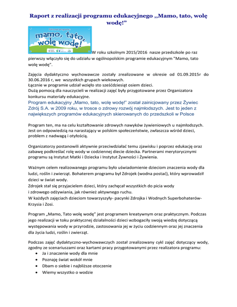Raport z realizacji programu edukacyjnego ,,Mamo, tato, wolę wodę!” W roku szkolnym 2015/2016 nasze przedszkole po raz pierwszy włączyło się do udziału w ogólnopolskim programie edukacyjnym "Mamo, tato wolę wodę". Zajęcia dydaktyczno wychowawcze zostały zrealizowane w okresie od 01.09.2015r do 30.06.2016 r, we wszystkich grupach wiekowych. Łącznie w programie udział wzięło sto sześćdziesiąt osiem dzieci. Dużą pomocą dla nauczycieli w realizacji zajęć były przygotowane przez Organizatora konkursu materiały edukacyjne. Program edukacyjny „Mamo, tato, wolę wodę!” został zainicjowany przez Żywiec Zdrój S.A. w 2009 roku, w trosce o zdrowy rozwój najmłodszych. Jest to jeden z największych programów edukacyjnych skierowanych do przedszkoli w Polsce Program ten, ma na celu kształtowanie zdrowych nawyków żywieniowych u najmłodszych. Jest on odpowiedzią na narastający w polskim społeczeństwie, zwłaszcza wśród dzieci, problem z nadwagą i otyłością. Organizatorzy postanowili aktywnie przeciwdziałać temu zjawisku i poprzez edukację oraz zabawę podkreślać rolę wody w codziennej diecie dziecka. Partnerami merytorycznymi programu są Instytut Matki i Dziecka i Instytut Żywności i Żywienia. Ważnym celem realizowanego programu było uświadomienie dzieciom znaczenia wody dla ludzi, roślin i zwierząt. Bohaterem programu był Zdrojek (wodna postać), który wprowadził dzieci w świat wody. Zdrojek stał się przyjacielem dzieci, który zachęcał wszystkich do picia wody i zdrowego odżywiania, jak również aktywnego ruchu. W każdych zajęciach dzieciom towarzyszyły- pacynki Zdrojka i Wodnych SuperbohaterówKrzysia i Zosi. Program „Mamo, Tato wolę wodę” jest programem kreatywnym oraz praktycznym. Podczas jego realizacji w toku praktycznej działalności dzieci wzbogaciły swoją wiedzę dotyczącą występowania wody w przyrodzie, zastosowania jej w życiu codziennym oraz jej znaczenia dla życia ludzi, roślin i zwierząt. Podczas zajęć dydaktyczno-wychowawczych został zrealizowany cykl zajęć dotyczący wody, zgodny ze scenariuszami oraz kartami pracy przygotowanymi przez realizatora programu: Ja i znaczenie wody dla mnie Poznaję świat wokół mnie Dbam o siebie i najbliższe otoczenie Wiemy wszystko o wodzie W naszym przedszkolu przez cały rok szkolny 2015/2016 w każda środa – to Dzień Marchewki. W każdej przedszkolnej sali stoi dystrybutor z wodą. Przedszkolaki w ciągu dnia mają stały dostęp do wody i możliwość korzystania gdy mają ochotę. Program „Mamo, tato, wolę wodę!” pomógł utrwalić nawyk picia wody. Dodatkowo - Rodzice zostali poinformowani poprzez stronę internetową przedszkola o udziale przedszkola w realizacji Programu edukacyjnego „Mamo, tato wolę wodę” i tym samym zaproszeni do wspólnej z dziećmi zabawy. W ramach realizacji obranych na ten rok szkolny priorytetów związanych z edukacją prozdrowotną nasze przedszkole przystąpiło do realizacji dodatkowych programów z zakresu promocji zdrowia: - „My i ekologia, czyli bajkowa przyroda wokół nas” , Edukacja ekologiczna – Zielona flaga, Program ekologiczny- „ A ja rosnę i rosnę….”-, Program profilaktyki i Promocji zdrowia, Program wychowawczy, Program „ Akademii Aquafresh, Program ogólnopolski „ Kubusiowi Przyjaciele Natury”. Dzieci były również na wycieczce (Wodociągi i Kanalizacja” Hydrokom Kluczbork) – zwiedzanie z przewodnikiem oczyszczalni ścieków w Ligocie Górnej i zabytkowej stacji uzdatniania wody w Kluczborku (w ramach DNI OTWARTYCH Funduszy Europejskich). Programy te łączyły ze sobą teorię z praktyką- dzieci poszerzyły własne horyzonty, odkrywały tajemnice przyrody poprzez obserwacje i eksperymenty. Prowadzone w naszej społeczności przedszkolnej liczne działania mają na celu podniesienie świadomości dzieci i całej społeczności lokalnej dbania o otaczającą nas przyrodę. Poprzez wspólną zabawę oraz podejmowanie różnorodnych aktywności, dzieci zdobyły wiele cennych informacji, które będą mogły zastosować w praktyce np. wiedzą jakie znaczenie ma woda dla zdrowia człowieka. Ponadto przedszkolaki poprzez praktyczne działania poszerzyły swoją wiedzę na temat roli wody, właściwego odżywania oraz aktywności fizycznej dla zdrowia i dobrego samopoczucia. Aktywny udział w zajęciach, projektowanie prac i powiązane z tematem zabawy ruchowe pozwoliły dzieciom poszerzyć wiadomości i rozwinąć umiejętności artystyczne oraz wdrażał do zgodnego i harmonijnego działania w grupie. Podczas realizacji tego programu dzieci nie tylko dowiedziały się czym jest woda dla człowieka, ale również miały możliwość praktycznego działania co w dużej mierze znacznie ułatwiło poznawanie i nabywanie nowych umiejętności. W ramach Programu dzieci realizowały także cykl zabaw i ćwiczeń gimnastycznych. Aktywności ruchowe dostarczyły przedszkolakom nie tylko nowych umiejętności i wiedzy, ale również wiele pozytywnych emocji. Pomiędzy ćwiczeniami wychowawczynie przypominały o utracie wody z organizmu i konieczności uzupełniania jej niedoboru. Dzieci bardzo chętnie piły wodę jednocześnie uświadamiając sobie, że: „aby zdrowo żyć trzeba wodę często pić”. Szczegółowo opisane cele, metody, formy pracy oraz niezbędne materiały pomocnicze ułatwiły przygotowanie się nauczyciela do zajęć oraz jej przeprowadzenie. Realizacja scenariuszy zajęć sprawiła dzieciom ogromną radość. Podsumowując należy podkreślić, że przeprowadzony program jest doskonałym przykładem kształtowania prozdrowotnych nawyków żywieniowych wśród najmłodszych. Poprzez wspólną zabawę oraz podejmowanie różnorodnych aktywności, dzieci zdobyły wiele cennych informacji, które będą mogły zastosować w praktyce. Dzieci poprzez praktyczne działania poszerzyły swoją wiedzę na temat roli wody, właściwego odżywania oraz aktywności