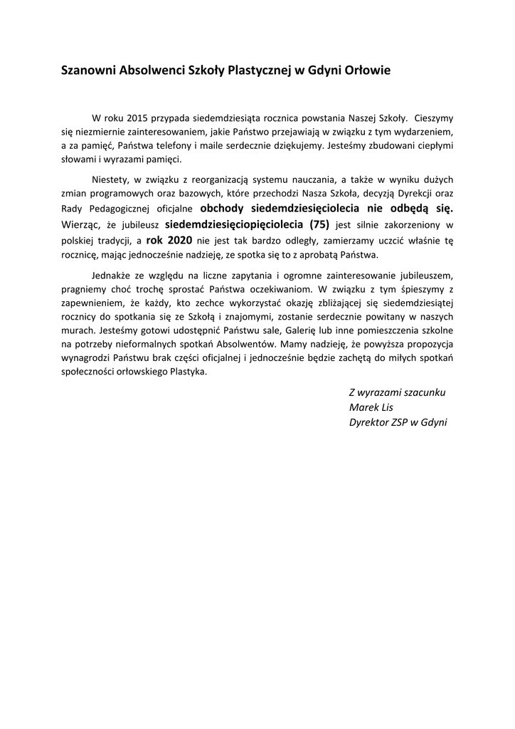 Szanowni Absolwenci Szkoły Plastycznej w Gdyni Orłowie W roku 2015 przypada siedemdziesiąta rocznica powstania Naszej Szkoły. Cieszymy się niezmiernie zainteresowaniem, jakie Państwo przejawiają w związku z tym wydarzeniem, a za pamięć, Państwa telefony i maile serdecznie dziękujemy. Jesteśmy zbudowani ciepłymi słowami i wyrazami pamięci. Niestety, w związku z reorganizacją systemu nauczania, a także w wyniku dużych zmian programowych oraz bazowych, które przechodzi Nasza Szkoła, decyzją Dyrekcji oraz Rady Pedagogicznej oficjalne obchody siedemdziesięciolecia nie odbędą się. Wierząc, że jubileusz siedemdziesięciopięciolecia (75) jest silnie zakorzeniony w polskiej tradycji, a rok 2020 nie jest tak bardzo odległy, zamierzamy uczcić właśnie tę rocznicę, mając jednocześnie nadzieję, ze spotka się to z aprobatą Państwa. Jednakże ze względu na liczne zapytania i ogromne zainteresowanie jubileuszem, pragniemy choć trochę sprostać Państwa oczekiwaniom. W związku z tym śpieszymy z zapewnieniem, że każdy, kto zechce wykorzystać okazję zbliżającej się siedemdziesiątej rocznicy do spotkania się ze Szkołą i znajomymi, zostanie serdecznie powitany w naszych murach. Jesteśmy gotowi udostępnić Państwu sale, Galerię lub inne pomieszczenia szkolne na potrzeby nieformalnych spotkań Absolwentów. Mamy nadzieję, że powyższa propozycja wynagrodzi Państwu brak części oficjalnej i jednocześnie będzie zachętą do miłych spotkań społeczności orłowskiego Plastyka. Z wyrazami szacunku Marek Lis Dyrektor ZSP w Gdyni
