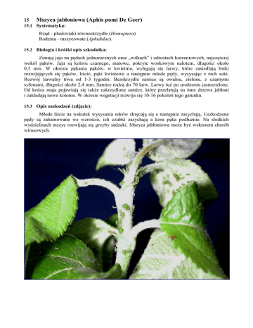 15 Mszyca jabłoniowa (Aphis pomi De Geer) 15.1 Systematyka: Rząd - pluskwiaki równoskrzydłe (Homoptera) Rodzina - mszycowate (Aphididae). 15.2 Biologia i krótki opis szkodnika: Zimują jaja na pędach jednorocznych oraz „wilkach” i odrostach korzeniowych, najczęściej wokół pąków. Jaja są koloru czarnego, matowe, pokryte woskowym nalotem, długości około 0,5 mm. W okresie pękania pąków, w kwietniu, wylęgają się larwy, które zasiedlają listki rozwijających się pąków, liście, pąki kwiatowe a następnie młode pędy, wysysając z nich soki. Rozwój larwalny trwa od 1-3 tygodni. Bezskrzydłe samice są owalne, zielone, z czarnymi syfonami, długości około 2,4 mm. Samice rodzą do 70 larw. Larwy tuż po urodzeniu jasnozielone. Od końca maja pojawiają się także uskrzydlone samice, które przelatują na inne drzewa jabłoni i zakładają nowe kolonie. W okresie wegetacji rozwija się 10-16 pokoleń tego gatunku. 15.3 Opis uszkodzeń (zdjęcie): Młode liście na wskutek wysysania soków skręcają się a następnie zasychają. Uszkodzone pędy są zahamowane we wzroście, ich czubki zasychają a kora pęka podłużnie. Na słodkich wydzielinach mszyc rozwijają się grzyby sadzaki. Mszyca jabłoniowa może być wektorem chorób wirusowych. 15.4 Metodyka wykonania obserwacji: W okresie ukazywania się pierwszych liści (skala BBCH 10) przejrzeć z 10 losowo wybranych drzew po 20 pąków (razem 200). Po kwitnieniu i dalej co 2 tygodnie do końca lipca (skala BBCH 69-76) obejrzeć na 50 losowo wybranych drzewach po 3 długopędy (razem 150). 15.5 Progi szkodliwości i terminy zabiegów: Jako próg zagrożenia w okresie ukazywania się pierwszych liści (skala BBCH 10) przyjęto 10 pąków zasiedlonych przez mszyce (w próbie 200), natomiast w okresie późniejszym (skala BBCH 69-76) 15 pędów z koloniami mszyc w próbie 150 pędów. Zabieg zwalczający wykonuje się po przekroczeniu progu szkodliwości w danym terminie obserwacji.