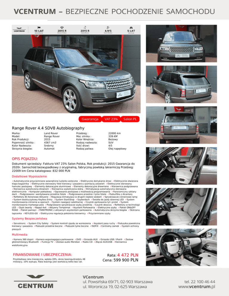 Range Rover 4.4 SDV8 Autobiography Marka: Model: Rok Produkcji: Pojemność silnika : Kolor Nadwozia: Skrzynia biegów: Land Rover Range Rover 2015 4367 cm3 Srebrny Automat Przebieg : Moc silnika : Kolor Wnętrza: Rodzaj nadwozia: Ilość drzwi: Rodzaj paliwa: 22000 km 339 KM Beżowy SUV 4/5 Olej napędowy OPIS POJAZDU: Dokument sprzedaży: Faktura VAT 23% Salon Polska, Rok produkcji: 2015 Gwarancja do 2020r. Samochód bezwypadkowy z oryginalną, fabryczną powłoką lakierniczą Przebieg: 22009 km Cena katalogowa: 832 000 PLN Dodatkowe Wyposażenie ✓Automatycznie przyciemniane wewnętrzne lusterko wsteczne ✓Elektryczne domykanie drzwi ✓Elektrycznie otwierana klapa bagażnika ✓Elektrycznie sterowany fotel kierowcy i pasażera z pamięcią ustawień ✓Elektrycznie sterowany hamulec postojowy ✓Elementy dekoracyjne aluminiowe ✓Elementy dekoracyjne drewniane ✓Kierownica podgrzewana ✓Kierownica wykończona drewnem ✓Kierownica wykończona skórą ✓Klimatyzacja automatyczna sterowana elektronicznie ✓Komputer pokładowy ✓Ogrzewanie postojowe z możliwością programowania ✓Panoramiczny szklany dach ✓Podgrzewane i wentylowane przednie fotele ✓Podgrzewane przednie i tylne fotele ✓Podsufitka z Alcantary ✓Reflektory Bi-Xenonowe Aktywne ✓Regulacja klimatyzacji w drugim rzędzie siedzeń ✓Spryskiwacze ciśnieniowe lamp ✓System bezkluczykowy Keyless Entry ✓System Start/Stop ✓Szyberdach ✓Światła do jazdy dziennej LED ✓System monitorowania ciśnienia w oponach ✓System nawigacji satelitarnej ✓Czujniki parkowania tył i przód ✓System monitorowania martwego pola ✓Podgrzewane spryskiwacze szyby przedniej ✓Czujnik deszczu ✓Reflektory w technologii LED ✓Dysk twardy ✓Napęd 4x4 ✓Aktywny Tempomat ✓Asystent Parkowania ✓Elektryczne szyby ✓Pakiet ON&OFF ROAD ✓Pakiet pamięci ✓PARKTRONIC z aktywnym asystentem parkowania ✓Automatyczna skrzynia biegów ✓Skórzana tapicerka ✓KEYLESS-GO ✓Elektryczna regulacja położenia kierownicy ✓Przyciemniane szyby Systemy Bezpieczeństwa ✓Servotronic ✓System City Safety ✓System kontroli zjazdu ze wzniesienia ✓Asystent pasa ruchy ✓Poduszka powietrzna kierowcy i pasażera ✓Poduszki przednie boczne ✓Poduszki tylne boczne ✓ISOFIX ✓Centralny zamek ✓System ochrony pieszych Multimedia ✓Kamera 360 stopni ✓Kamera wspomagająca parkowanie ✓DVD ✓Gniazdo AUX ✓Gniazdo USB / iPod® ✓Zestaw głośnomówiący Bluetooth ✓Funkcja TV ✓Zestaw audio Meridian ✓Radio CD ✓Złącze AUX/USB ✓Kierownica wielofunkcyjna FINANSOWANIE I UBEZPIECZENIA: Przykładowa rata miesięczna, wpłata 20%, okres leasingu/kredytu 48 miesięcy, 10% wykupu. Rata leasingu jest wartością netto bez vat. Rata: 4 472 Cena: 599 900 PLN PLN Niniejsza treść nie stanowi oferty w rozumieniu przepisów Kodeksu Cywilnego oraz opisu towaru ani zapewnienia w rozumieniu art. 4 Ustawy z dnia 27 lipca 2002r o szczególnych warunkach sprzedaży konsumenckiej. Powered by TCPDF (www.tcpdf.org)