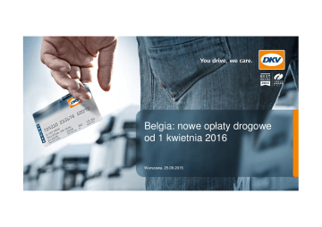 Belgia: nowe opłaty drogowe od 1 kwietnia 2016 Warszawa, 25.09.2015 Marketing | Page 2 Elektroniczne myto Viapass/Satellic » 1 kwietnia 2016 r. rusza w Belgii elektroniczny system opłat drogowych » System Viapass zastąpi obowiązującą obecnie w Belgii eurowinietę » Obowiązkiem opłaty będą objęte pojazdy od 3,5 tony DMC » DKV oferuje rozliczanie belgijskich opłat drogowych jako jeden z pierwszych emitentów kart paliwowo-serwisowych Marketing | Page 3 Gdzie pobierane będą opłaty? »Nowe opłaty obejmą sieć dróg podlegających dziś eurowiniecie oraz pozostałe autostrady, obwodnice i ważne drogi krajowe » Opłaty będą obowiązywały w regionach: » Flandrii » Walonii » i stołecznej Brukseli Marketing | Page 4 Gdzie Nowe opłaty obejmą sieć dróg podlegających dziś Eurowiniecie, czyli autostrady i drogi krajowe we Flandrii, Walonii i w regionie Brukseli. Plus autostrady, obwodnice i ważne dorgi główne Marketing | Page 5 Stawki opłat » Wysokość opłat będzie zależeć od: » odległości przejechanego odcinka » DMC pojazdu » normy EURO » kategorii dróg Marketing | Page 6 Urządzenie pokładowe » Opłaty będą naliczane przy użyciu urządzenia pokładowego Satellic » Depozyt (zwrotny) za wypożyczenie urządzenia Satellic wyniesie 135 euro. Koszt wysyłki poniesie firma Satellic NV/SA. » Urządzenie zasilane będzie przez gniazdo zapalniczki lub poprzez bezpośrednie podłączenie do instalacji elektrycznej pojazdu » Urządzenie działa w technologii satelitarnej Marketing | Page 7 Metody rozliczeń » Opłaty będzie można rozliczać zarówno w trybie: » pre-paid » post-paid » DKV Card będzie akceptowana w obydwu przypadkach. VAT » We Flandrii i w regionie Brukseli opłaty drogowe nie podlegają podatkowi VAT » W Walonii do ceny przejazdu zostanie doliczony podatek VAT, ponieważ drogi te są zarządzane przez organizację Sofico Marketing | Page 8 Rejestracja poprzez DKV » Rejestracja do systemu Viapass/Satelic rusza od 1 października 2015 » Na stronie: www.dkv-euroservice.com/toll-belgium wpisz swoje dane i załaduj kopie wymaganych dokumentów: • dowody rejestracyjne pojazdów • normy Euro » DKV sprawdzi dokumenty i zakończy proces rejestracji zamawiając urządzenia u operatora Satellic NV Marketing | Page 9 Zalety rozliczeń z DKV » Wszystkie opłaty drogowe u jednego operatora » Szybka i łatwa rejestracja online » Wysoka jakość obsługi » Jedna przejrzysta faktura Pytania?