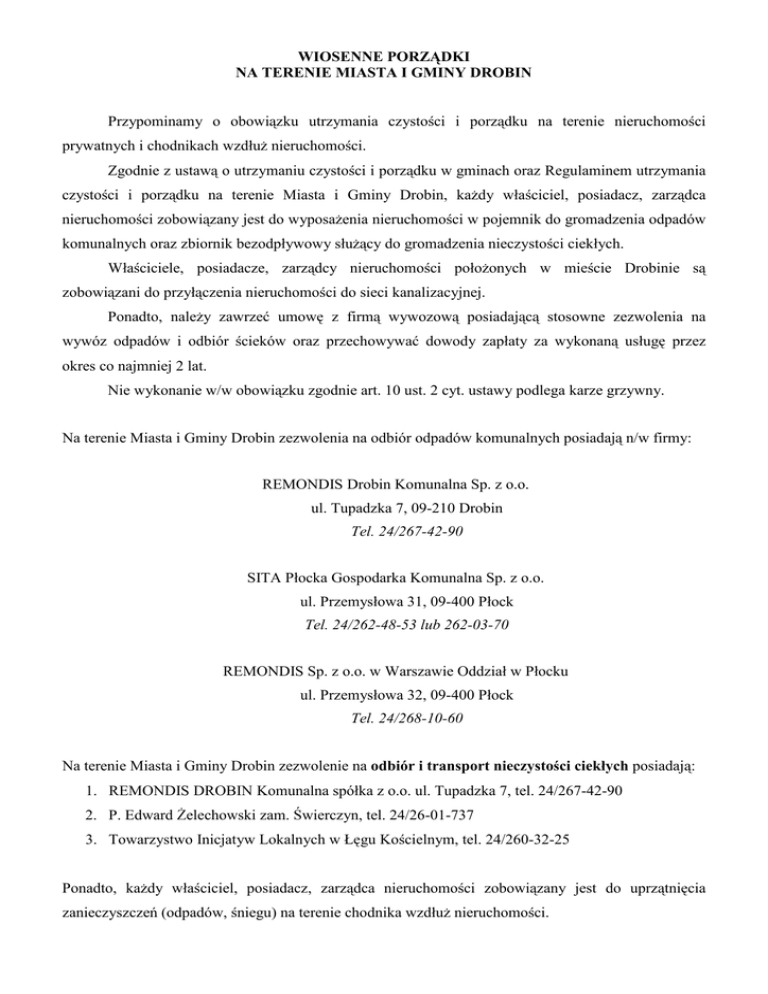 WIOSENNE PORZĄDKI NA TERENIE MIASTA I GMINY DROBIN Przypominamy o obowiązku utrzymania czystości i porządku na terenie nieruchomości prywatnych i chodnikach wzdłuż nieruchomości. Zgodnie z ustawą o utrzymaniu czystości i porządku w gminach oraz Regulaminem utrzymania czystości i porządku na terenie Miasta i Gminy Drobin, każdy właściciel, posiadacz, zarządca nieruchomości zobowiązany jest do wyposażenia nieruchomości w pojemnik do gromadzenia odpadów komunalnych oraz zbiornik bezodpływowy służący do gromadzenia nieczystości ciekłych. Właściciele, posiadacze, zarządcy nieruchomości położonych w mieście Drobinie są zobowiązani do przyłączenia nieruchomości do sieci kanalizacyjnej. Ponadto, należy zawrzeć umowę z firmą wywozową posiadającą stosowne zezwolenia na wywóz odpadów i odbiór ścieków oraz przechowywać dowody zapłaty za wykonaną usługę przez okres co najmniej 2 lat. Nie wykonanie w/w obowiązku zgodnie art. 10 ust. 2 cyt. ustawy podlega karze grzywny. Na terenie Miasta i Gminy Drobin zezwolenia na odbiór odpadów komunalnych posiadają n/w firmy: REMONDIS Drobin Komunalna Sp. z o.o. ul. Tupadzka 7, 09-210 Drobin Tel. 24/267-42-90 SITA Płocka Gospodarka Komunalna Sp. z o.o. ul. Przemysłowa 31, 09-400 Płock Tel. 24/262-48-53 lub 262-03-70 REMONDIS Sp. z o.o. w Warszawie Oddział w Płocku ul. Przemysłowa 32, 09-400 Płock Tel. 24/268-10-60 Na terenie Miasta i Gminy Drobin zezwolenie na odbiór i transport nieczystości ciekłych posiadają: 1. REMONDIS DROBIN Komunalna spółka z o.o. ul. Tupadzka 7, tel. 24/267-42-90 2. P. Edward Żelechowski zam. Świerczyn, tel. 24/26-01-737 3. Towarzystwo Inicjatyw Lokalnych w Łęgu Kościelnym, tel. 24/260-32-25 Ponadto, każdy właściciel, posiadacz, zarządca nieruchomości zobowiązany jest do uprzątnięcia zanieczyszczeń (odpadów, śniegu) na terenie chodnika wzdłuż nieruchomości.
