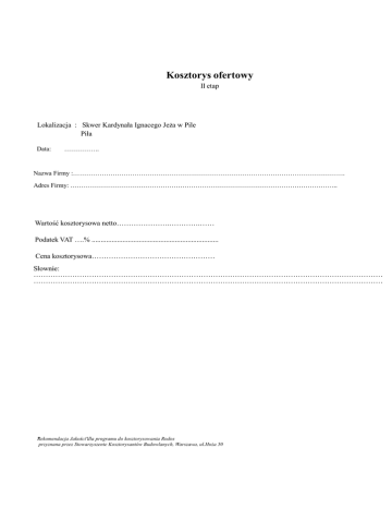 Kosztorys ofertowy II etap Lokalizacja : Skwer Kardynała Ignacego Jeża w Pile Piła Data: ……………. Nazwa Firmy :……………………………………………………………………………………………………………. Adres Firmy: ………………………………………………………………………………………………………….. Wartość kosztorysowa netto………………….………….…… Podatek VAT ….% ...................................................................... Cena kosztorysowa…………………………………………… Słownie: ……………………………………………………………………………………………………………………………… ……………………………………………………………………………………………………………………………… "Rekomendacja Jakości"dla programu do kosztorysowania Rodos przyznana przez Stowarzyszenie Kosztorysantów Budowlanych, Warszawa, ul.Hoża 50 Rodos 7.0.6.2 [10583] Strona 2 Przedmiar Nr Podstawa Opis robót Jm Ilość 1. Etap II - Tereny zieleni Przygotowanie warstwy ziemi pod obsadzenia (min. Hydrożel), przekopanie glebogryzarką 1 KNR 2-21 0410/01.1 2 KNR 2-21 0301/07.1 Sadzenie drzew liściastych na terenie płaskim w gruncie kat.I- II z całkowitą zaprawą dołów o średnicy i głębokości 0,7x0,7m 3 KNR 2-21 0708/02 analogia Zabezpieczenie drzew - Montaż palików stabilizujących drzewo (połączone poprzeczkami) i montaż taśm (1 drzewo = 3 paliki, śr. min. 5cm) 4 KNR 2-21 0301/03 Sadzenie krzewów iglastych na terenie płaskim w gruncie kat.I- II z całkowitą zaprawą dołów o średnicy i głębokości 0,3x0,3m 5 KNR 2-21 0322/03 Sadzenie krzewów iglastych na terenie pochyłym w gruncie kat.I- II z całkowitą zaprawą dołów o średnicy i głębokości 0,4x0,3m 6 KNR 2-21 0301/03 Sadzenie krzewów liściastych na terenie płaskim w gruncie kat.I- II z całkowitą zaprawą dołów o średnicy i głębokości 0,4x0,3m 7 KNR 2-21 0413/01 Sadzenie bylin na terenie płaskim w gruncie kat.I- II z całkowitą zaprawą dołów o średnicy i głębokości 0,4x0,3m 8 KNR 9-11 0101/02.2 Warstwa technologiczna z agrowłókniny 50 g/m mocowane szpilkami co 1,5 m (o zakładce 15cm) 9 KNR 2-31 0106/01 analogia Rozścielenie warstwy kolorowego żwiru (frakcja 8-16mm) grubość warstwy 4-5cm 10 KNR 2-21 0218/02 analogia Rozsypanie kory (gr 5-8cm) frakcja 2-6cm 11 KNR 2-21 0607/01 Montaż ławek parkowych wymiary: wys. 80 cm / szer. 52 cm / dł. 230 cm / waga ok. 200 kg, (kształt ławki fot. 1) beton odlewniczy malowany: szary, stal ocynkowana lakierowana proszkowo: szary RAL 9007, drewno iglaste: teak 12 KNNR 2 1301/01 Montaż poręczy fi4,2cm ze stali nierdzewnej szczotkowanej z 30 słupkami fi4,2cm m2 430,000 szt 12,000 szt 12,000 szt 83,000 szt 68,000 szt 907,000 m2 72,000 m2 510,000 m2 310,000 m2 200,000 m 7,000 m 39,600 13 kalk. własna Montaż stojaków rowerowych rura stalowa 60mm: kolor 9006 - szary stalowy, wysokość od powierzchni ziemi 83cm, wysokość z odcinkiem kotwiącym 123cm, długość 66cm, (kształt stojaka fot. 3) szt 3,000 14 kalk. własna Montaż koszy, wysokość 75cm. średnica 56cm, beton odlewniczy malowany: szary (kształt kosza fot. 2) szt 4,000 16 2. Materiał roślinny Preliminarz Materiał roślinny -klon pospolity Crimson Sentry' kosztów szt 8,000 szt 4,000 szt 91,000 szt 25,000 szt 35,000 szt 340,000 szt 36,000 17 Preliminarz Materiał roślinny - Dąb szypułkowy kosztów 18 Preliminarz Materiał roślinny - Jałowiec sabiński 'Tamariscifolia' kosztów 19 Preliminarz Materiał roślinny - Cis pospolity 'Fastigiata' kosztów 20 Preliminarz Materiał roślinny - Żywotnik zachodni 'Hoseri' kosztów 21 Preliminarz Materiał roślinny - Irga karłowata kosztów 22 Preliminarz Materiał roślinny - Trzmielina Fortune'a 'Emerald Gold' kosztów Cena Rodos 7.0.6.2 [10583] Strona 3 Przedmiar Nr 23 Podstawa Opis robót Preliminarz Materiał roślinny - Lilak Meyera 'Palibin' kosztów 24 Preliminarz Materiał roślinny - Tawuła gęstokwiatowa kosztów 25 Preliminarz Materiał roślinny - Tawuła japońska 'Anthony Waterer' kosztów 26 Preliminarz Materiał roślinny - Jeżówka purpurowa kosztów 27 Preliminarz Materiał roślinny - Liliowiec 'Stella de Oro' kosztów 28 kalk.własna Wykonanie inwentaryzacji powykonawczej Jm Iloś ć Cena szt 48,0 00 szt 196,0 00 szt 287,0 00 szt 36,0 00 szt szt. 36,0 00 1.000 Rodos 7.0.6.2 [10583] Przedmiar Strona 4