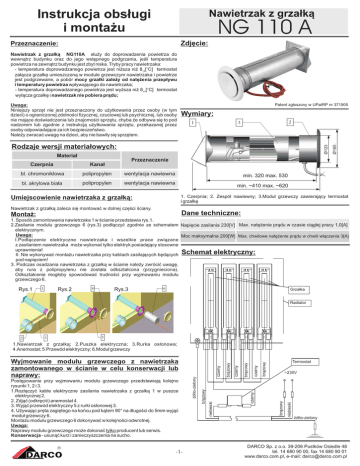 Instrukcja obs³ugi i monta¿u Nawietrzak z grza³k¹ NG 110 A Zdjêcie: Przeznaczenie: Nawietrzak z grza³k¹ NG110A s³u¿y do doprowadzenia powietrza do wewn¹trz budynku oraz do jego wstêpnego podgrzania, jeœli temperatura powietrza na zewn¹trz budynku jest zbyt niska. Tryby pracy nawietrzaka: - temperatura doprowadzanego powietrza jest ni¿sza ni¿ 8+4[°C] termostat za³¹cza grza³kê umieszczon¹ w module grzewczym nawietrzaka i powietrze jest podgrzewane, a pobór mocy grza³ki zale¿y od natê¿enia przep³ywu i temperatury powietrza wp³ywaj¹cego do nawietrzaka; - temperatura doprowadzanego powietrza jest wy¿sza ni¿ 8+4[°C] termostat wy³¹cza grza³kê i nawietrzak nie pobiera pr¹du; Patent zg³oszony w UPatRP nr 371905 Wymiary: 1 2 3 Ø123 78 Rodzaje wersji materia³owych: Materia³ 114 Ø165 Uwaga: Niniejszy sprzêt nie jest przeznaczony do u¿ytkowania przez osoby (w tym dzieci) o ograniczonej zdolnoœci fizycznej, czuciowej lub psychicznej, lub osoby nie maj¹ce doœwiadczenia lub znajomoœci sprzêtu, chyba ¿e odbywa siê to pod nadzorem lub zgodnie z instrukcj¹ u¿ytkowania sprzêtu, przekazanej przez osoby odpowiadaj¹ce za ich bezpieczeñstwo. Nale¿y zwracaæ uwagê na dzieci, aby nie bawi³y siê sprzêtem. Przeznaczenie Czerpnia Kana³ bl. chromoniklowa polipropylen wentylacja nawiewna bl. akrylowa bia³a polipropylen wentylacja nawiewna min. 320max.550 max. 530 Min.300 min. ~410 max. 381 Min ~362 max. ~612 631~620 1. Czerpnia; 2. Zespó³ nawiewny; 3.Modu³ grzewczy zawieraj¹cy termostat i grza³kê Umiejscowienie nawietrzaka z grza³k¹: Nawietrzak z grza³k¹ zaleca siê montowaæ w dolnej czêœci œciany. Dane techniczne: Monta¿: 1. Sposób zamontowania nawietrzaka 1 w œcianie przedstawia rys.1. 2.Zasilanie modu³u grzewczego 6 (rys.3) pod³¹czyæ zgodnie ze schematem Napiêcie zasilania 230[V] Max. natê¿enie pr¹du w czasie ci¹g³ej pracy 1,0[A] elektrycznym. Uwaga: Moc maksymalna 200[W] Max. chwilowe natê¿enie pr¹du w chwili w³¹czenia 3[A] I.Pod³¹czenie elektryczne nawietrzaka i wszelkie prace zwi¹zane z zasilaniem nawietrzaka mo¿e wykonaæ tylko elektryk posiadaj¹cy stosowne uprawnienia! II. Nie wykonywaæ monta¿u nawietrzaka przy kablach zasilaj¹cych bêd¹cych Schemat elektryczny: pod napiêciem! 3. Podczas osadzania nawietrzaka z grza³k¹ w œcianie nale¿y zwróciæ uwagê, aby rura z polipropylenu nie zosta³a odkszta³cona (przygnieciona). Odkszta³cenie mog³oby spowodowaæ trudnoœci przy wyjmowaniu modu³u grzewczego 6. Rys.1 Rys.1 1 Rys.2 Rys.2 4 Rys.3 Rys.3 6 Grza³ka Radiator 2 3 5 -1- Termostat br¹zowy niebieski ~230V br¹zowy czarny br¹zowy czarny czarny br¹zowy czarny br¹zowy Postêpowanie przy wyjmowaniu modu³u grzewczego przedstawiaj¹ kolejno rysunki 1, 2 i 3. 1.Roz³¹czyæ kable elektryczne zasilania nawietrzaka z grza³k¹ 1 w puszce elektrycznej 2. 2. Zdj¹æ (odkrêciæ) anemostat 4. 3. Wyj¹æ przewód elektryczny 5 z rurki os³onowej 3. 4. U¿ywaj¹c prêta zagiêtego na koñcu pod k¹tem 90° na d³ugoœci do 5mm wyj¹æ modu³ grzewczy 6. Monta¿u modu³u grzewczego 6 dokonywaæ w kolejnoœci odwrotnej. Uwaga: Naprawy modu³u grzewczego mo¿e dokonaæ tylko producent lub serwis. Konserwacja - usun¹æ kurz i zanieczyszczenia na sucho. niebieski Wyjmowanie modu³u grzewczego z nawietrzaka zamontowanego w œcianie w celu konserwacji lub naprawy: ¿ó³to-zielony 1.Nawietrzak z grza³k¹; 2.Puszka elektryczna; 3.Rurka os³onowa; 4.Anemostat; 5.Przewód elektryczny; 6.Modu³ grzewczy ¿ó³to-zielony DARCO Sp. z o.o. 39-206 Pustków Osiedle 48 tel. 14 680 90 00, fax 14 680 90 01 www.darco.com.pl, e-mail: [email protected] Nawietrzak z grza³k¹ Instrukcja obs³ugi i monta¿u NG 110A Charakterystyki przep³ywu: Wykres poboru mocy nawietrzaka N110A z grza³k¹ Grza³ka wy³¹czona Grza³ka w³¹czona 220 40 200 30 3 za ietr 20 pow p³yw = 15 [m /h] e Prz 3 10 a = 76 [m h] / z tr ie w 0 w po y p³ ze Pr -10 -20 -30 Moc pobierana przez grza³kê [W] 50 180 Pr ze p³ yw -10 0 po w 160 ie trz a 10 20 [m 3 /h ] Prz 120 ep³y wp ow ietr za 100 Temperatura powietrza na wlocie do nawietrzaka [°C] =7 6 140 0 -20 Grza³ka wy³¹czona Temp. wy³¹czenia grza³ki Grza³ka w³¹czona Temperatura wy³¹czenia grza³ki Temperatura powietrza na wylocie z nawietrzaka [°C] Wykres temperatury nawietrzaka NG110A z grza³k¹ -30 -20 -10 = 15 [m 3 /h] 0 10 20 Temperatura powietrza na wlocie do nawietrzaka [ºC] Wykres przedstawia zale¿noœæ temperatury powietrza na wylocie od Wykres przedstawia zale¿noœæ poboru mocy przez grza³kê od temperatury powietrza na wlocie do nawietrzaka, dla dwóch wartoœci temperatury na wlocie nawietrzaka, dla dwóch wielkoœci przep³ywu przep³ywu 15 i 76 [m³/h]. powietrza 15 i 76 [m³/h]. Przy temperaturze ~8 [°C] grza³ka wy³¹cza siê. KARTA GWARANCYJNA DARCO Sp. z o.o. udziela gwarancji bezawaryjnej pracy nawietrzaka z grza³k¹ NG 110 A zgodnie z warunkami techniczno-ekspolatacyjnymi opisanymi w instrukcji obs³ugi. Warunki gwarancji: 1. Okres gwarancji wynosi 24 miesi¹ce od daty zakupu towaru przez 5. Warunkiem realizacji przez Konsumenta uprawnieñ wynikaj¹cych z niniejszej u¿ytkownika (data musi byæ zgodna z dat¹ wystawienia dowodu zakupu). gwarancji jest dostarczenie wadliwego produktu bezpoœrednio do punktu 2. Gwarancja zapewnia bezp³atne usuniêcie usterek spowodowanych sprzeda¿y oraz przedstawienie: wadliwymi czêœciami i/lub defektami produkcyjnymi, co mo¿e byæ a) poprawnie wype³nionej karty gwarancyjnej, stwierdzone na podstawie oglêdzin dokonywanych przez sprzedawcê. b) dowodu zakupu towaru. 3. Gwarancja wygasa i producent nie ponosi odpowiedzialnoœci za usterki Sprzedawca i konsument musz¹ dopilnowaæ, aby karta gwarancyjna by³a poprawnie wype³niona w szczególnoœci aby by³y zawarte co najmniej: imiê i powsta³e z nastêpuj¹cych przyczyn: a) uszkodzeñ mechanicznych wynikaj¹cych z niew³aœciwego transportu i nazwisko lub nazwa Konsumenta, jeg