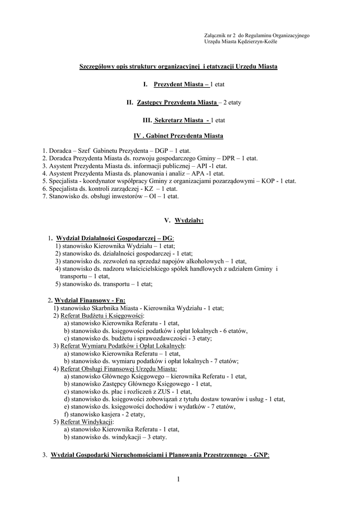 Załącznik nr 2 do Regulaminu Organizacyjnego Urzędu Miasta Kędzierzyn-Koźle Szczegółowy opis struktury organizacyjnej i etatyzacji Urzędu Miasta I. Prezydent Miasta – 1 etat II. Zastępcy Prezydenta Miasta – 2 etaty III. Sekretarz Miasta - 1 etat IV . Gabinet Prezydenta Miasta 1. Doradca – Szef Gabinetu Prezydenta – DGP – 1 etat. 2. Doradca Prezydenta Miasta ds. rozwoju gospodarczego Gminy – DPR – 1 etat. 3. Asystent Prezydenta Miasta ds. informacji publicznej – API -1 etat. 4. Asystent Prezydenta Miasta ds. planowania i analiz – APA -1 etat. 5. Specjalista - koordynator współpracy Gminy z organizacjami pozarządowymi – KOP - 1 etat. 6. Specjalista ds. kontroli zarządczej - KZ – 1 etat. 7. Stanowisko ds. obsługi inwestorów – OI – 1 etat. V. Wydziały: 1. Wydział Działalności Gospodarczej – DG: 1) stanowisko Kierownika Wydziału – 1 etat; 2) stanowisko ds. działalności gospodarczej - 1 etat; 3) stanowisko ds. zezwoleń na sprzedaż napojów alkoholowych – 1 etat, 4) stanowisko ds. nadzoru właścicielskiego spółek handlowych z udziałem Gminy i transportu – 1 etat, 5) stanowisko ds. transportu – 1 etat; 2. Wydział Finansowy - Fn: 1) stanowisko Skarbnika Miasta - Kierownika Wydziału - 1 etat; 2) Referat Budżetu i Księgowości: a) stanowisko Kierownika Referatu - 1 etat, b) stanowisko ds. księgowości podatków i opłat lokalnych - 6 etatów, c) stanowisko ds. budżetu i sprawozdawczości - 3 etaty; 3) Referat Wymiaru Podatków i Opłat Lokalnych: a) stanowisko Kierownika Referatu – 1 etat, b) stanowisko ds. wymiaru podatków i opłat lokalnych - 7 etatów; 4) Referat Obsługi Finansowej Urzędu Miasta: a) stanowisko Głównego Księgowego – kierownika Referatu - 1 etat, b) stanowisko Zastępcy Głównego Księgowego - 1 etat, c) stanowisko ds. płac i rozliczeń z ZUS - 1 etat, d) stanowisko ds. księgowości zobowiązań z tytułu dostaw towarów i usług - 1 etat, e) stanowisko ds. księgowości dochodów i wydatków - 7 etatów, f) stanowisko kasjera - 2 etaty, 5) Referat Windykacji: a) stanowisko Kierownika Referatu - 1 etat, b) stanowisko ds. windykacji – 3 etaty. 3. Wydział Gospodarki Nieruchomościami i Planowania Przestrzennego - GNP: 1 1) stanowisko Kierownika Wydziału – 1 etat; 2) Referat Gospodarki Nieruchomościami: a) stanowisko Kierownika Referatu Gospodarki Nieruchomościami połączone ze stanowiskiem ds. sprzedaży lokali mieszkalnych -1 etat, b)stanowisko ds. lokali użytkowych, budynków oraz wolnych lokali mieszkalnych – 1 etat, b) stanowisko ds. sprzedaży lokali mieszkalnych – 3 etaty; c) stanowisko ds. zbywania gruntów niezabudowanych oraz pierwokupu –1 etat, d) stanowisko ds. komunalizacji oraz dzierżawy gruntów pod działalność gospodarczą – 1 etat, e) stanowisko ds. dzierżaw i udostępniania gruntów – 1 etat; f) stanowisko ds. podziału gruntów oraz ogrodów działkowych– 1 etat; g) stanowisko ds. przekształcenia prawa użytkowania wieczystego w prawo własności oraz opłat z tytułu użytkowania wieczystego – 1 etat; h) stanowisko ds. trwałych zarządów, infrastrukturalnych opłat adiacenckich oraz obsługi sekretariatu – 2 etaty; i) stanowisko ds. nabywania nieruchomości od osób fizycznych oraz nabywania i zbywania nieruchomości na rzecz publicznych osób prawnych - 1 etat, j) stanowisko ds. zamówień publicznych, ewidencji i zasobu nieruchomości oraz nazewnictwa ulic i numeracji porządkowej nieruchomości – 1 etat; 3) Referat Planowania Przestrzennego i Ochrony Zabytków: a) stanowisko kierownika Referatu połączone ze stanowiskiem Zastępcy Kierownika Wydziału – 1 etat; b) stanowisko ds. opiniowania zgodności z Miejscowym Planem Zagospodarowania Przestrzennego oraz inwentaryzacji mienia komunalnego – 1 etat b) stanowisko ds. administracyjno-prawnych i ochrony zabytków– 1 etat; c) stanowisko ds. opiniowania zgodności z Miejscowym Planem Zagospodarowania Przestrzennego działań z zakresu gospodarki nieruchomościami– 1 etat; d) stanowisko ds. planowania i zagospodarowania przestrzennego – 3 etaty. 4. Wydział Inżynierii Miejskiej – IM 1) stanowisko Kierownika Wydziału - 1 etat; 2) Referat inwestycji i remontów (podległy bezpośrednio kierownikowi wydziału) a) stanowisko ds. obsługi zadań inwestycyjnych i remontowych - 1 etat, b) stanowisko ds. przygotowania dokumentacji i współpracy w zakresie zamówień publicznych - 2 etaty; c) stanowisko ds. sprawozdawczości - 1 etat; d) stanowisko inspektora nadzoru inwestorskiego - 5 etatów, 3) Referat infrastruktury technicznej a) stanowisko kierownika referatu połączone ze stanowiskiem Zastępcy Kierownika Wydziału ds. utrzymania obiektów technicznych - 1 etat ; b) stanowisko ds. rozwoju infrastruktury komunalnej - 1 etat; c) stanowisko ds. utrzymania czystości i porządku - 1 etat; d) stanowisko ds. robót publicznych – 1 etat; 5. Wydział Ochrony Środowiska i Rolnictwa - OSR 1) stanowisko Kierownika Wydziału - 1 etat; 2) stanowisko ds. ochrony powietrza i finansowania ochrony środowiska - 1 etat; 2 3) stanowisko ds. analiz, ocen i planowania ochrony środowiska - 1 etat; 4) stanowisko ds. zieleni i ochrony przyrody - 1 etat; 5) stanowisko ds. gospodarki odpadami, połączone ze stanowiskiem Zastępcy Kierownika Wydziału - 1 etat; 6) stanowisko ds. gospodarki wodnej, geologii i edukacji ekologicznej- 1 etat 7) stanowisko ds. rolnictwa i ochrony zwierząt - 1 etat; 6. Wydział Organizacyjny – Or : 1) stanowisko Kierownika Wydziału – 1 etat; 2) stanowiska: a) ds. rejestracji upoważnień i pełnomocnictw, porozumień publicznoprawnych i sprawozdawczości – 1 etat, b) ds. systemu zarządzania jakością oraz skarg i wniosków – 1 etat, c) ds. obsługi posiedzeń oraz ds. rejestracji aktów prawnych Prezydenta Miasta – 1 etat, d) ds. pracowniczych – 2 etaty, e) ds. obsługi prawno – administracyjnej – 1 etat, f) sekretarki radców prawnych – 1 etat ; 3) Referat